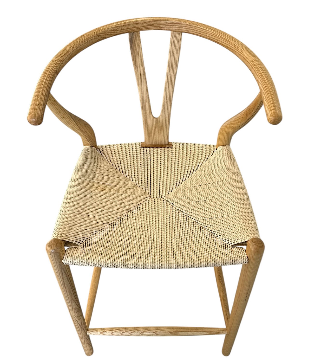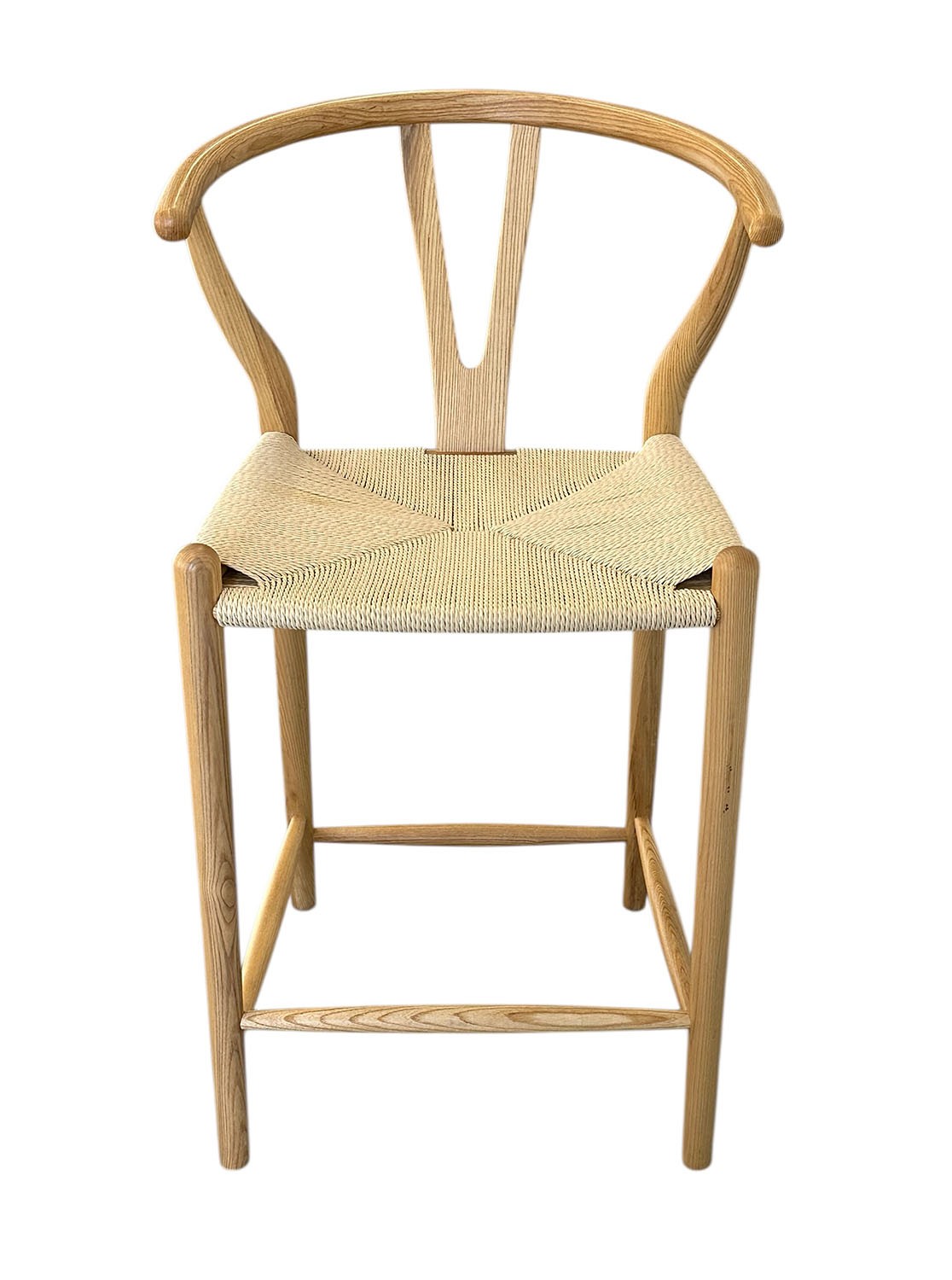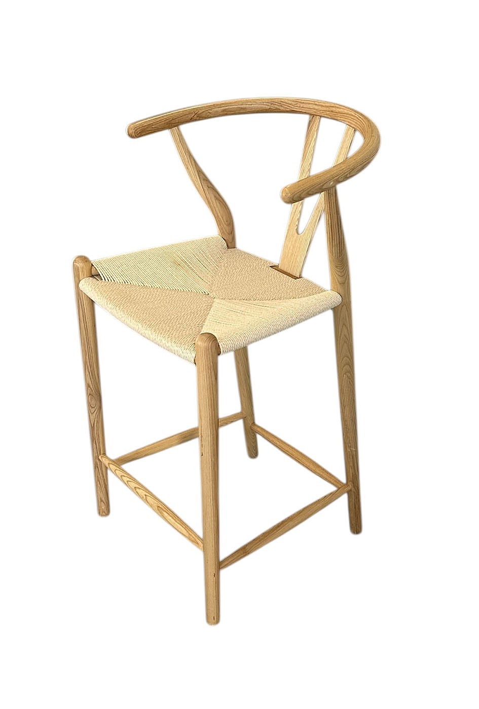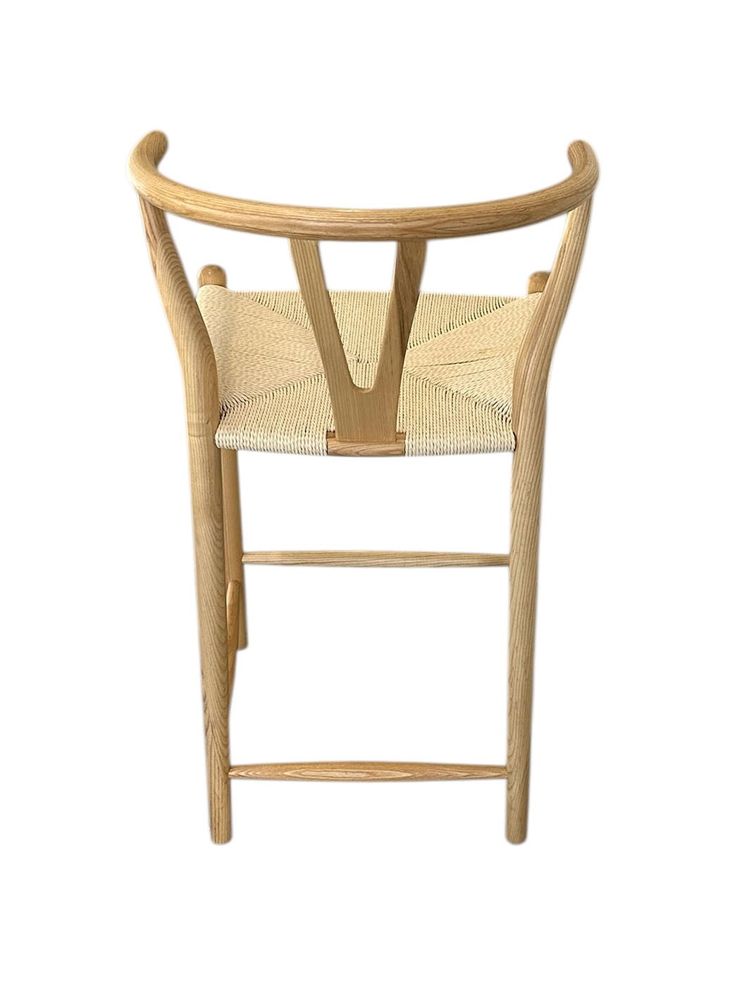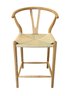 Wishbone Counter Stool. In natural wood and cord. In very good condition with a small area of staining on the seat. 21" x 22" x 37"h, 25" seat height