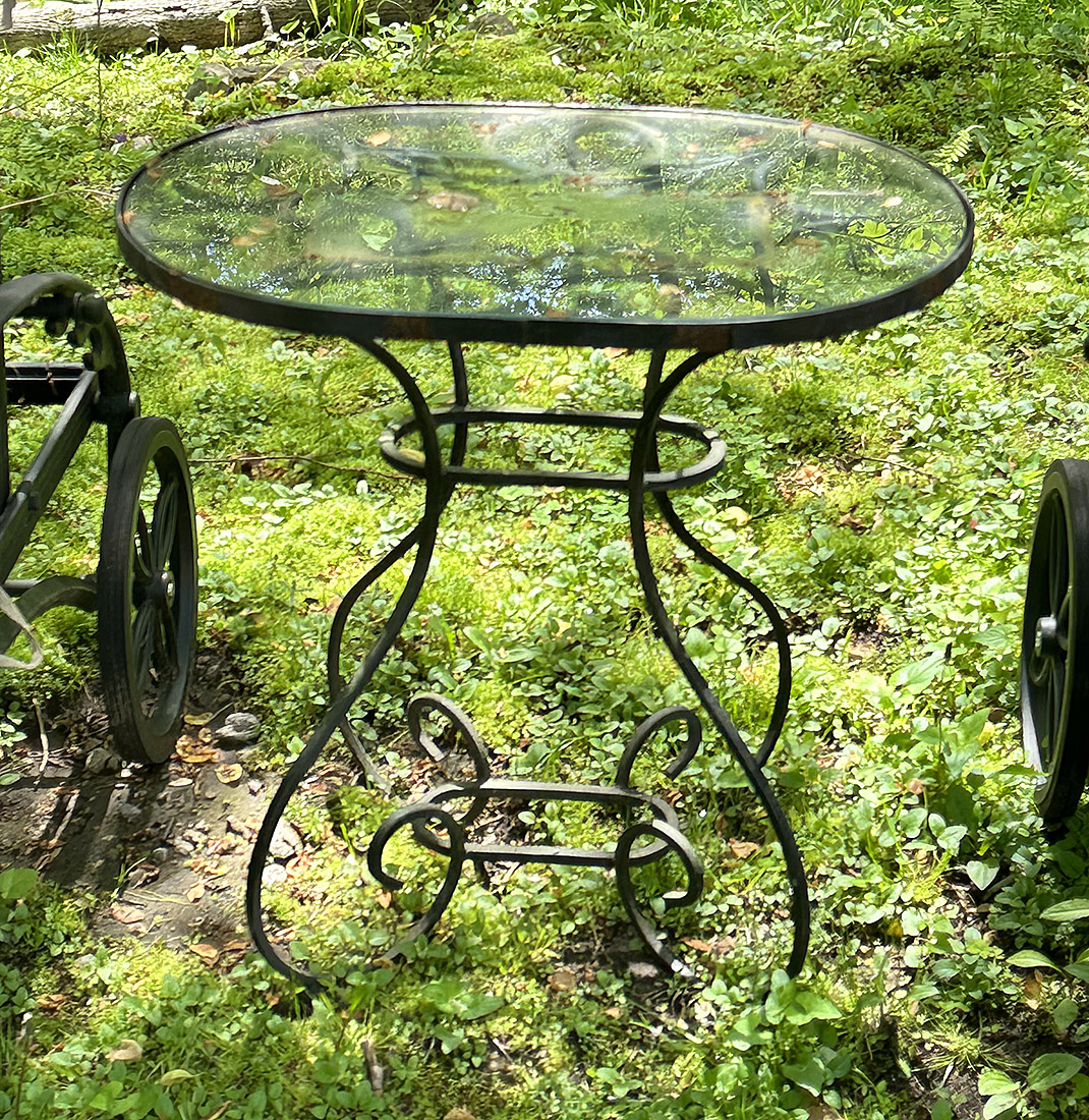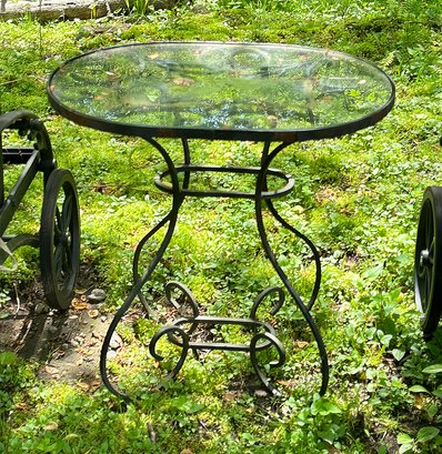 Wrought Iron And Glass Outdoor Side Table. In good condition. 24" x 17" x 24"h.