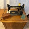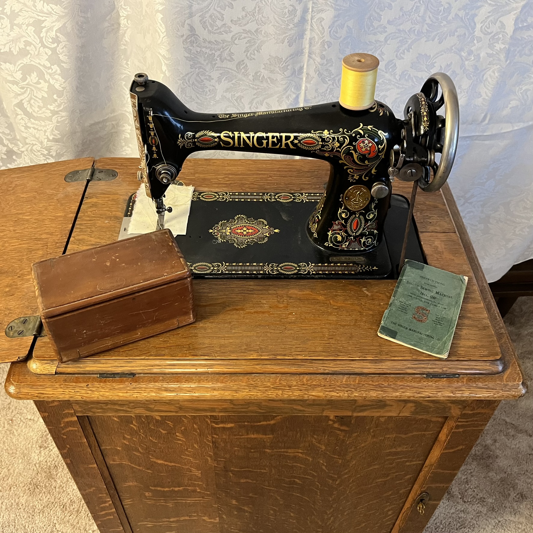 Model# G9902056. Antique 1911 SINGER Class 66 Red-Eye Sewing machine in oak cabinet with swing door storage and hinged lid. Beautiful condition - belt in tact and works smooth. Cabinet when closed Approx 30" high x 23" wide