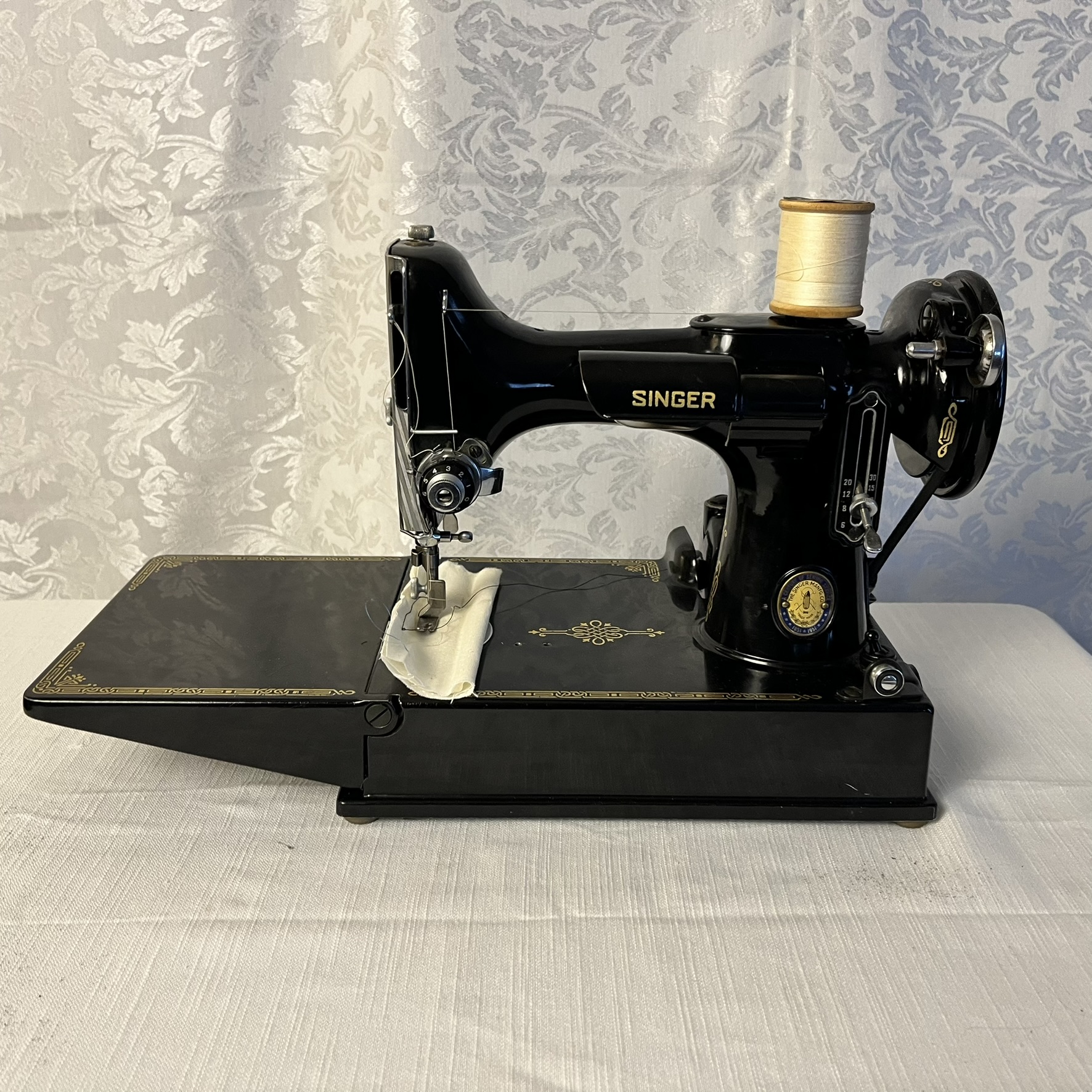 Stunning Vintage 1951 SINGER Featherweight sewing machine in latched carrying case, plug, and foot pedal. Works! This is a must-add to your collection. All misc parts shown in this lot may or may not be compatible with this machine.