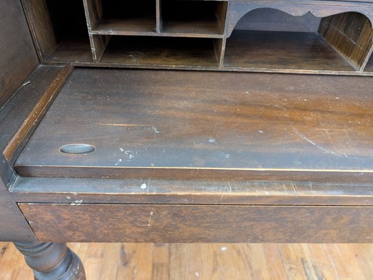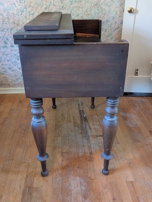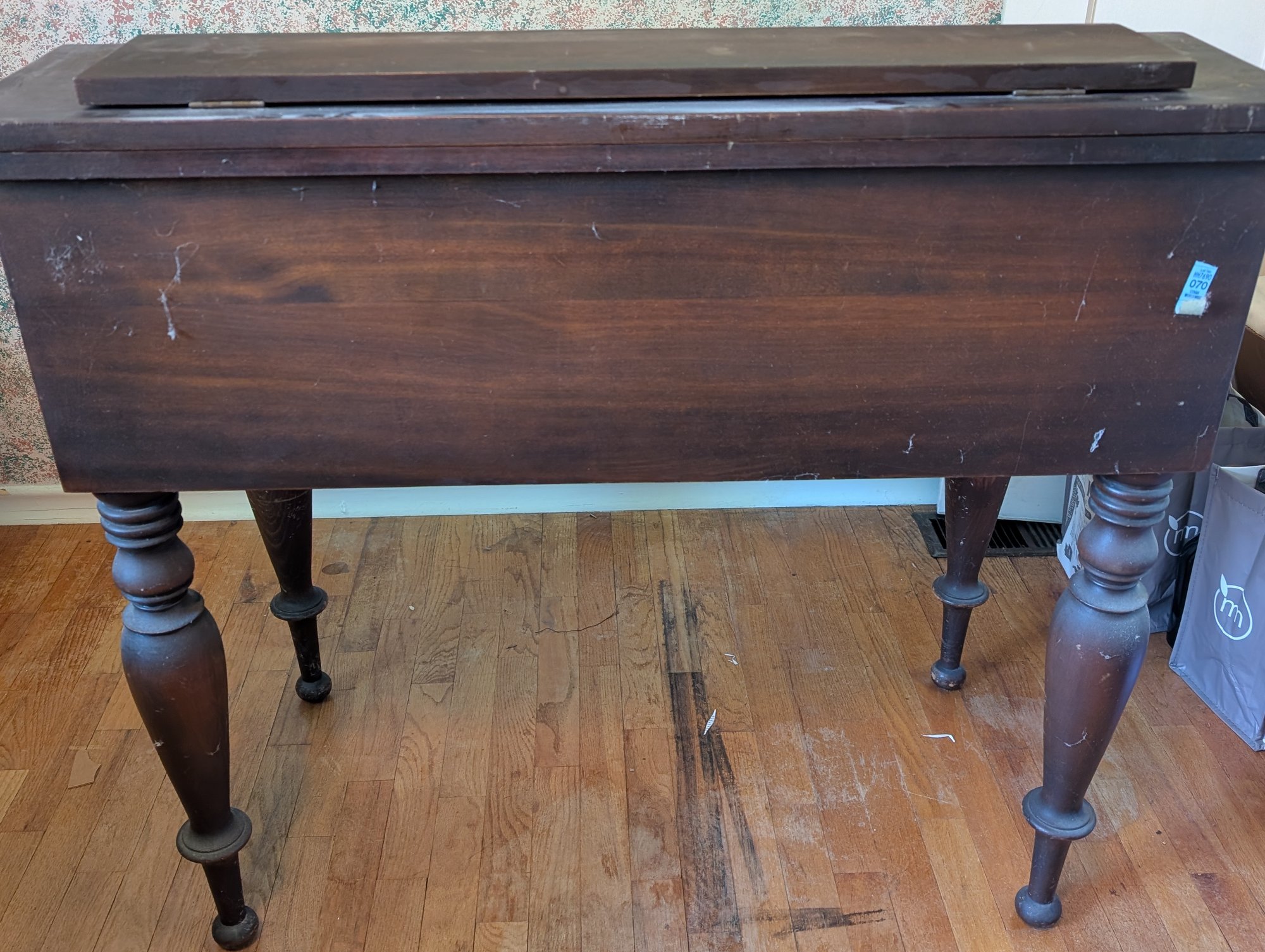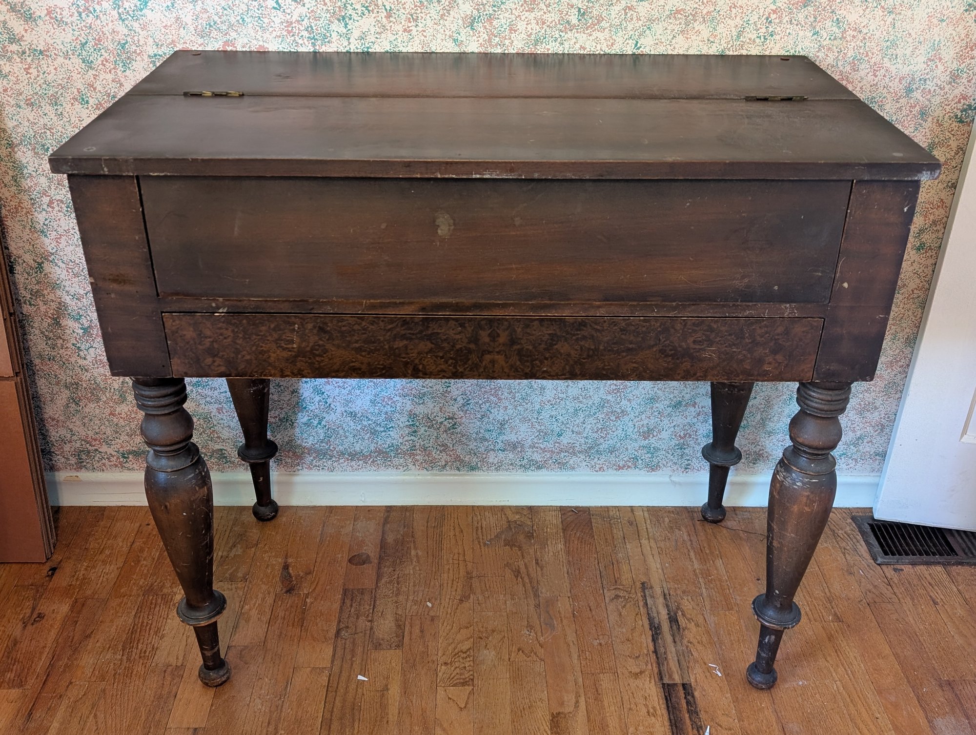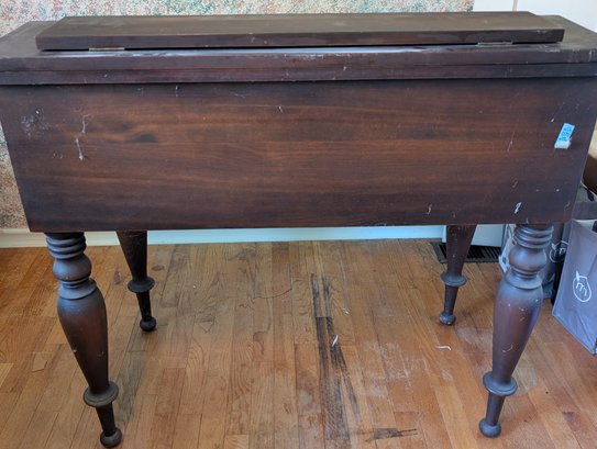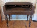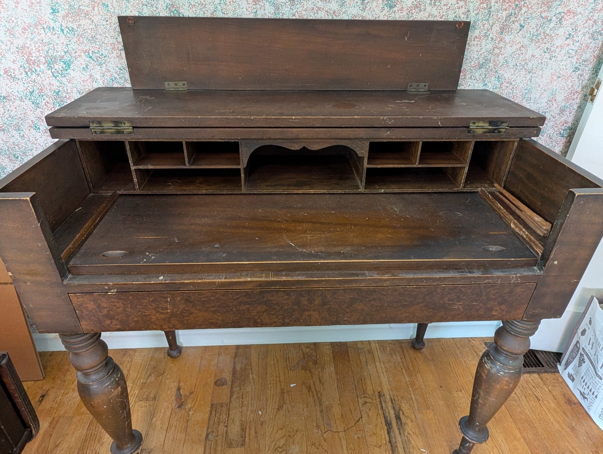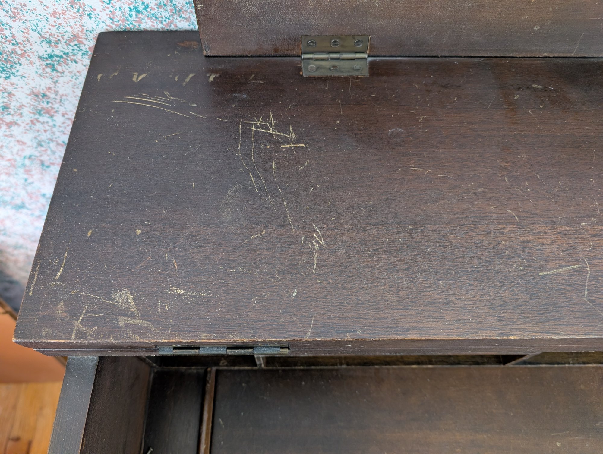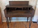 Early 20th Century mahogany writing desk. Hinged top with internal cubbies and a foldable writing surface. Shipit@loop-cycle.com