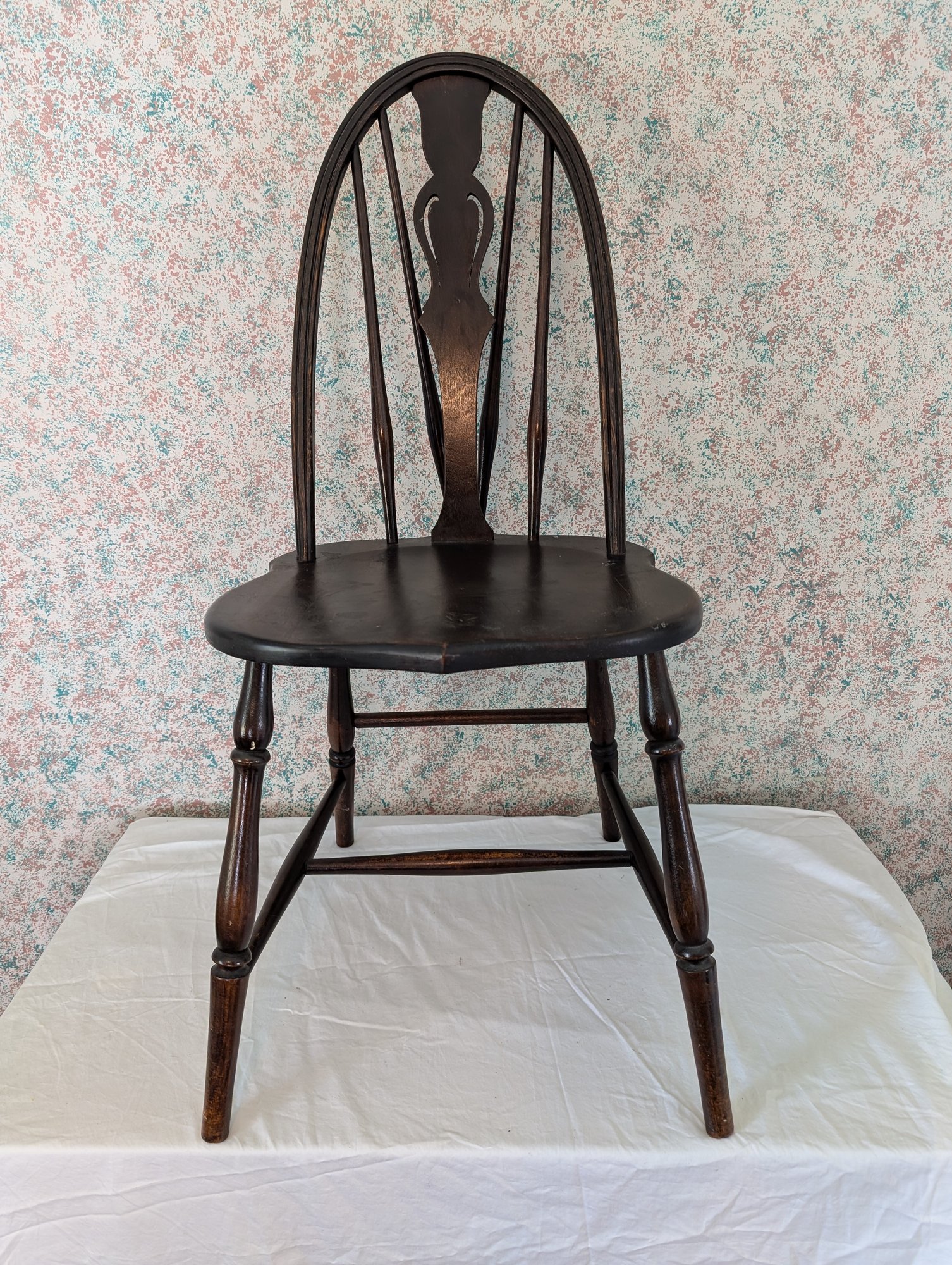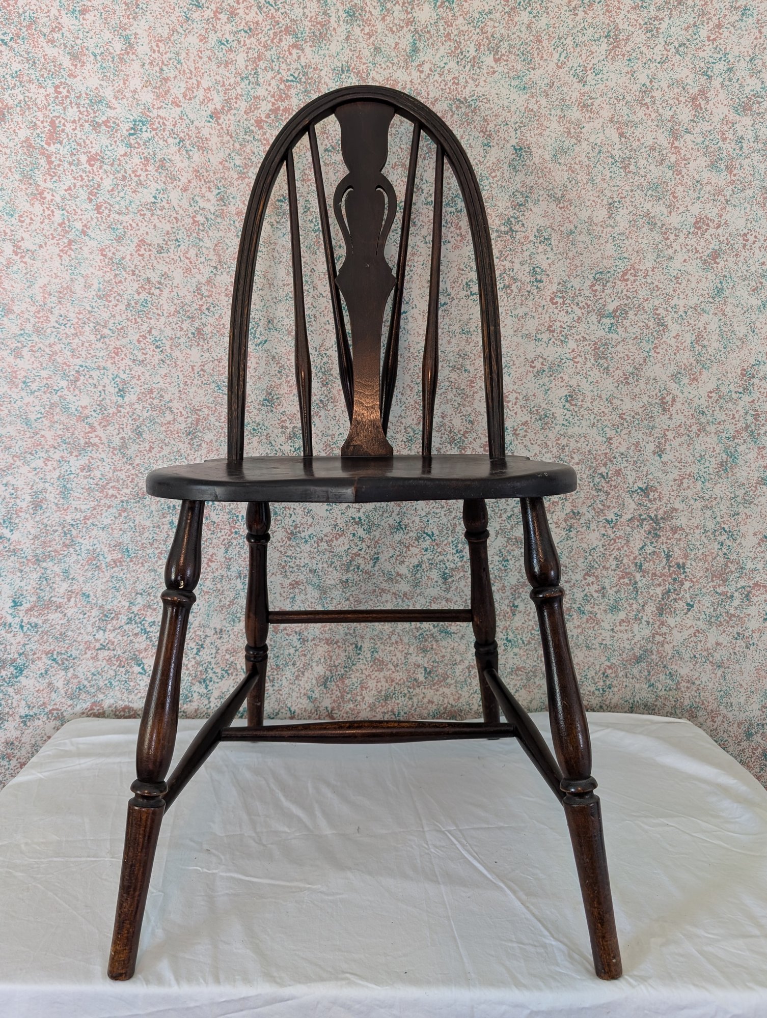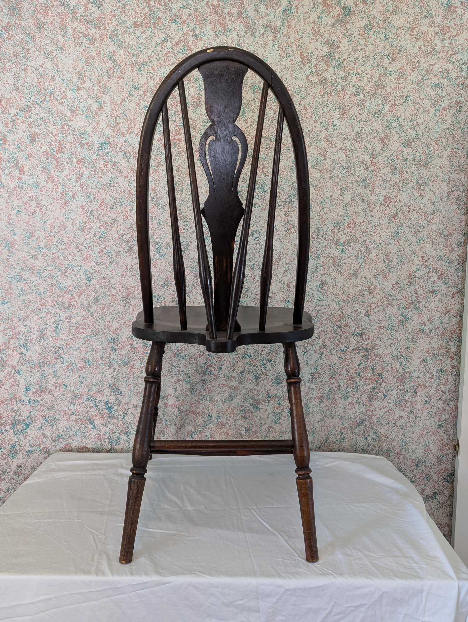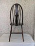 Characterized by a solid wooden seat into which the legs and back spindles are inserted, featuring a decorative splat shaped like a wagon wheel. Shipit@loop-cycle.com