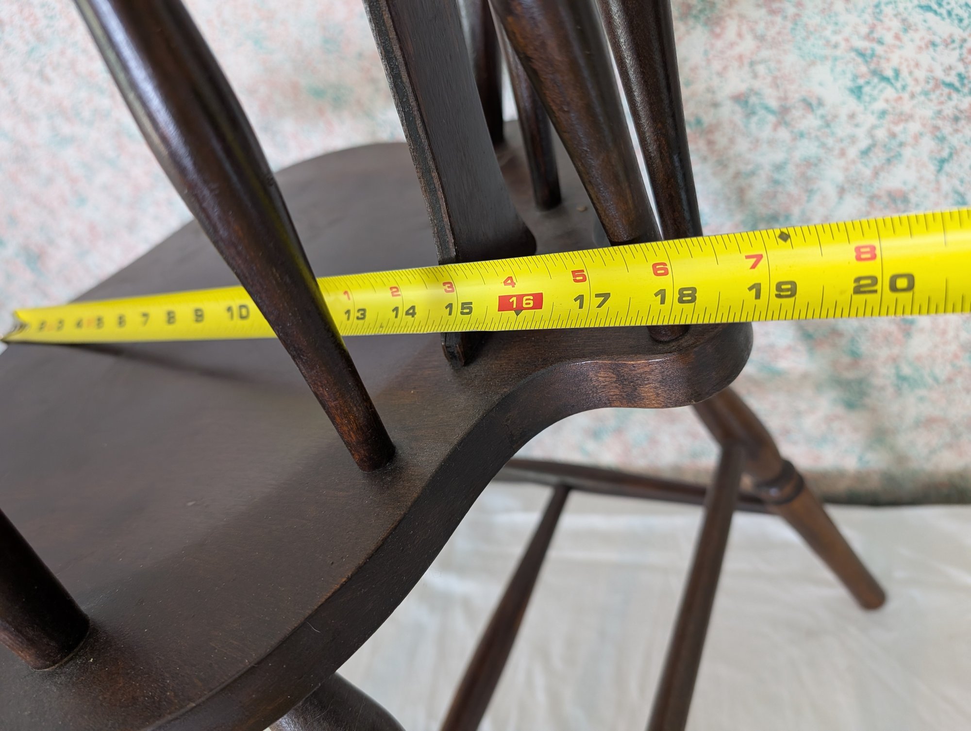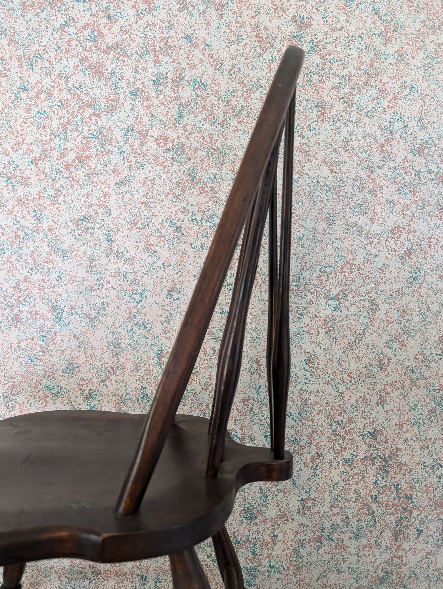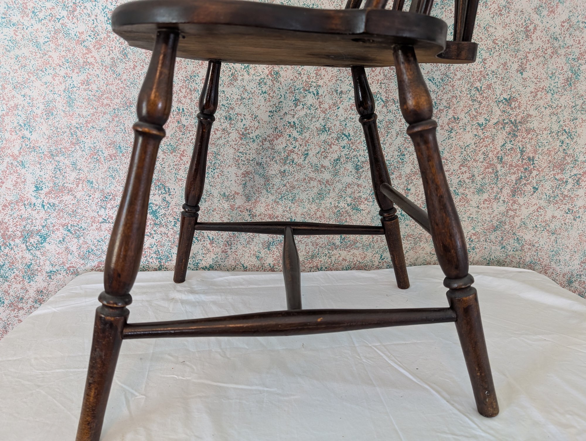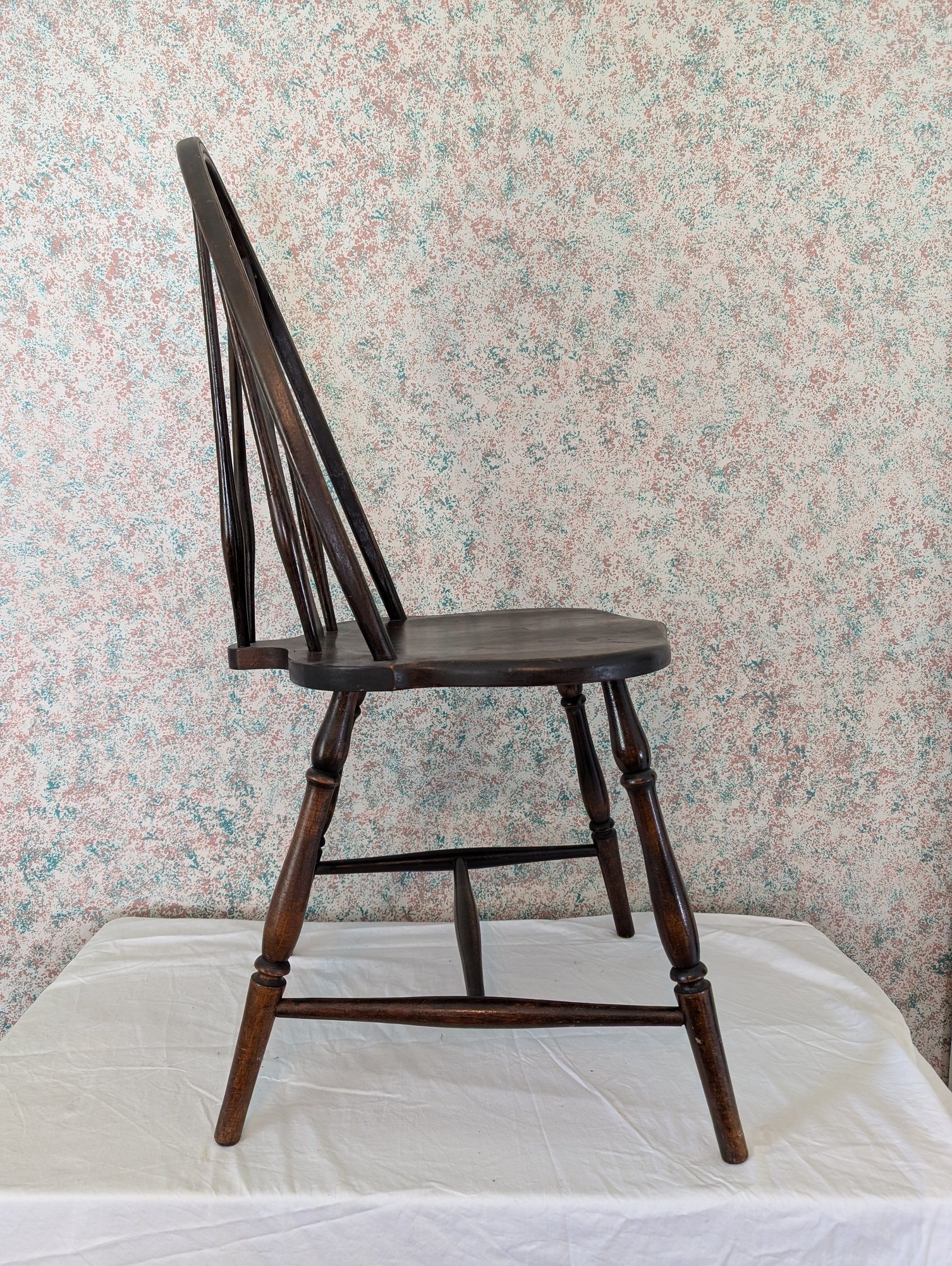 Characterized by a solid wooden seat into which the legs and back spindles are inserted, featuring a decorative splat shaped like a wagon wheel. Shipit@loop-cycle.com
