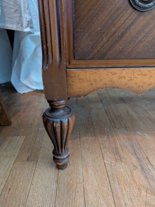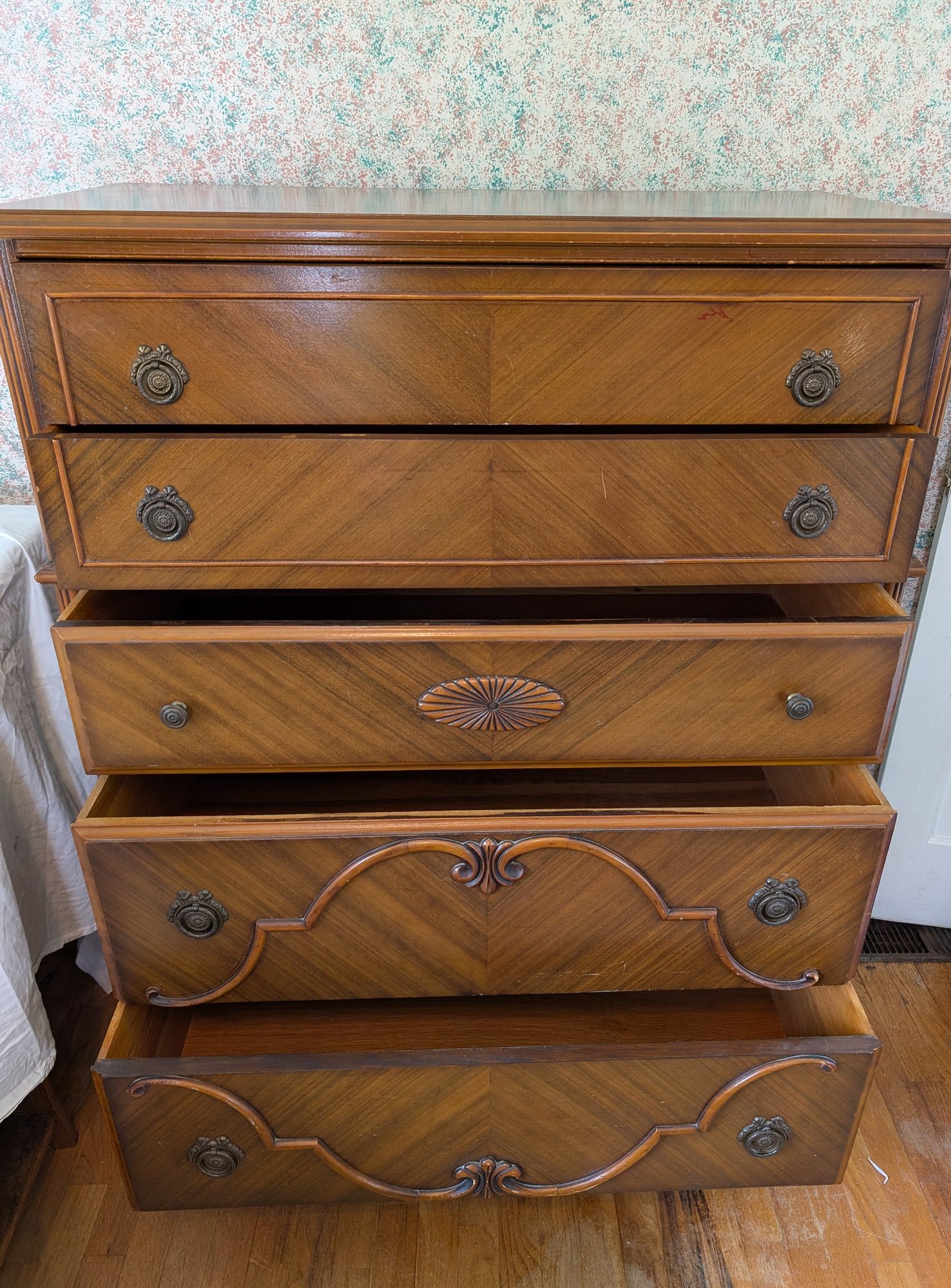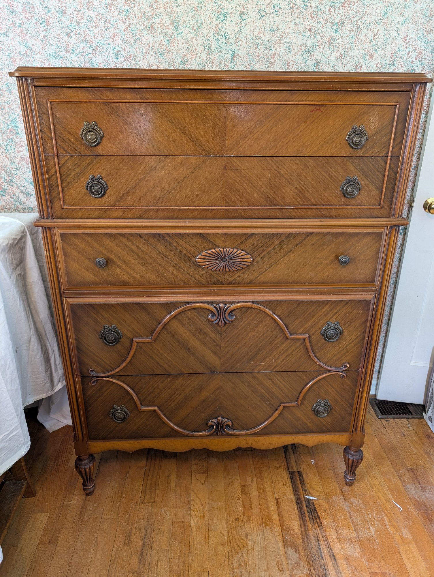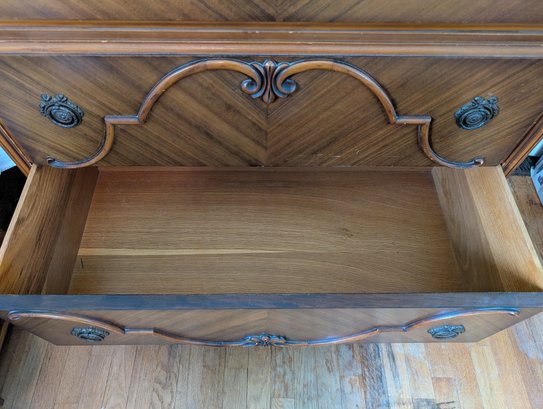 Featuring inlaid parquetry wood veneer. Ornate brass hardware and cabriole-style legs. 5 drawers. Shipit@loop-cycle.com