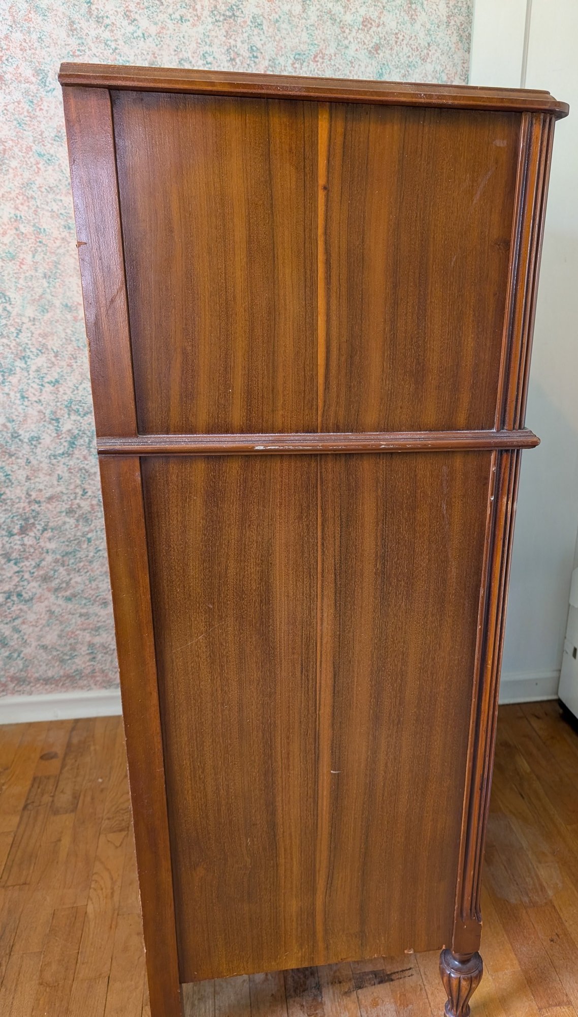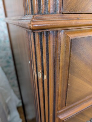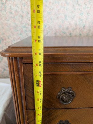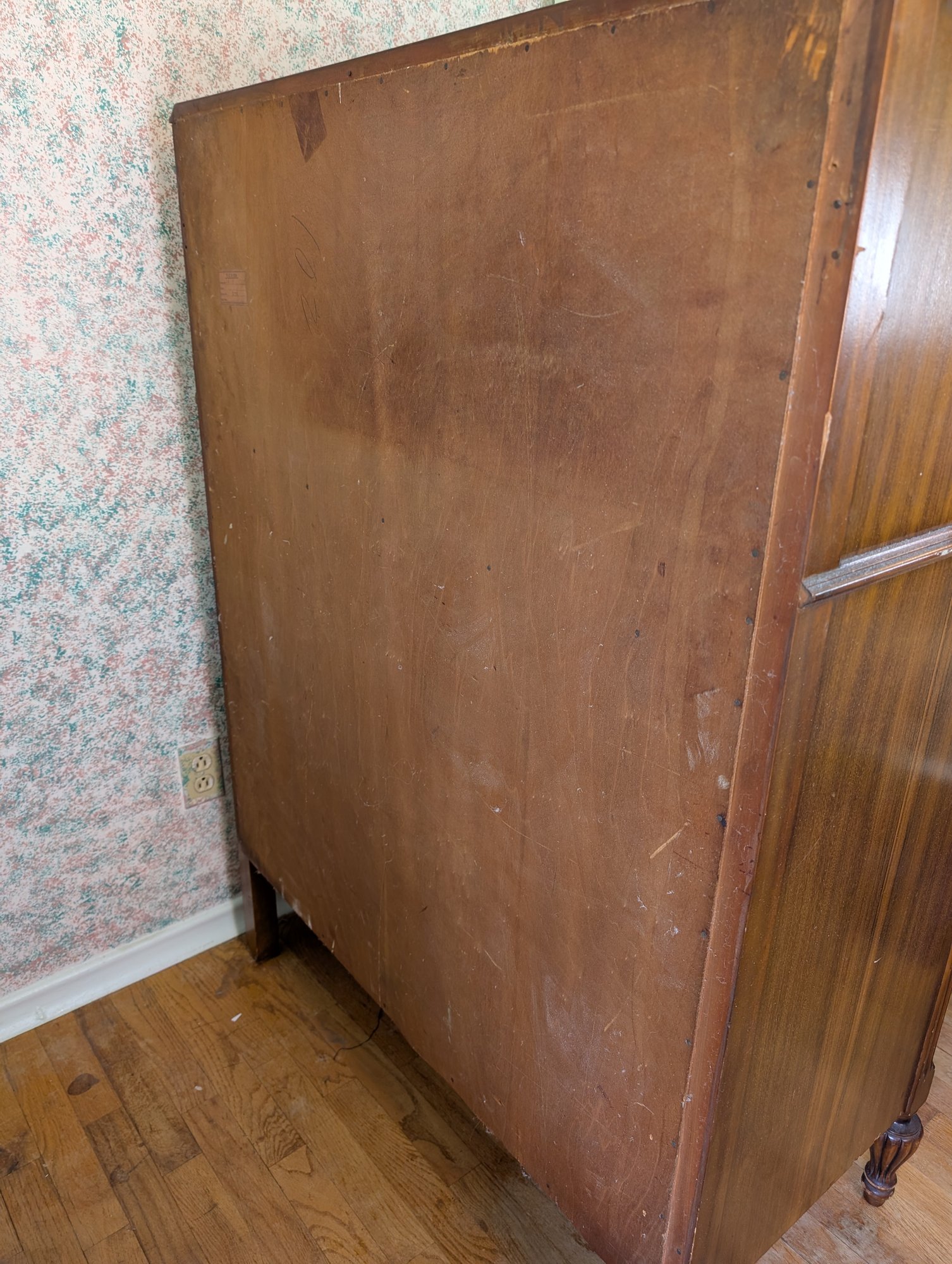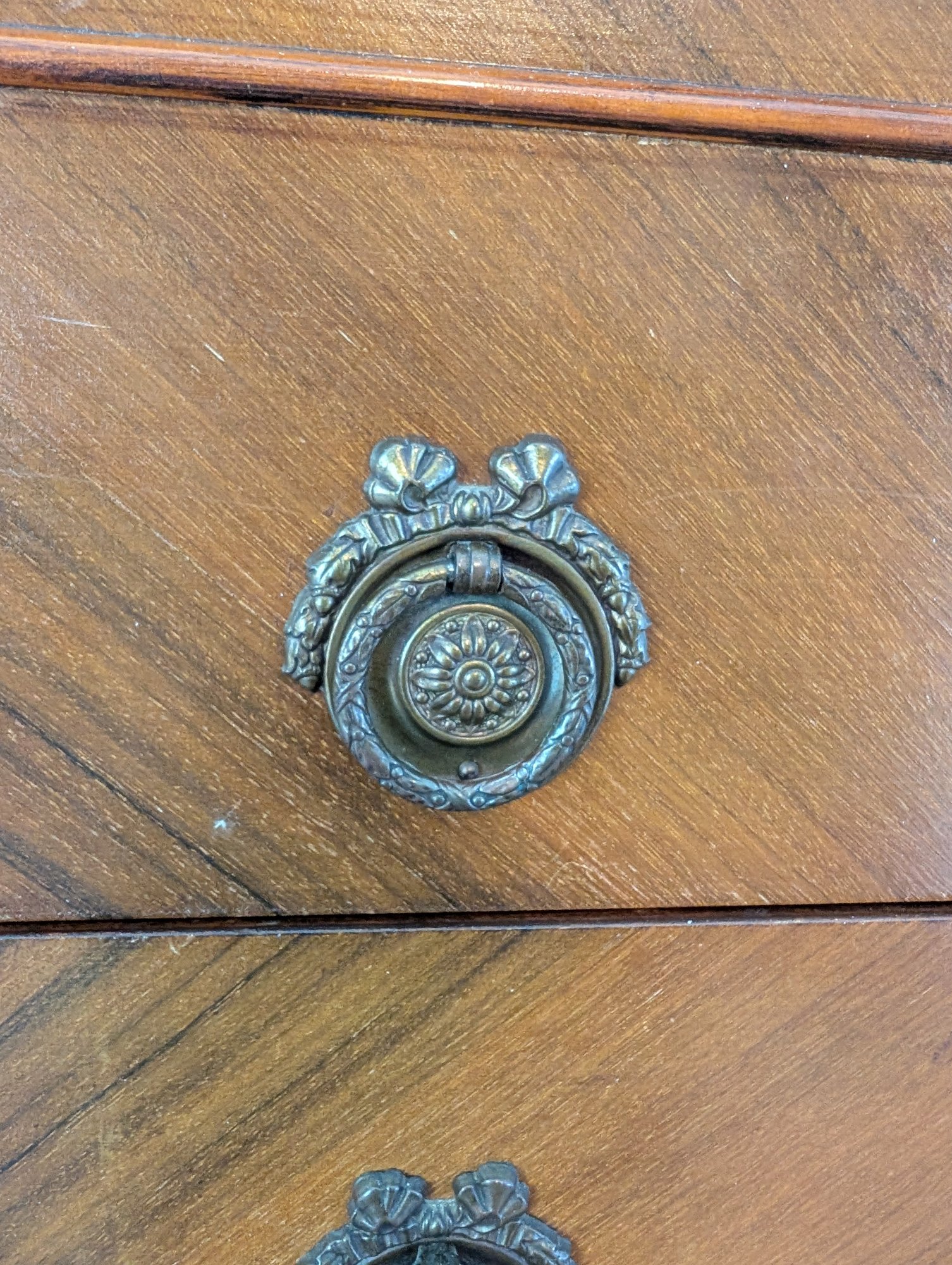 Featuring inlaid parquetry wood veneer. Ornate brass hardware and cabriole-style legs. 5 drawers. Shipit@loop-cycle.com