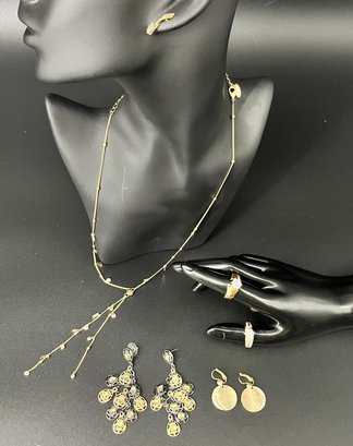 Collection of black and yellow jewelry pieces. 1 long necklace, 3 pairs of earrings, and 2 rings (likely size 6-7).