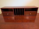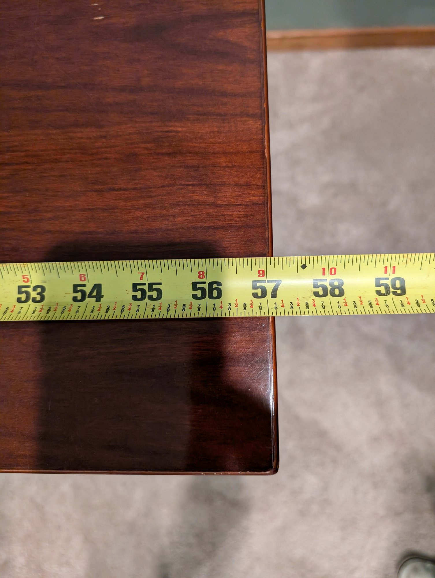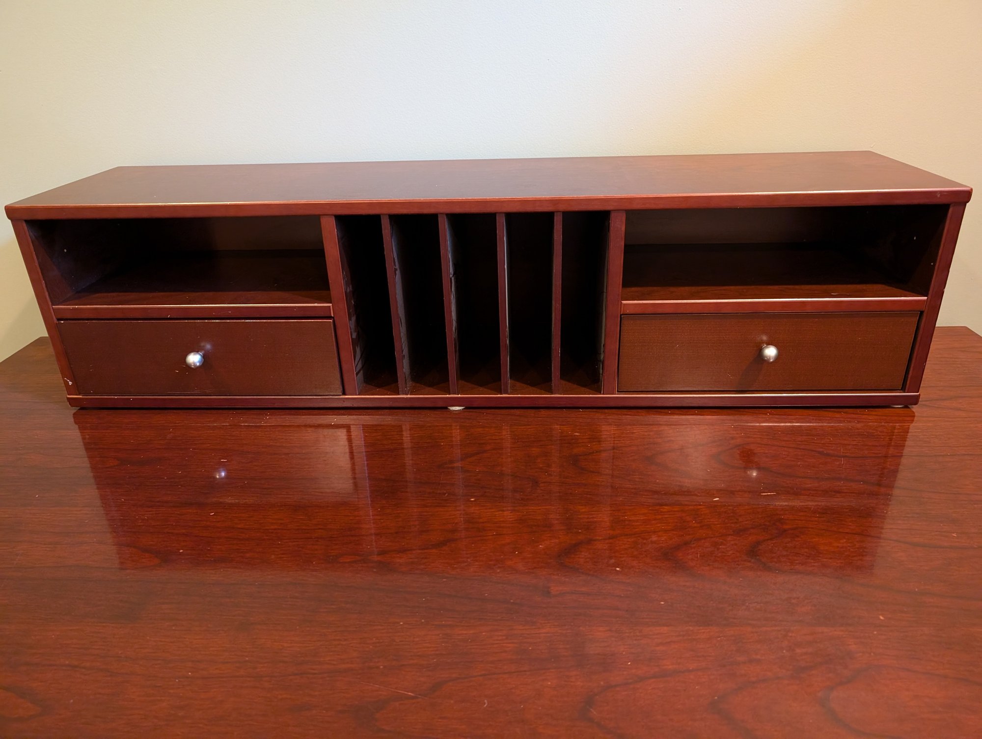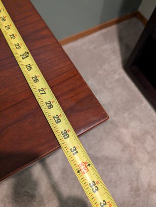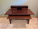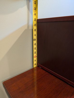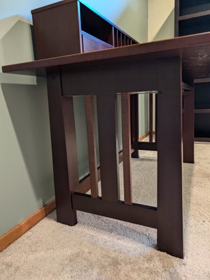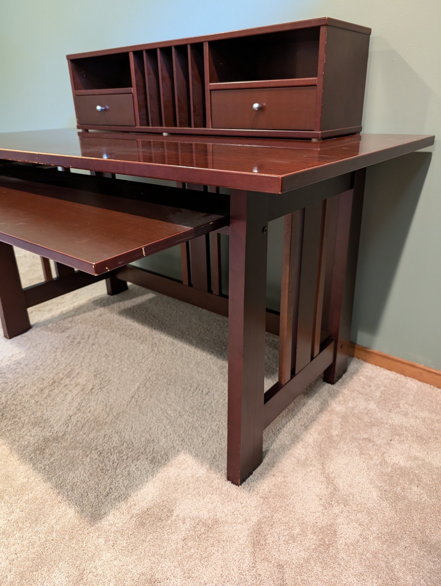 Mission style desk in warm cherry wood color with pull-out keyboard shelf. It could easily be touched up with a furniture pen and is well made.