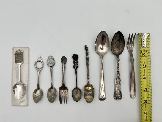 3.5"-5.75" range: Statue of Liberty "Centennial Celebration 1886-1986 - "Keep the torch lit" on scoop, 25th Anniversary, "Bermuda" spoon, unmarked silver-plated fork, "rose" spoon, patriotic spoon, 5 3/4" unmarked spoon, Philidelphia spoon, unmarked three-prong fork.