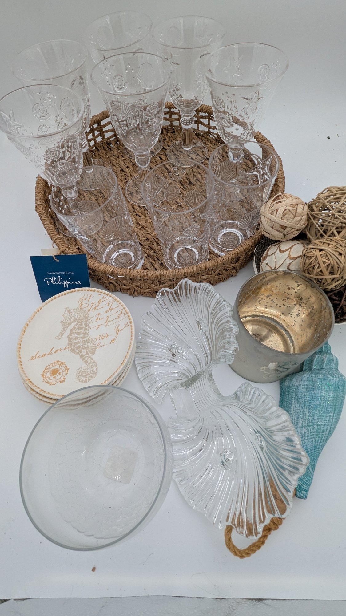 Includes serving tray, plastic drinkware, plates, and d�cor. Perfect for the deck at your weekend getaway!