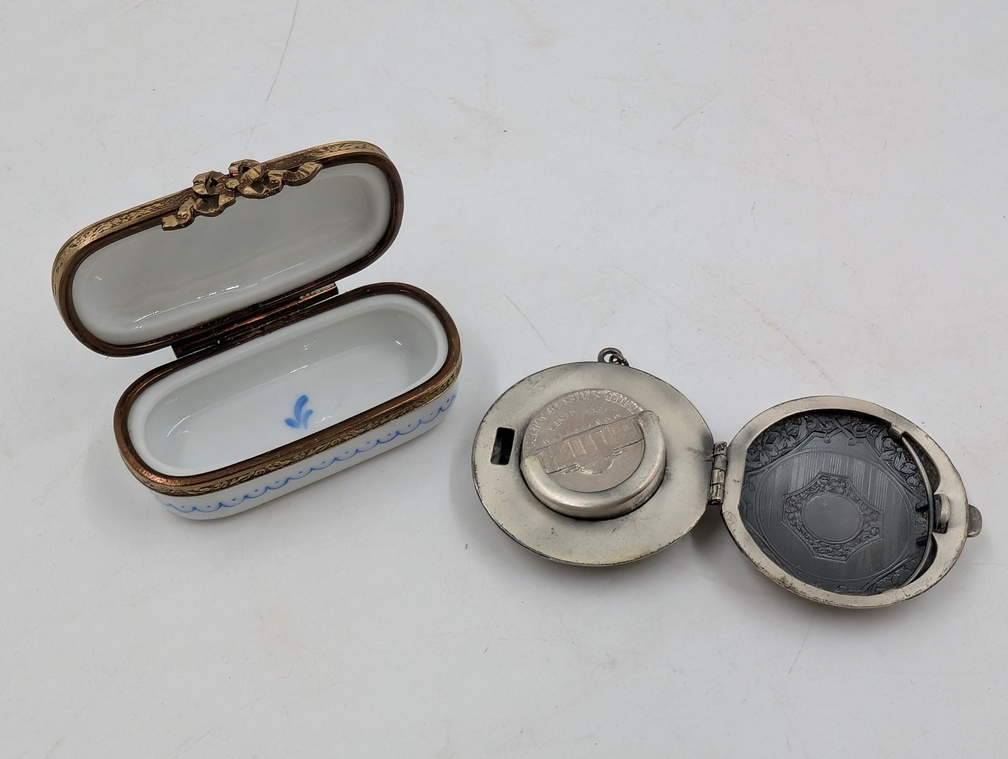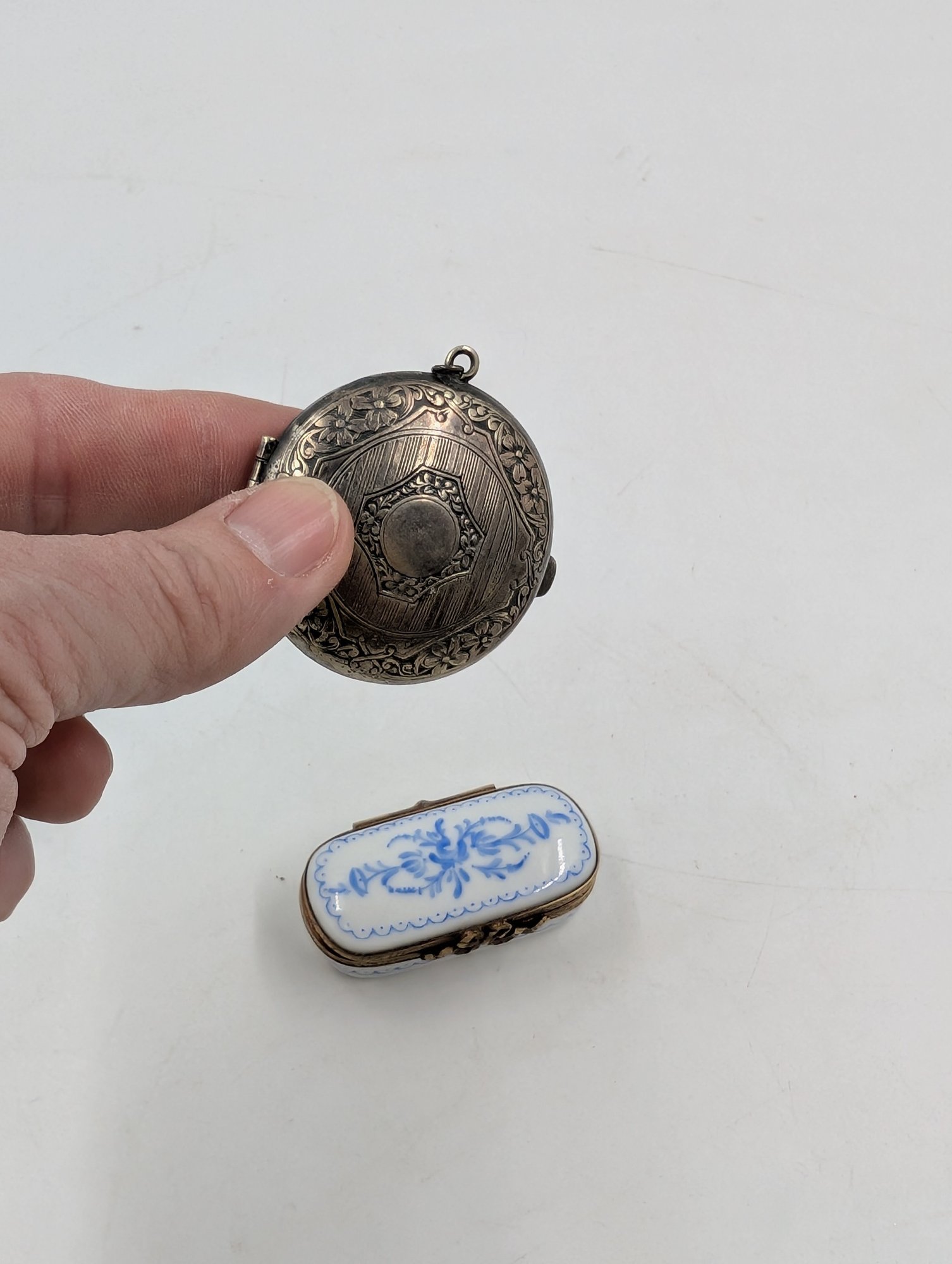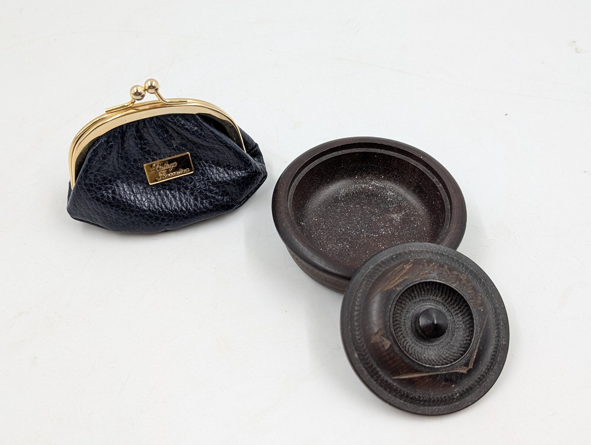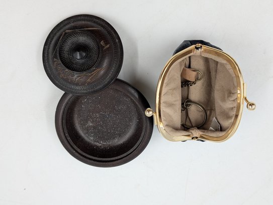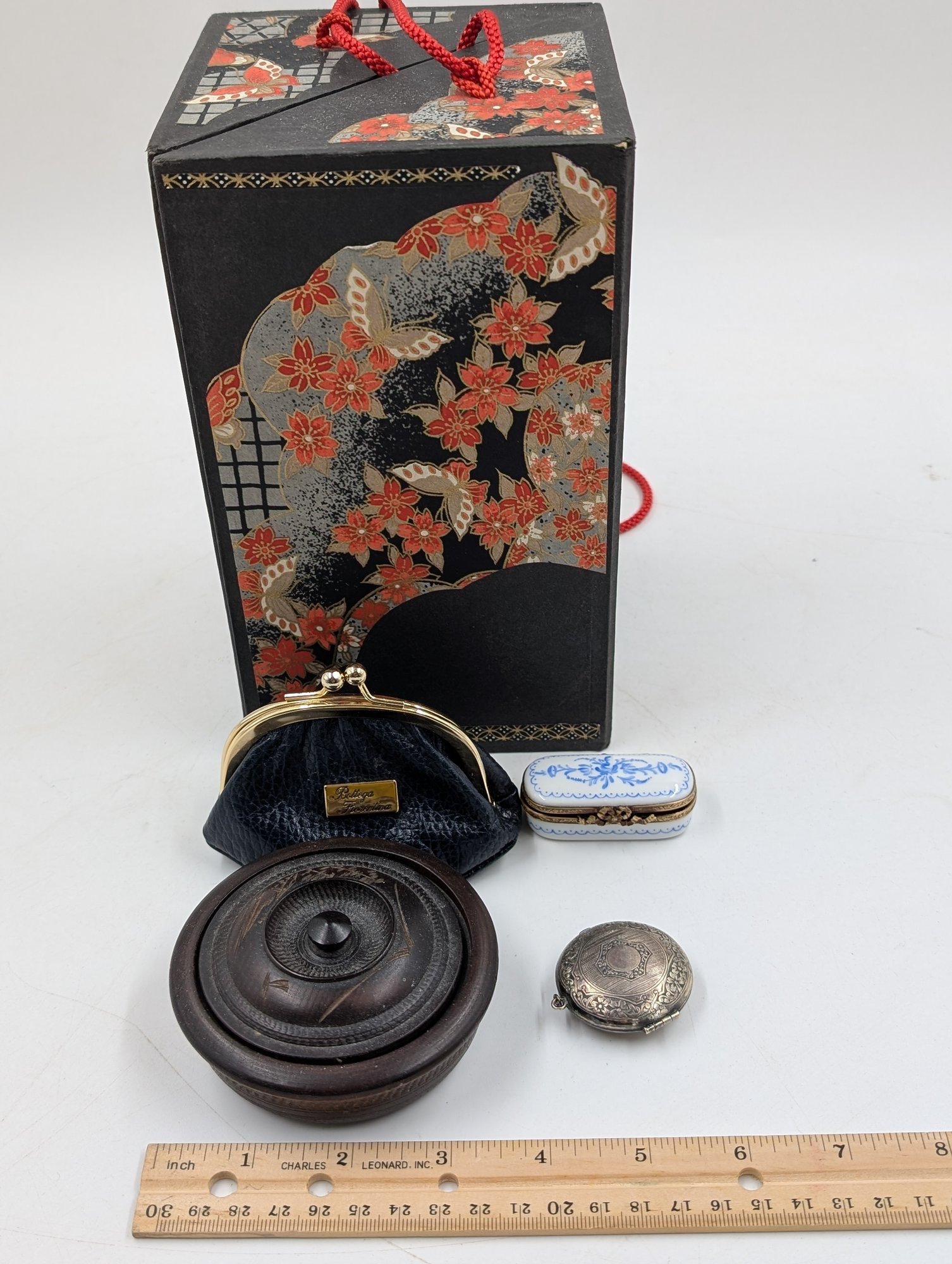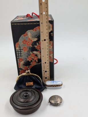 Japanese Rice Paper Art box, small leather coin purse, carved wooden box, porcelain pill box and metal coin locket. Shipit@loop-cycle.com