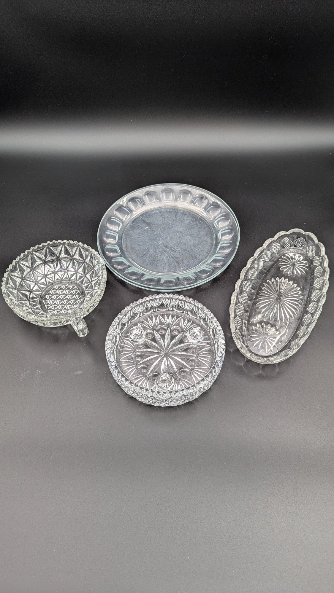 Mt Vernon bowl with diamond pattern by Imperial Glass, lead crystal Princess candy/nut dish and 2 Arcoroc France clear glass desert plates with indented edge 6�.