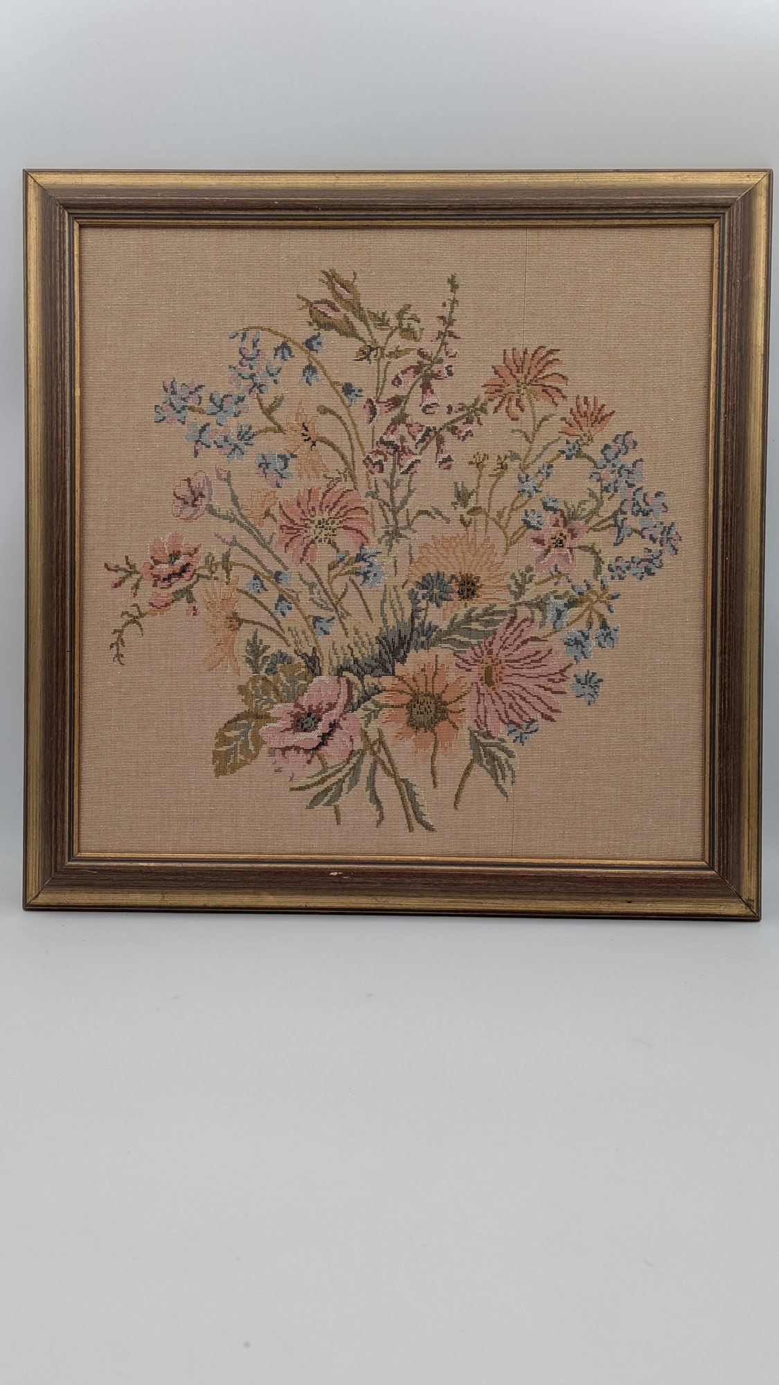 Gold colored frame. 21" square frame. See photos for frame flaws.