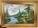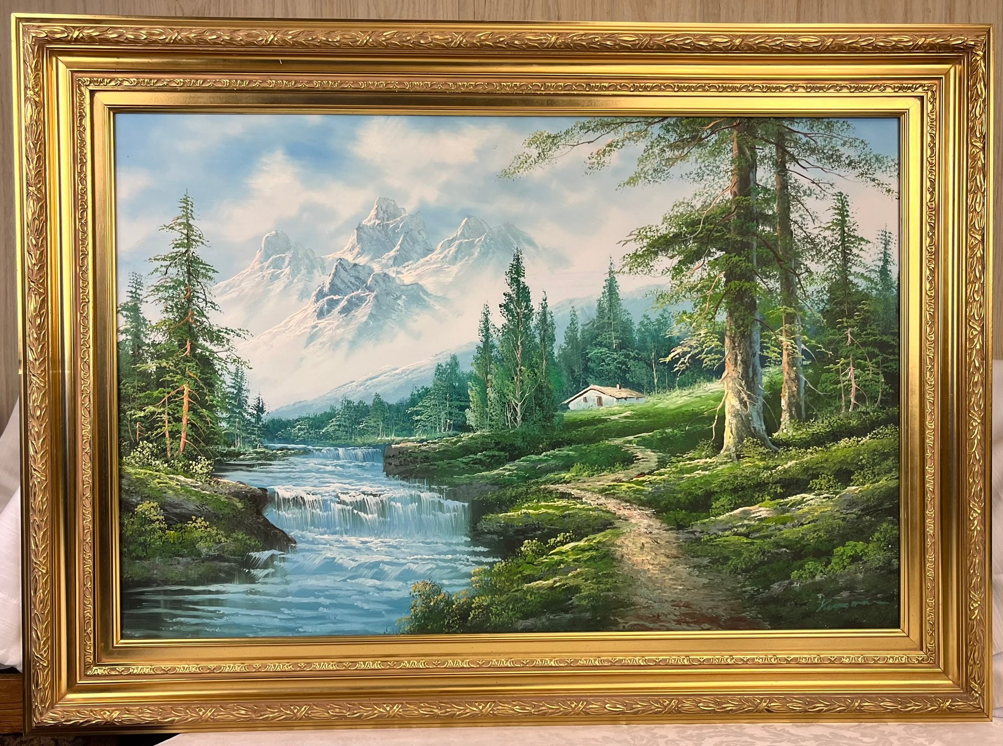 Vibrant oil painted on canvas with gold-painted frame. Overall 43.5" wide x 31.5" tall. Frame and canvas in good/great condition. Cannot identify signature