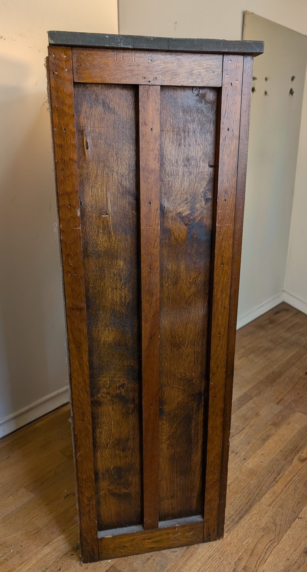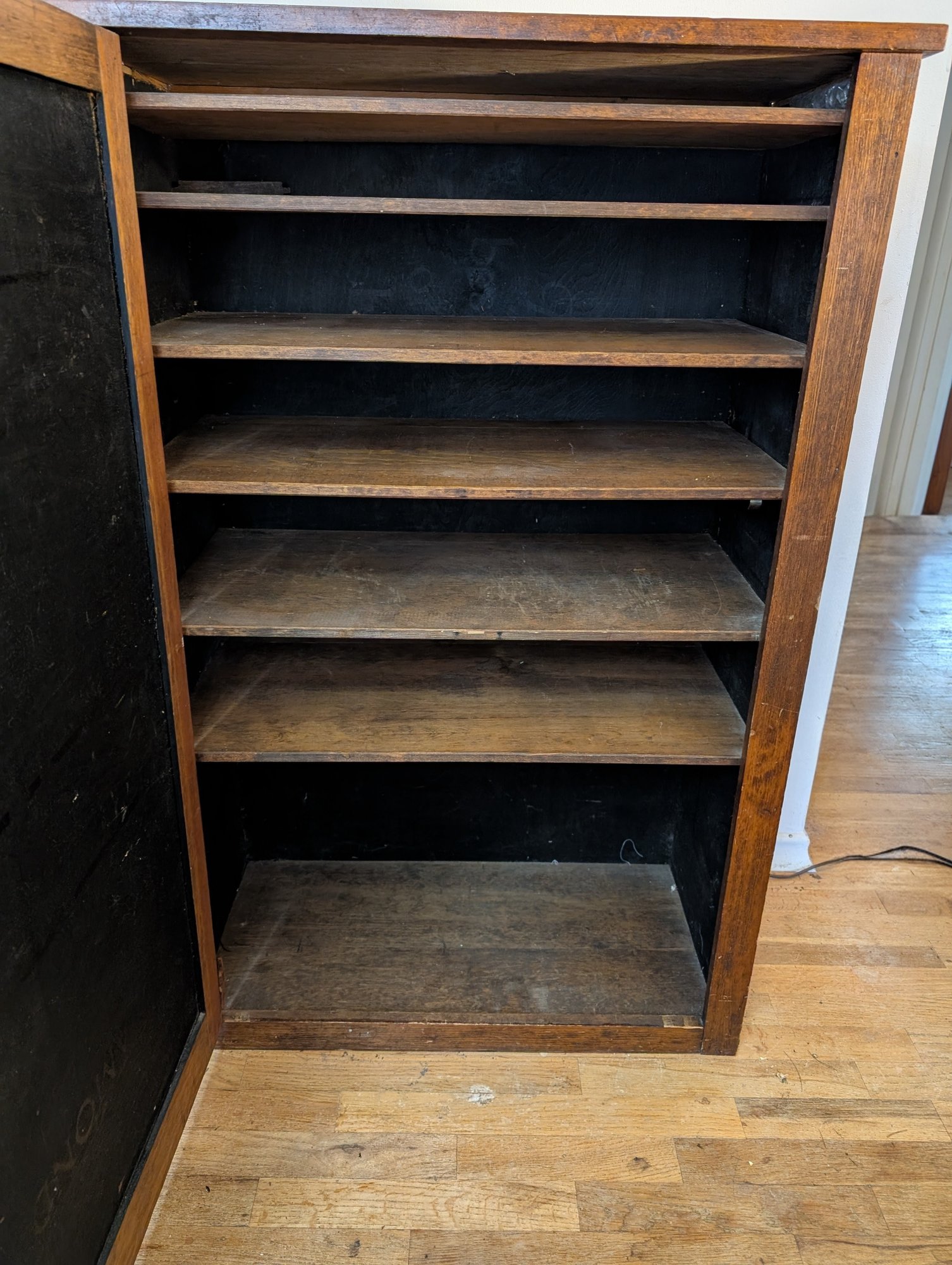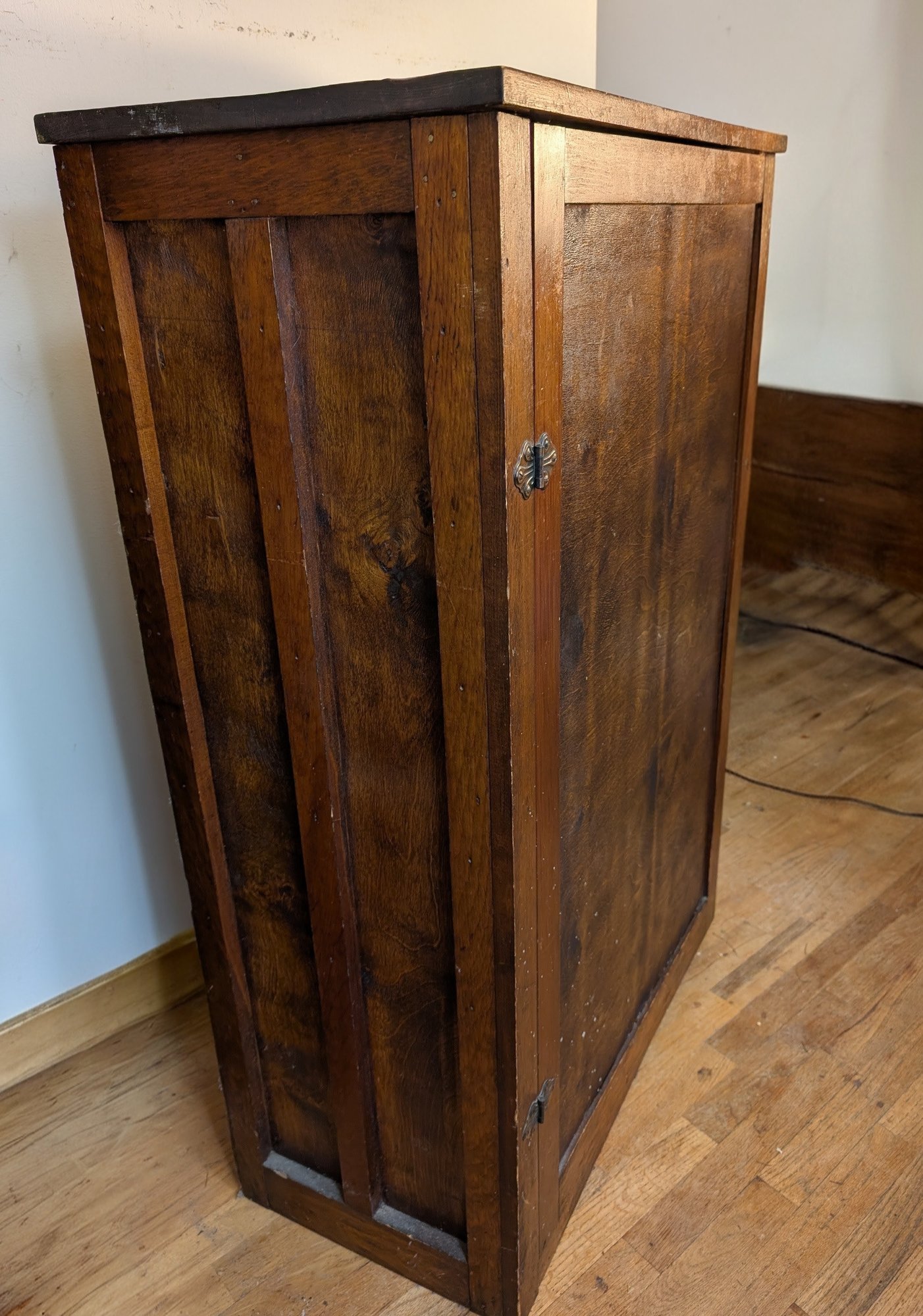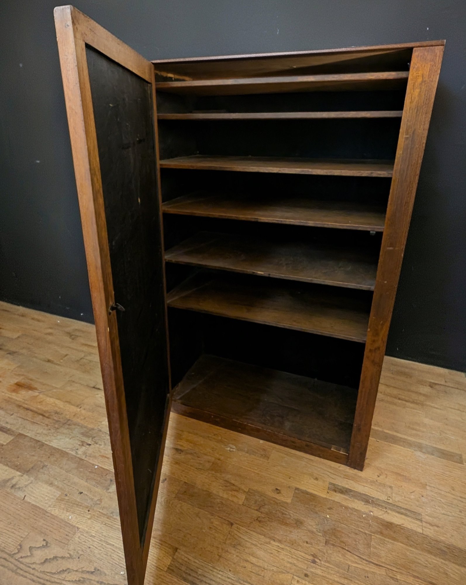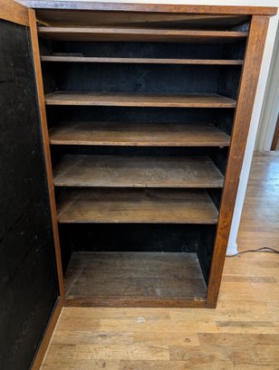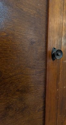 Fir or Walnut. Single panel door with original hinges and latch. Multiple Shelves. Shipit@loop-cycle.com