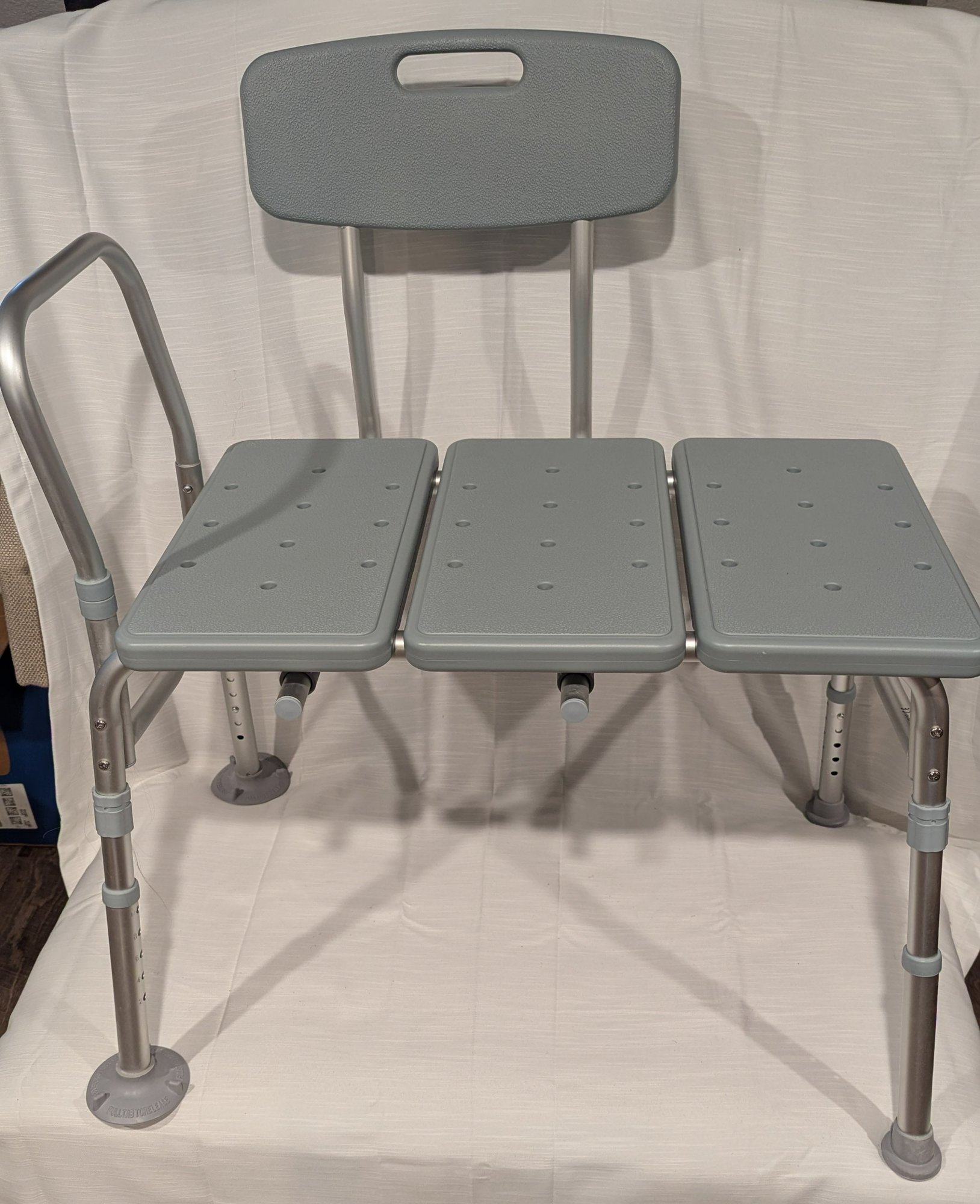 Shower transfer bench with back and grip handle.