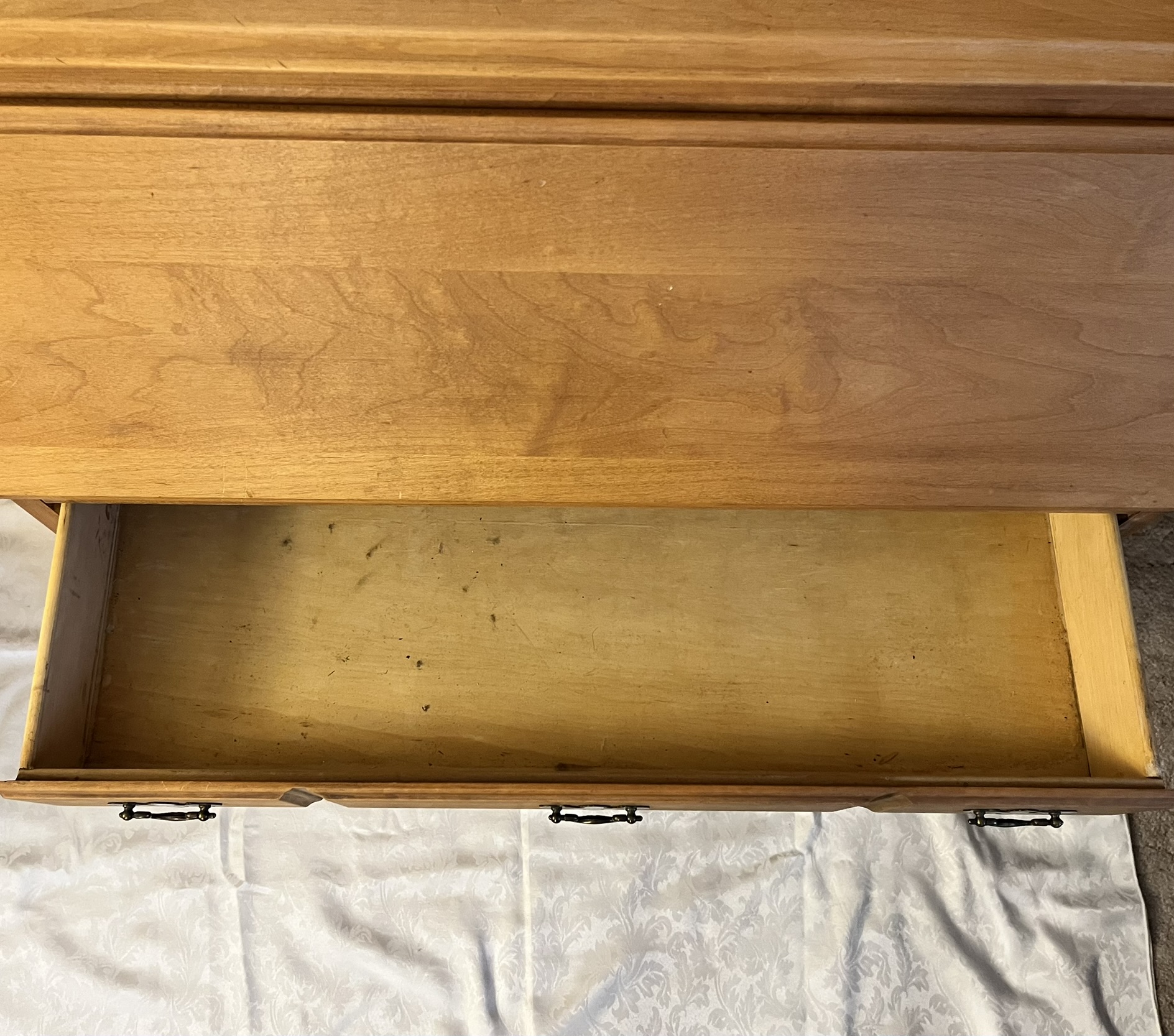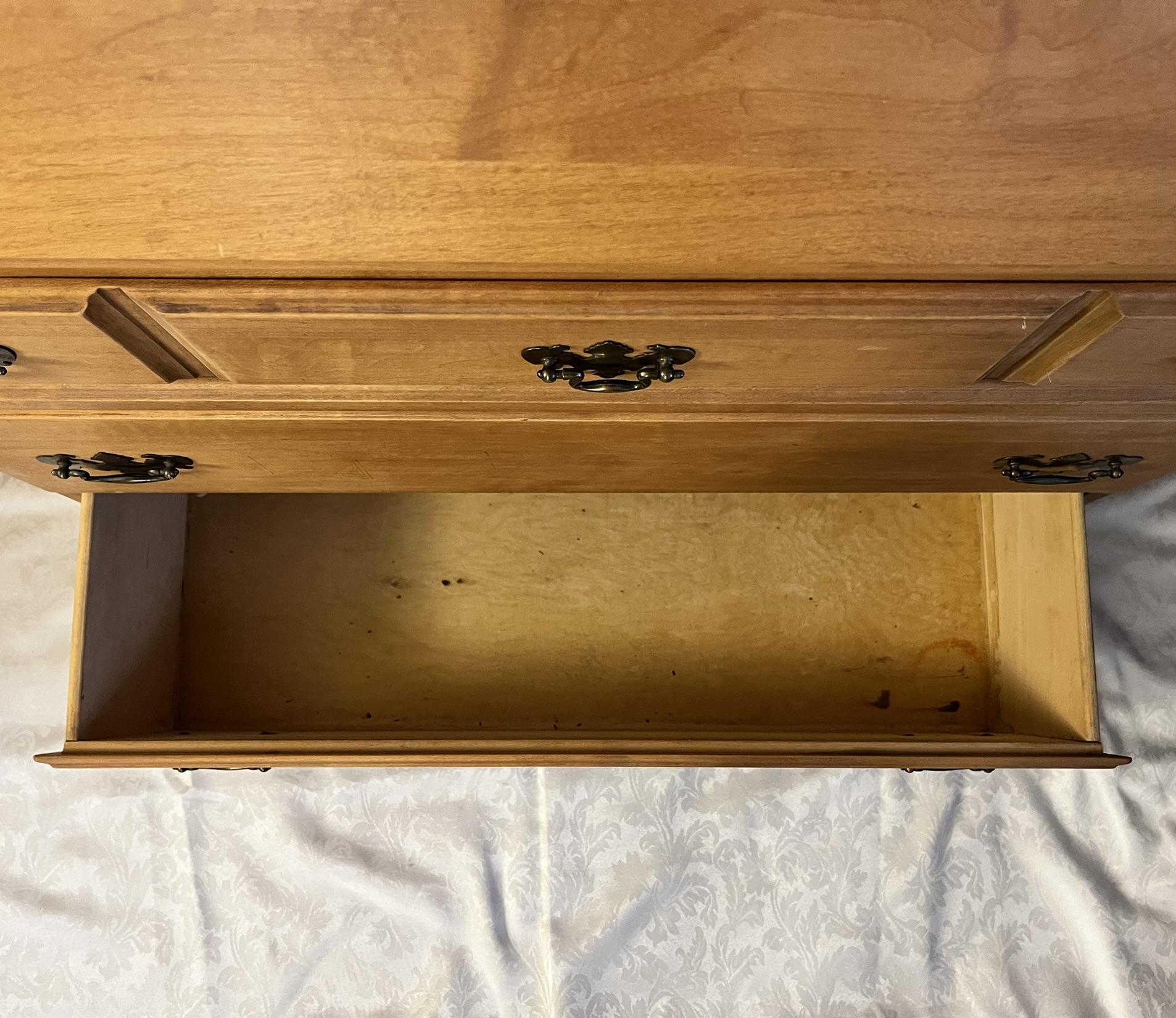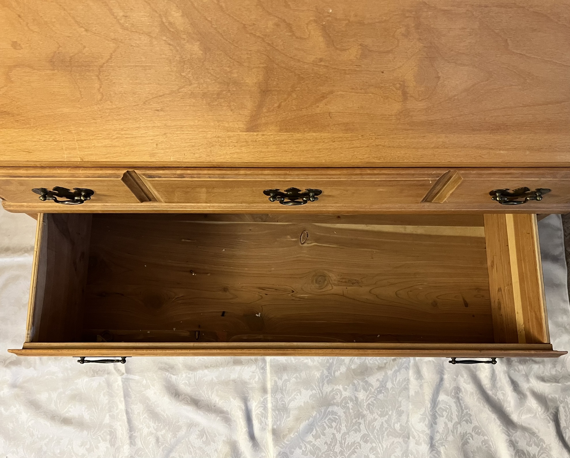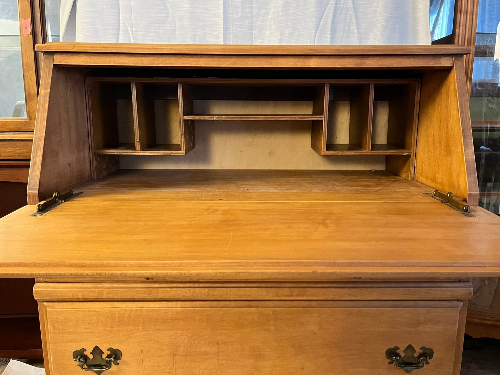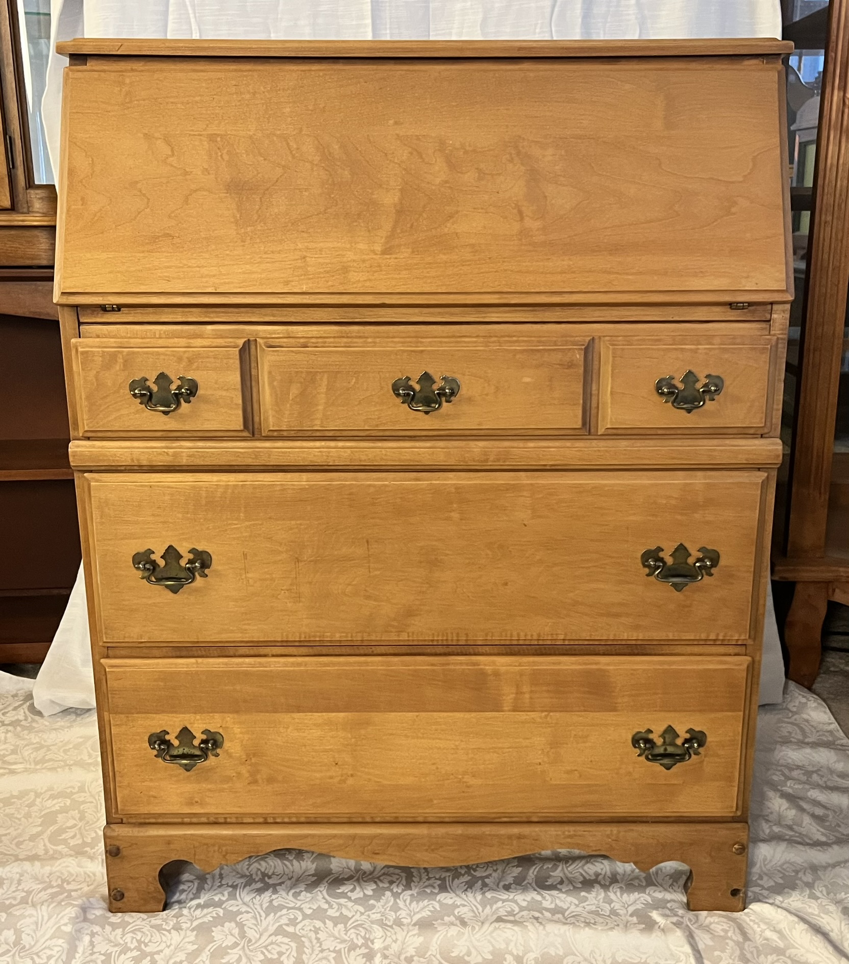 Solid wood secretary desk with drawers, flip-down desk, and compartment storage. Good condition. (Likely Thomasville), 32"w x 17.75" d x 41"high