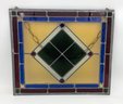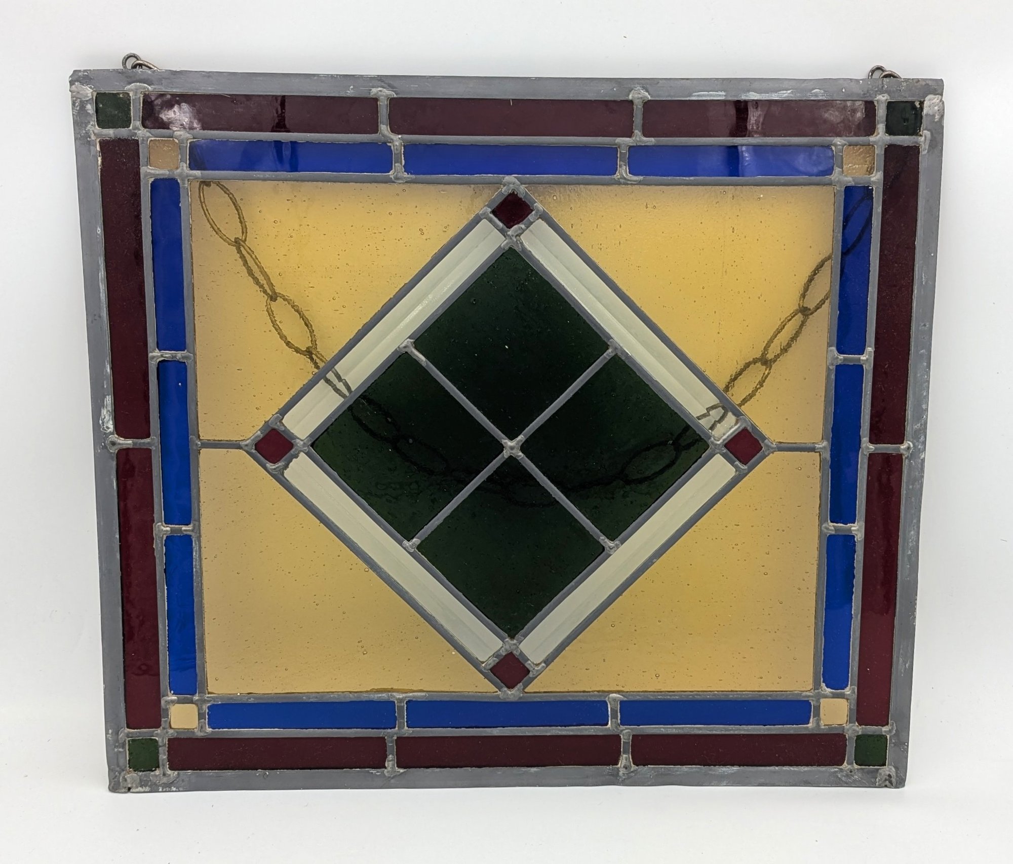 Stained glass with chainlink for display. Red, white, blue, green, off white/yellow glass. 18" x 16".