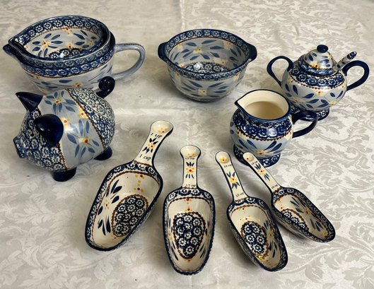 TEMP-TATIONS Old world blue stacking bowls, measuring scoops sugar dish and creamer, measuring cup scoops. See photos for details and condition