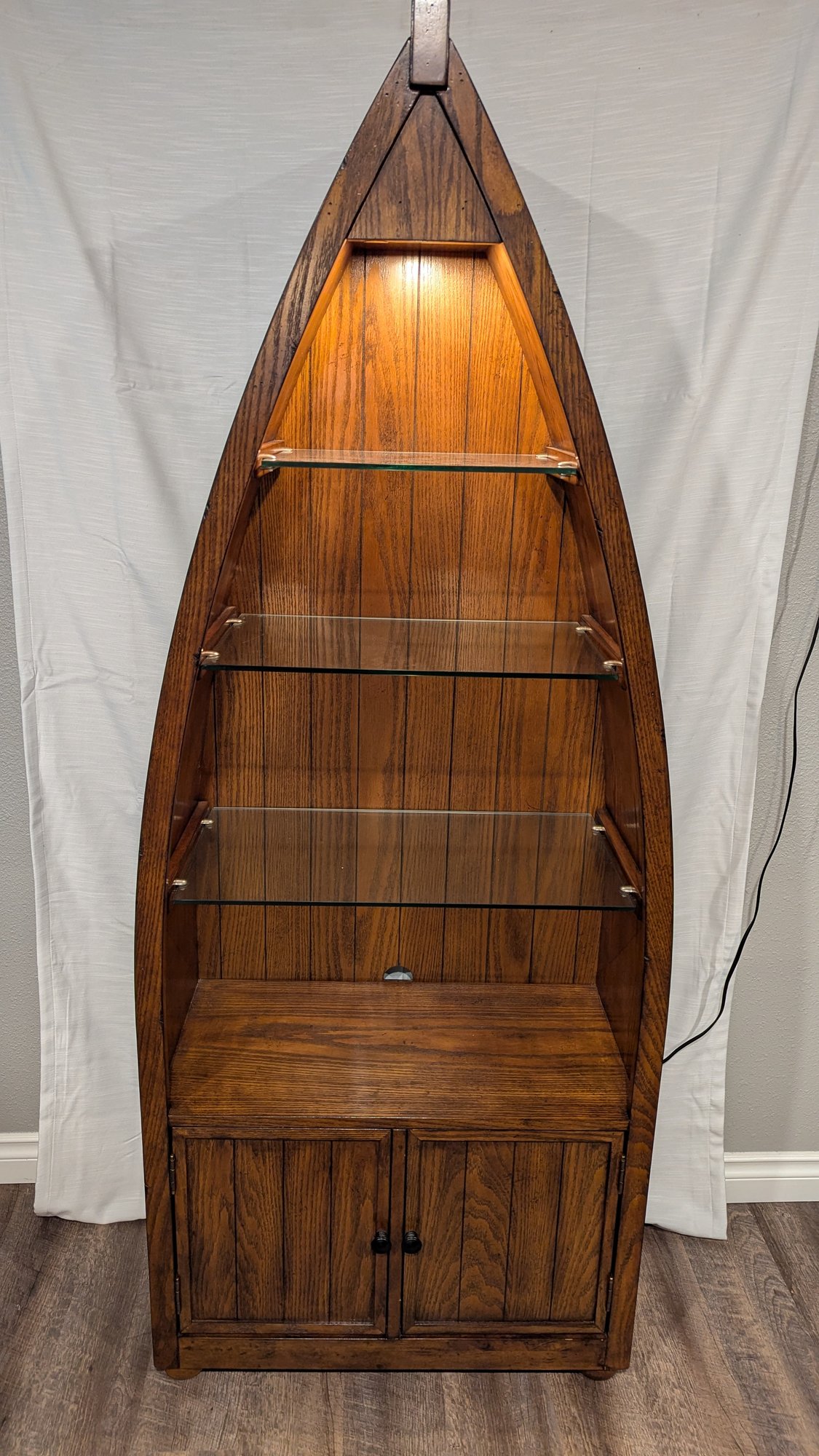 Features plug in lighting and lower cabinet. Base 20" x 28", Height 71.25". See photos for more dimensions and details.