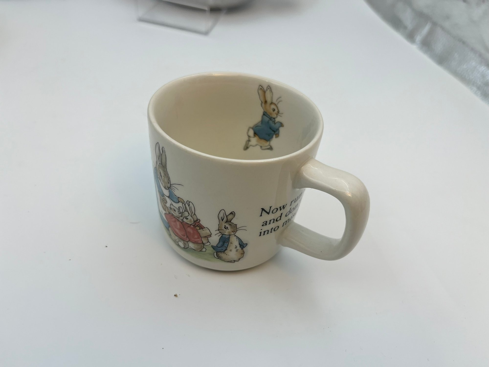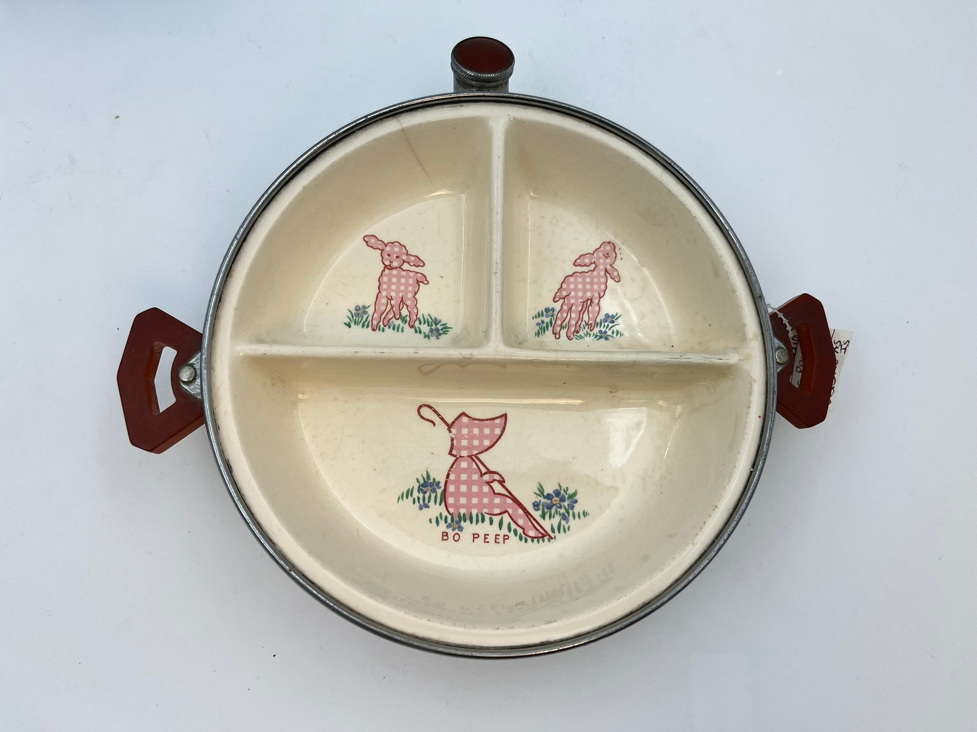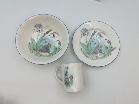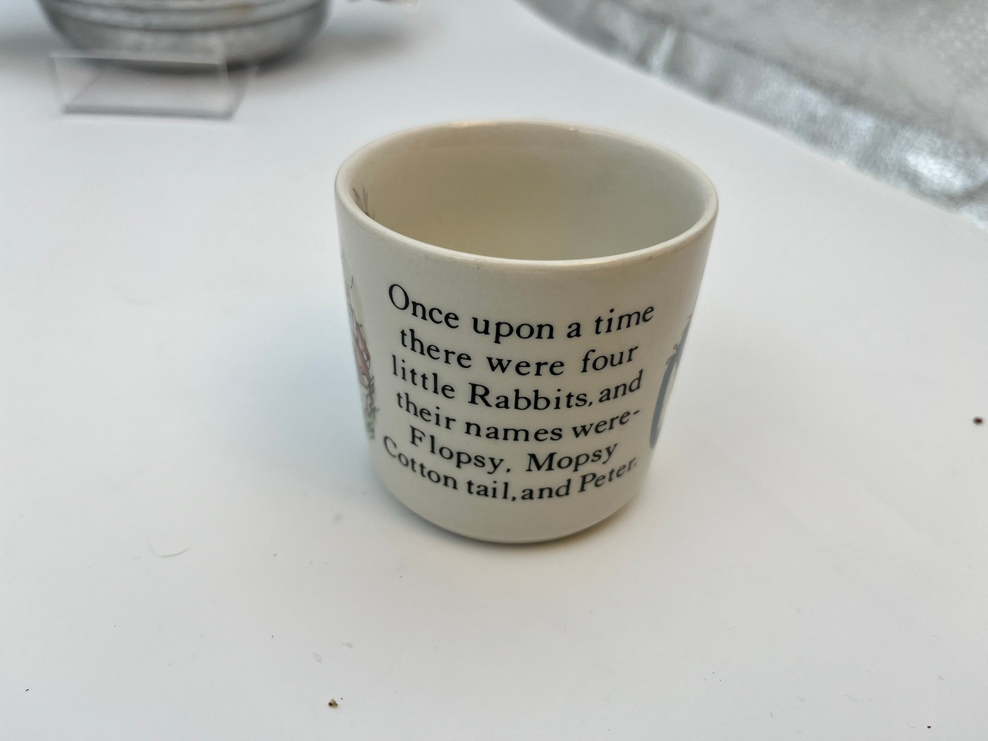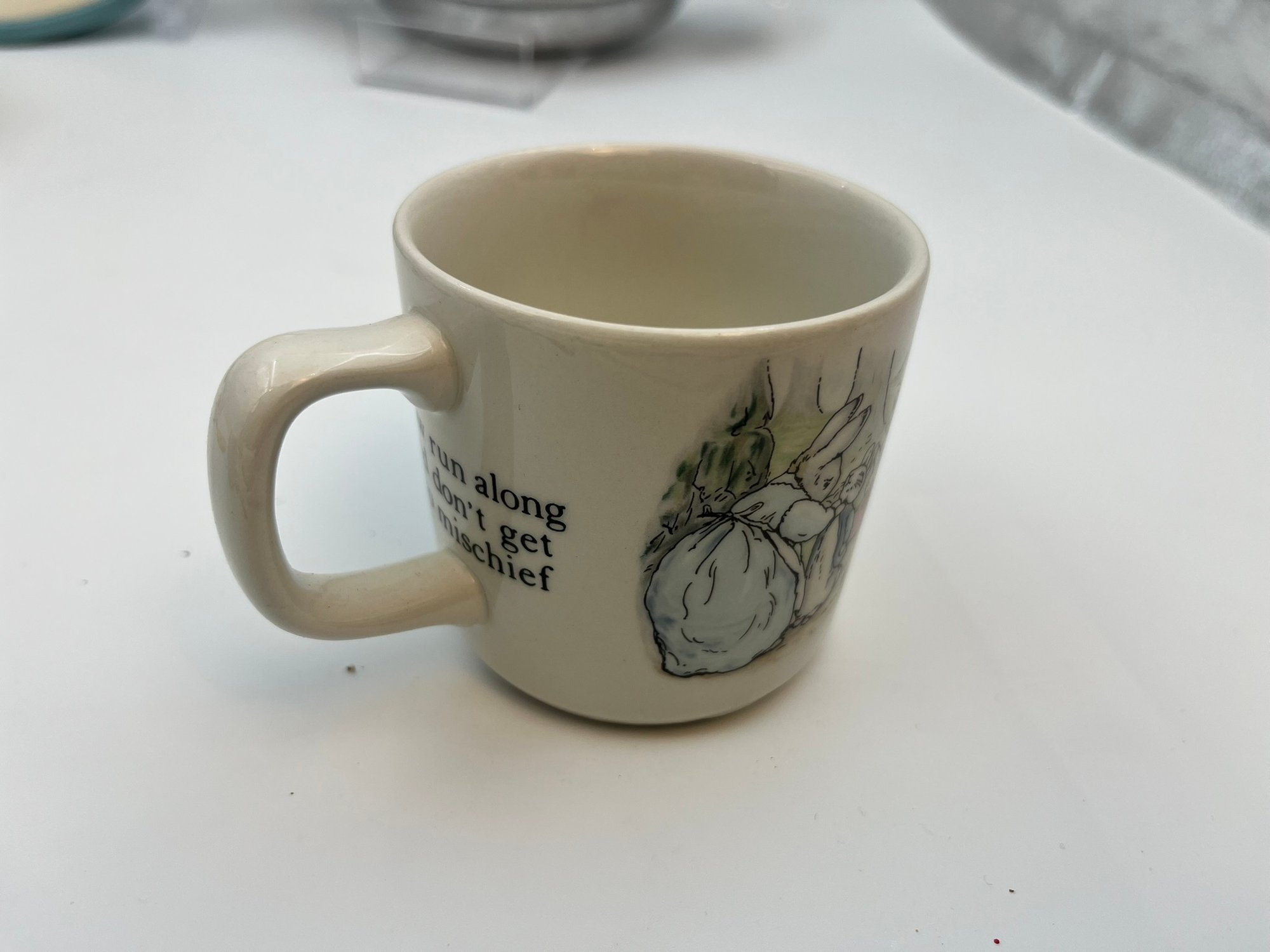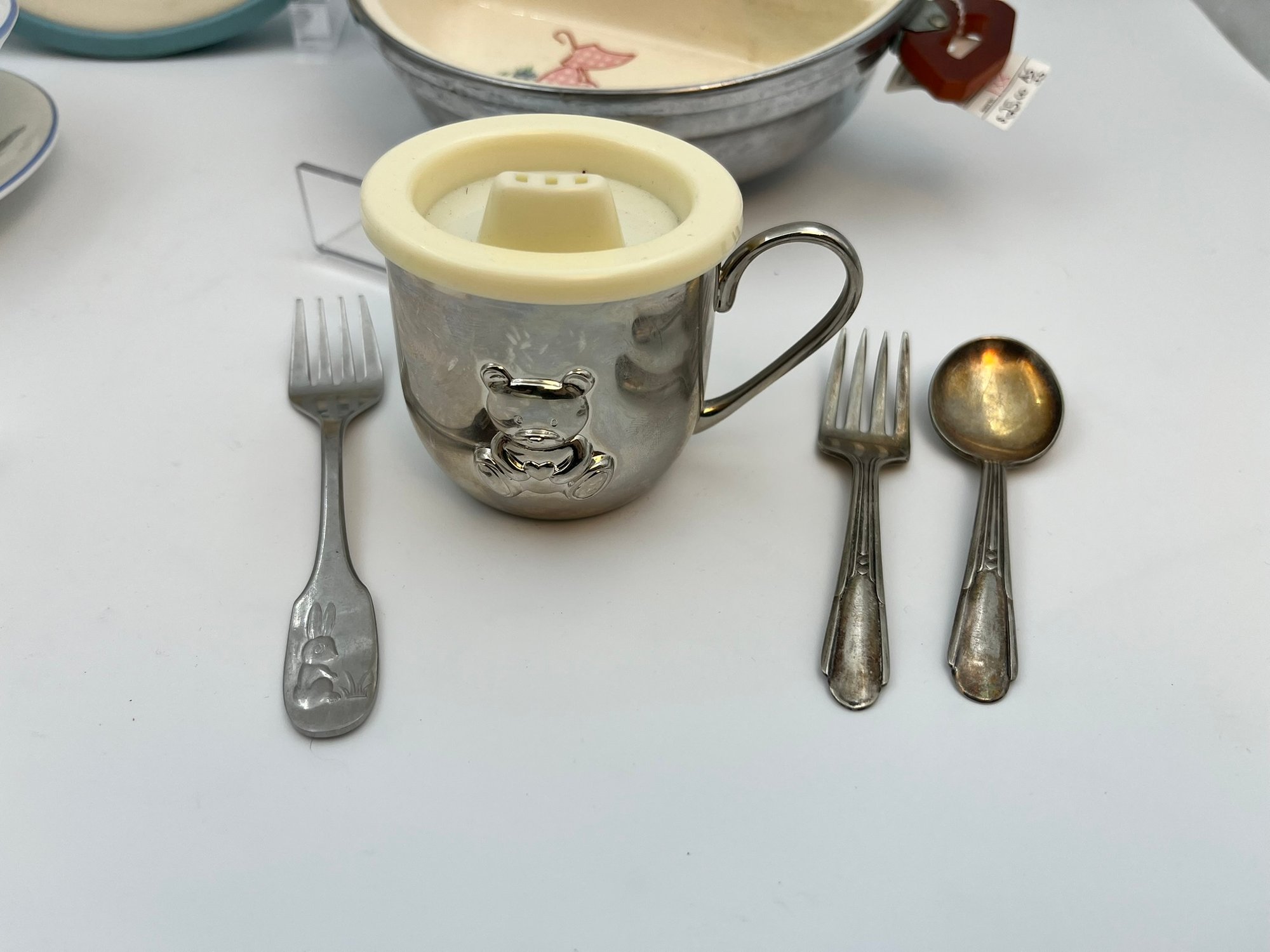 Vintage/antique: 2 Exello baby food warmer ceramic bowls, silver plated fork spoons, and sippy cup, Peter Rabbit mug, 1970's rattle and pacifier, "Mr. Mouse" bone china plate, bowl, and cup.