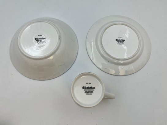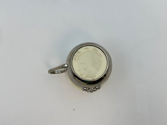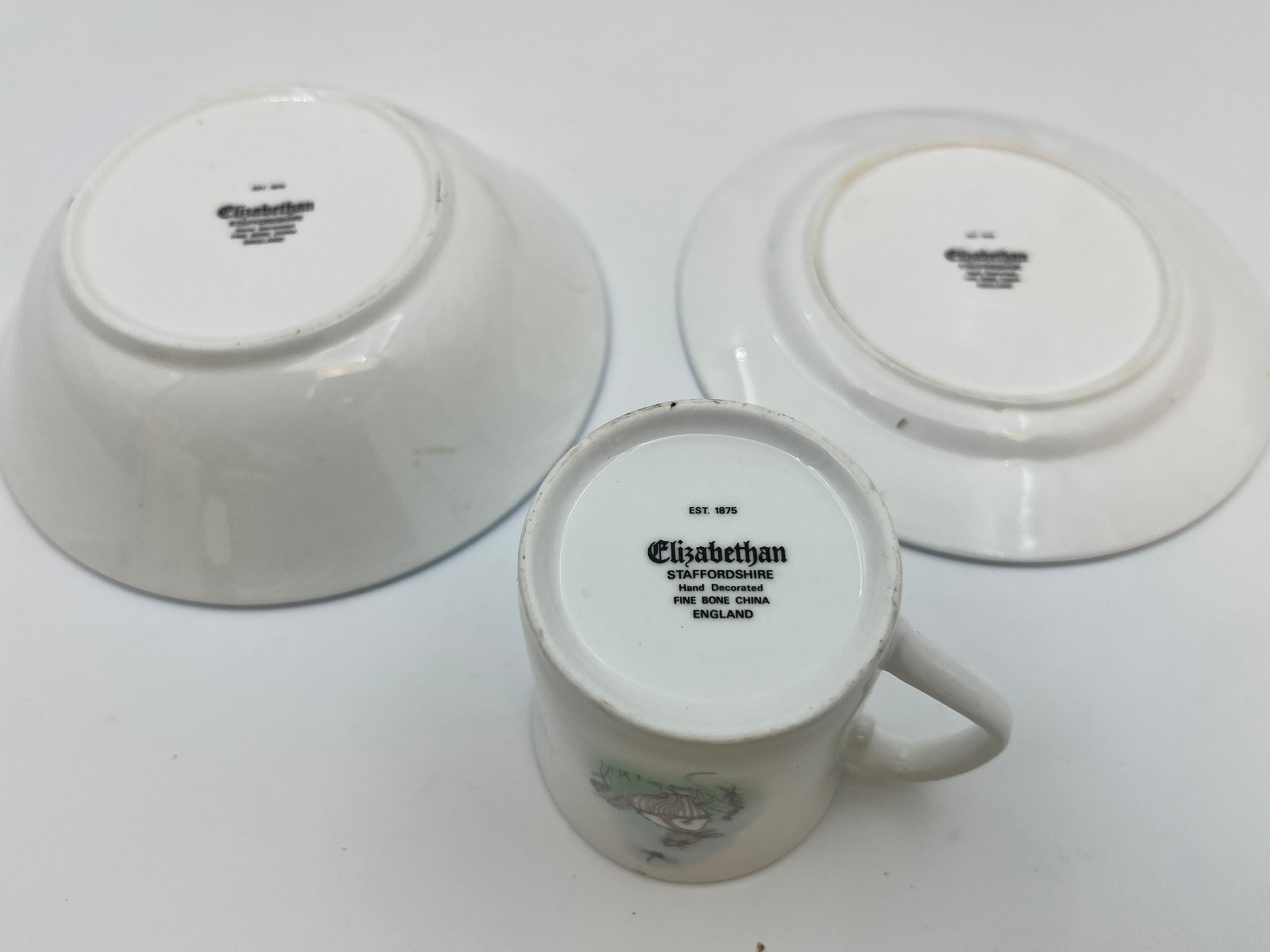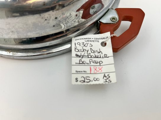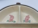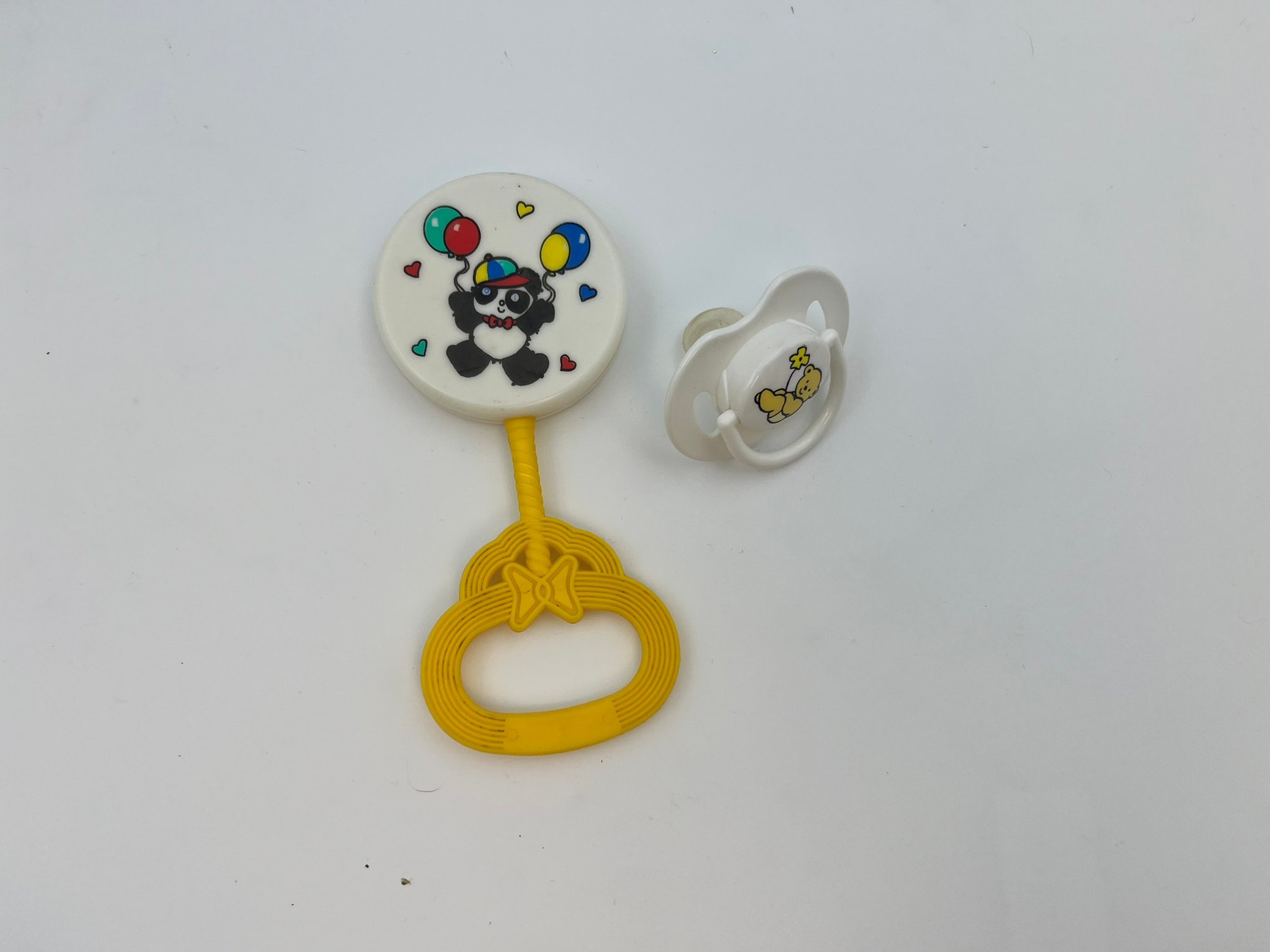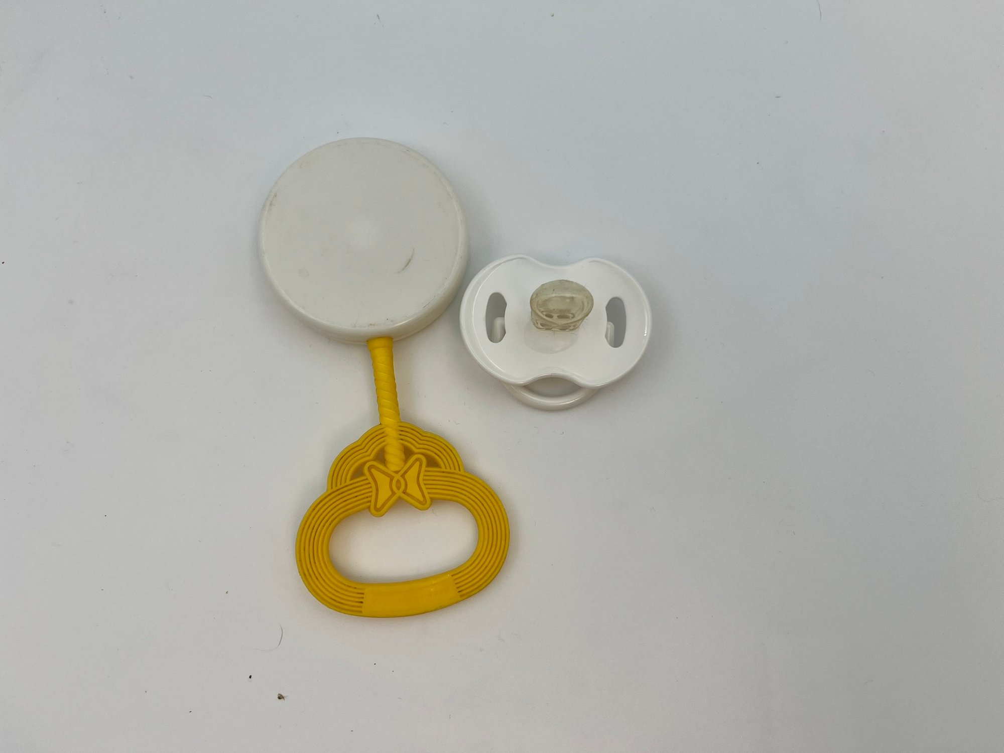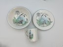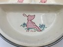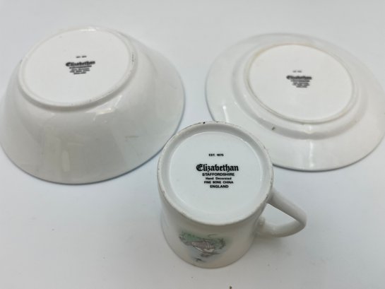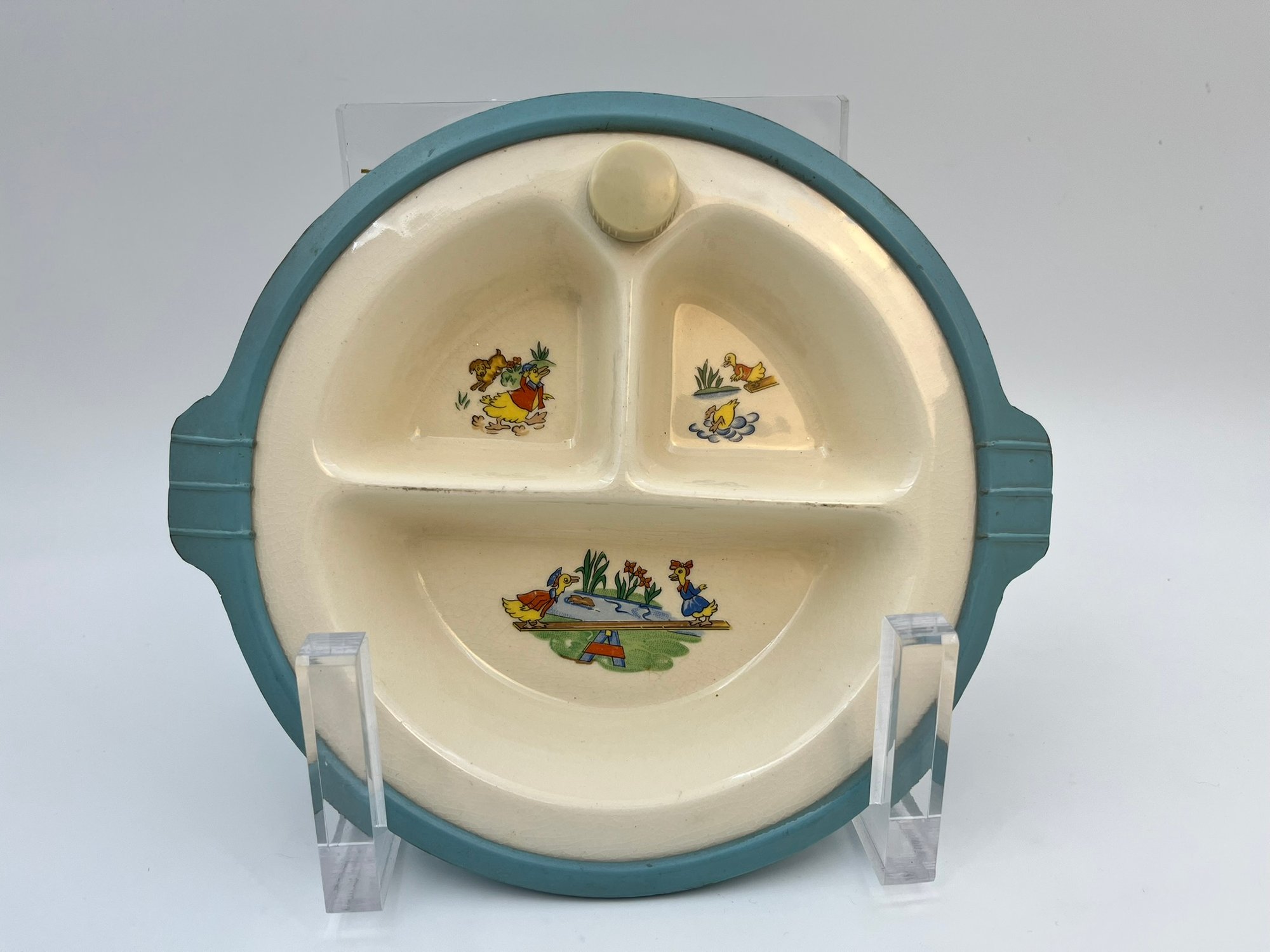 Vintage/antique: 2 Exello baby food warmer ceramic bowls, silver plated fork spoons, and sippy cup, Peter Rabbit mug, 1970's rattle and pacifier, "Mr. Mouse" bone china plate, bowl, and cup.
