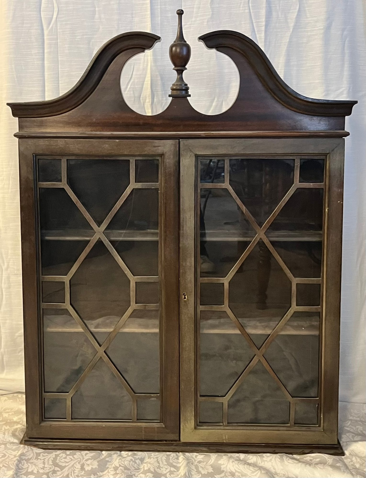 Vintage Cron-Kills Co. secretary bookcase. Glass and details are in tact, just needs a little love! No key/latch for doors. Piece must be level so doors stay shut. Approx 40"h x 30.75"w x 9.5"deep.