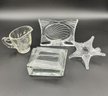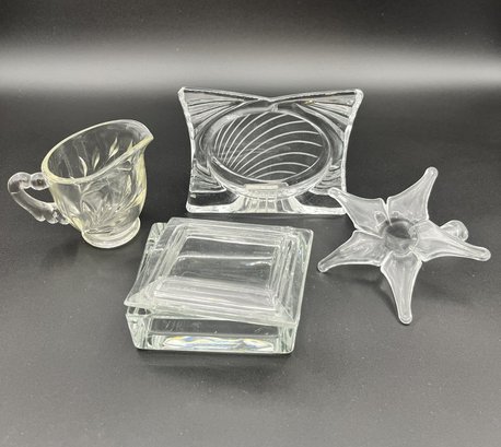 Four piece collection of glass and crystal: Mikasa "Essence" 4.5". Glass (possibly crystal) box with lid, hand blown, clear glass star vase, and Vintage Indiana Glass Creamer Willow Leaf Pattern Oleander Magnolia,