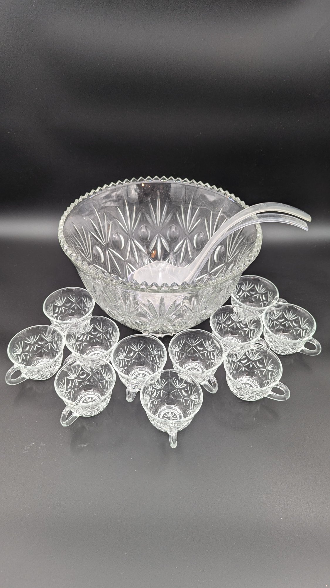 Punch bowl 11" diam x 7.5" and 11 coordinating punch glasses. 2 plastic ladles.