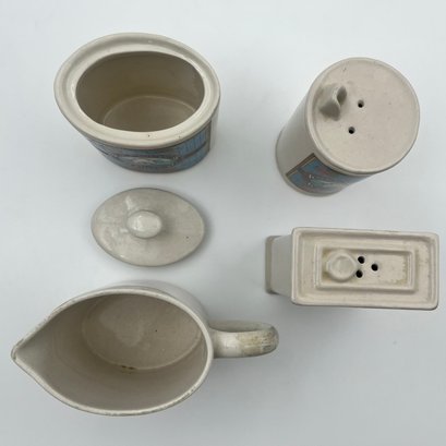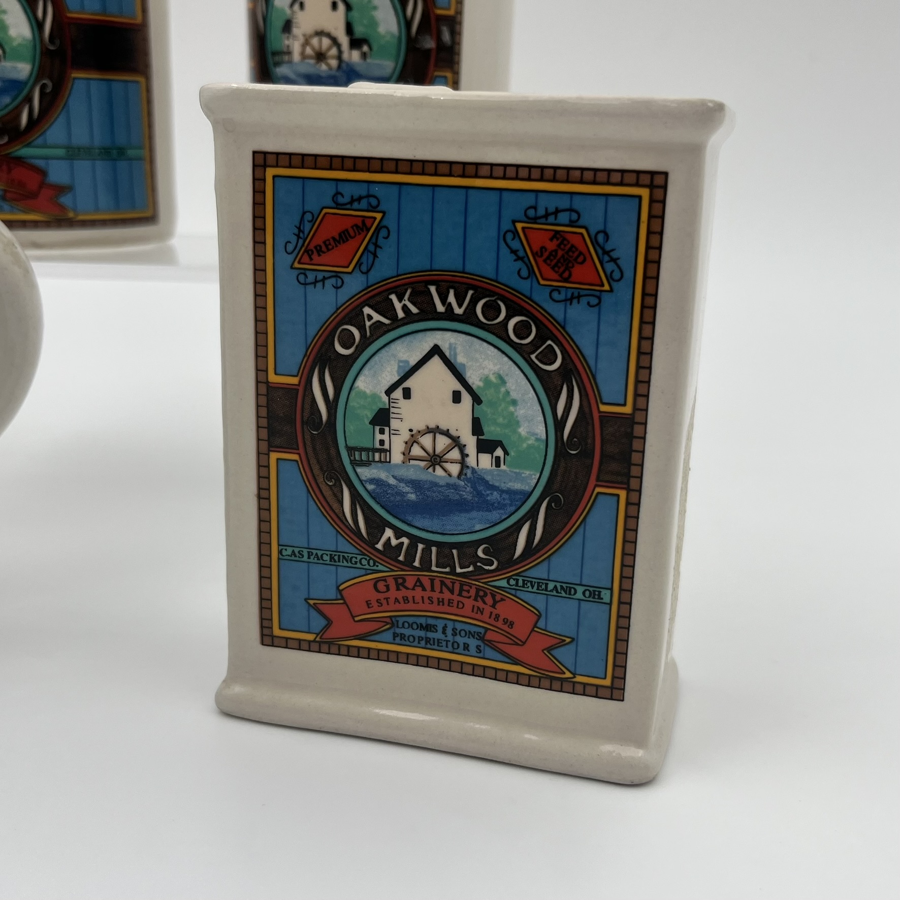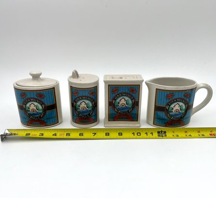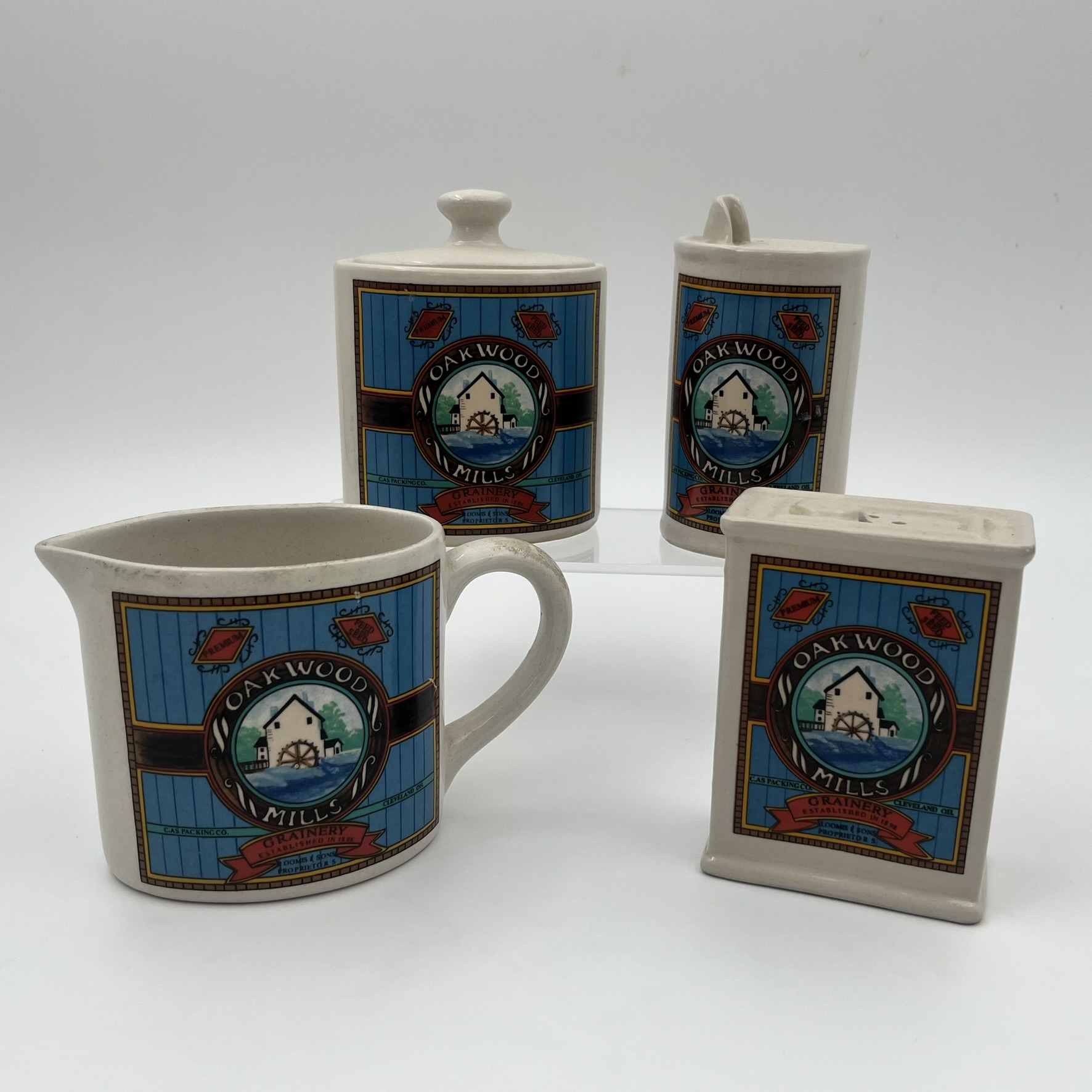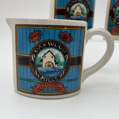 Vintage Hermitage pottery Oakwood Mills Grainery kitchenware: Salt & pepper shakers, sugar container, and creamer.