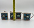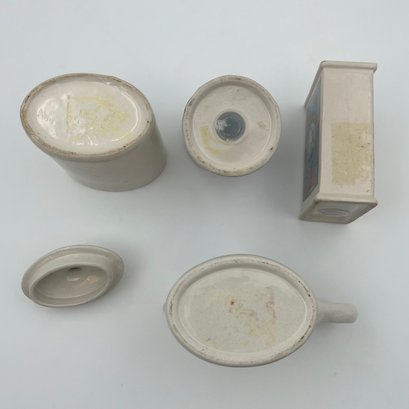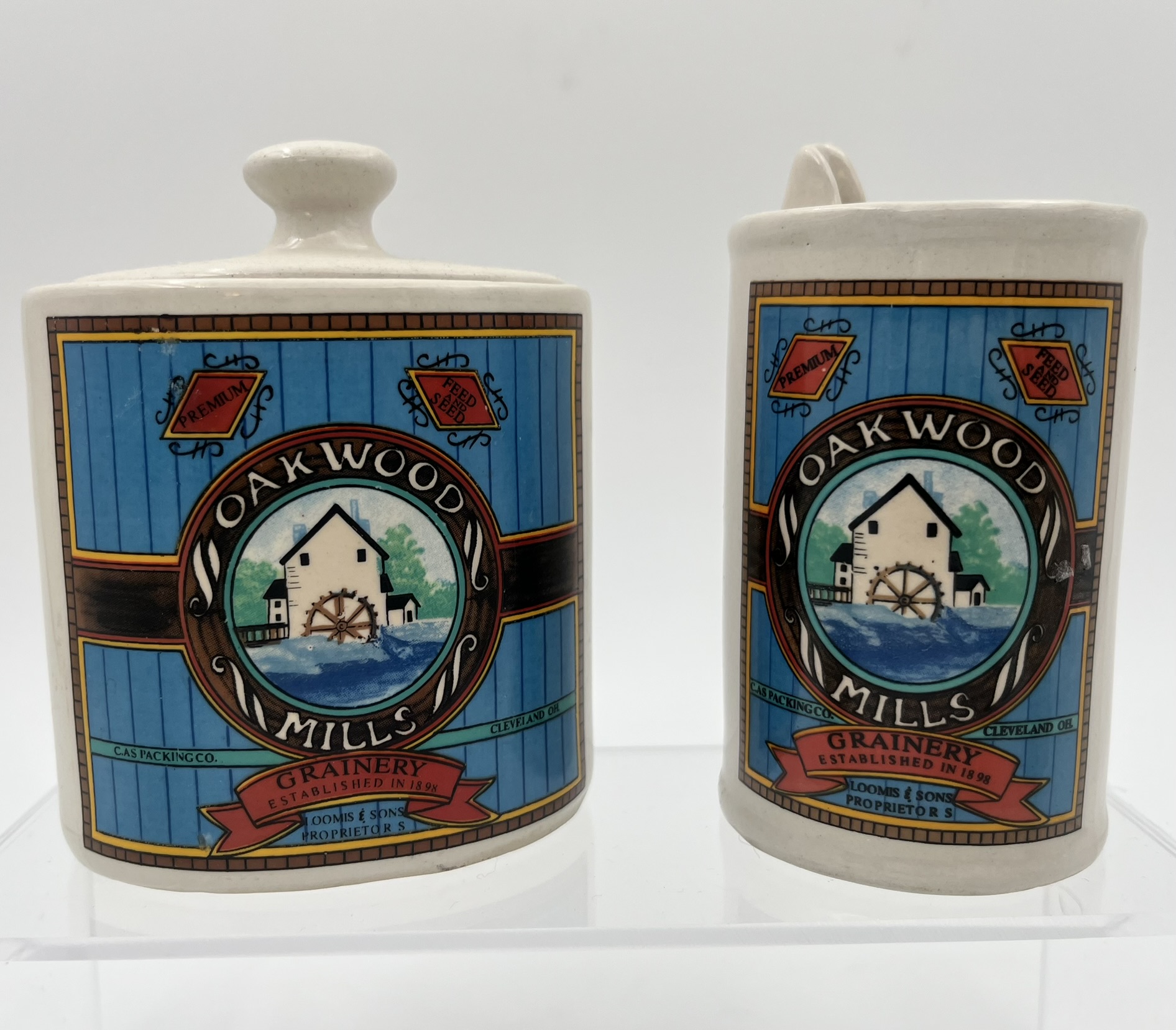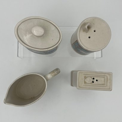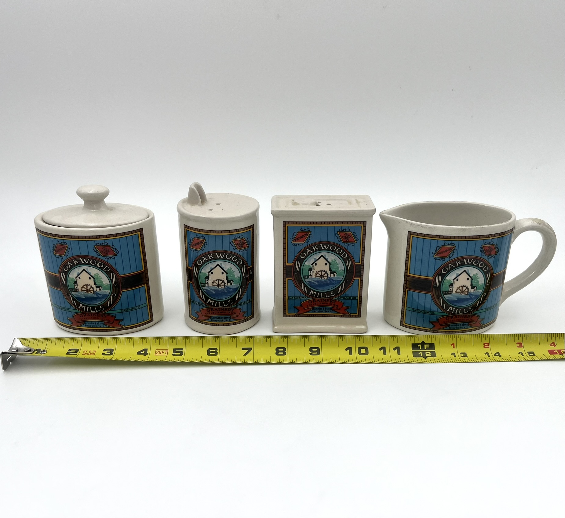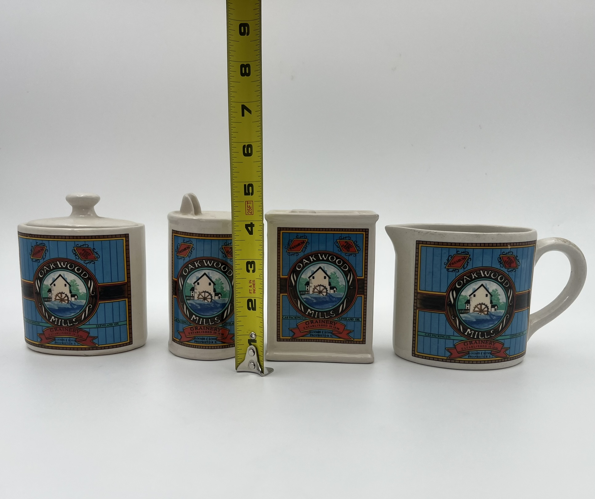 Vintage Hermitage pottery Oakwood Mills Grainery kitchenware: Salt & pepper shakers, sugar container, and creamer.
