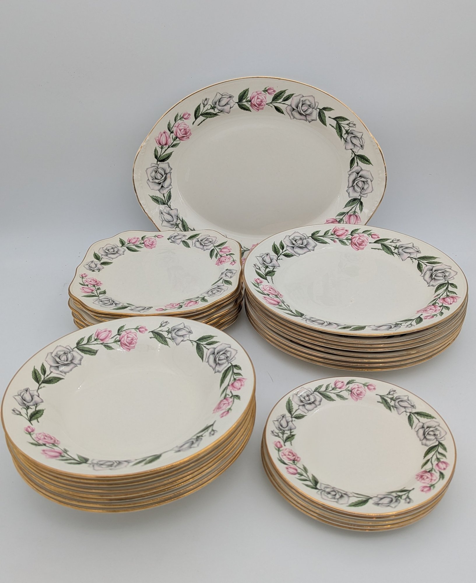 Beautiful Eggshell Nautilus Pink & White Rose China set. Includes; 1 serving platter (13.5" x 8"), 8 dinner plates (10"), 8 salad plates (8"), 8 bowls (8.25"), and 5 small plates (6.25")