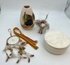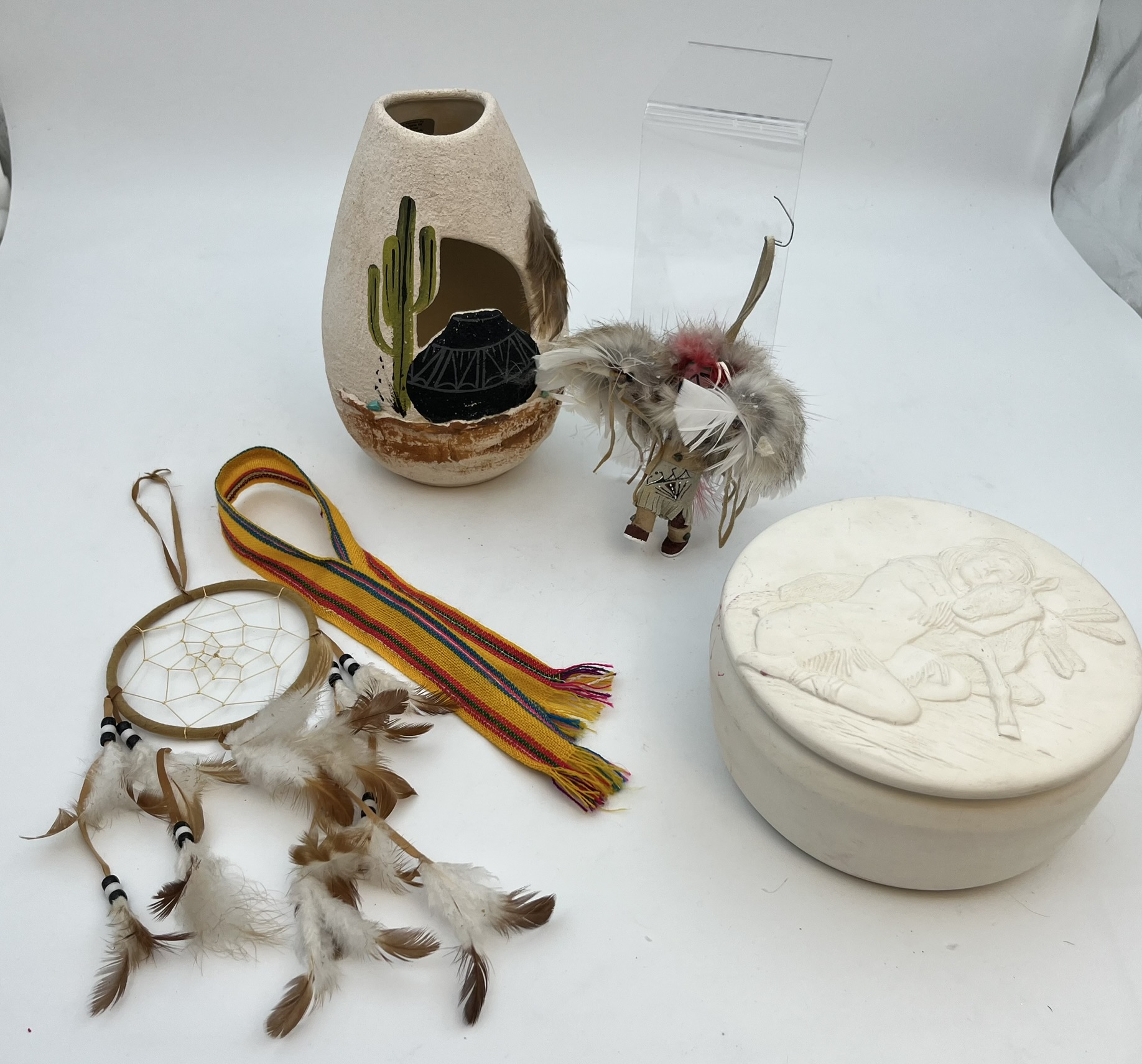Dream catcher, white angel and mule trinket box, vintage handmade doll, and Navajo D..B. hand painted pottery