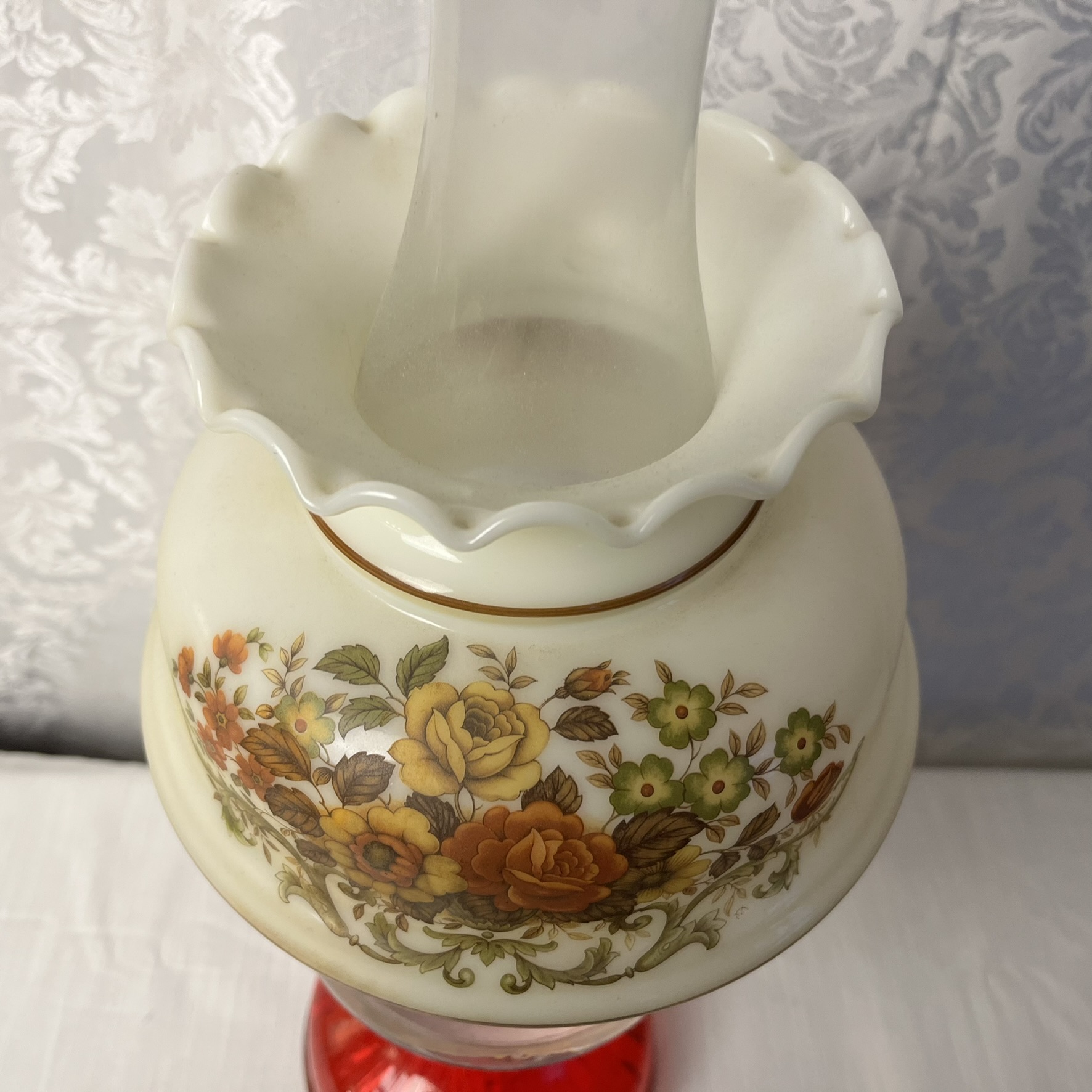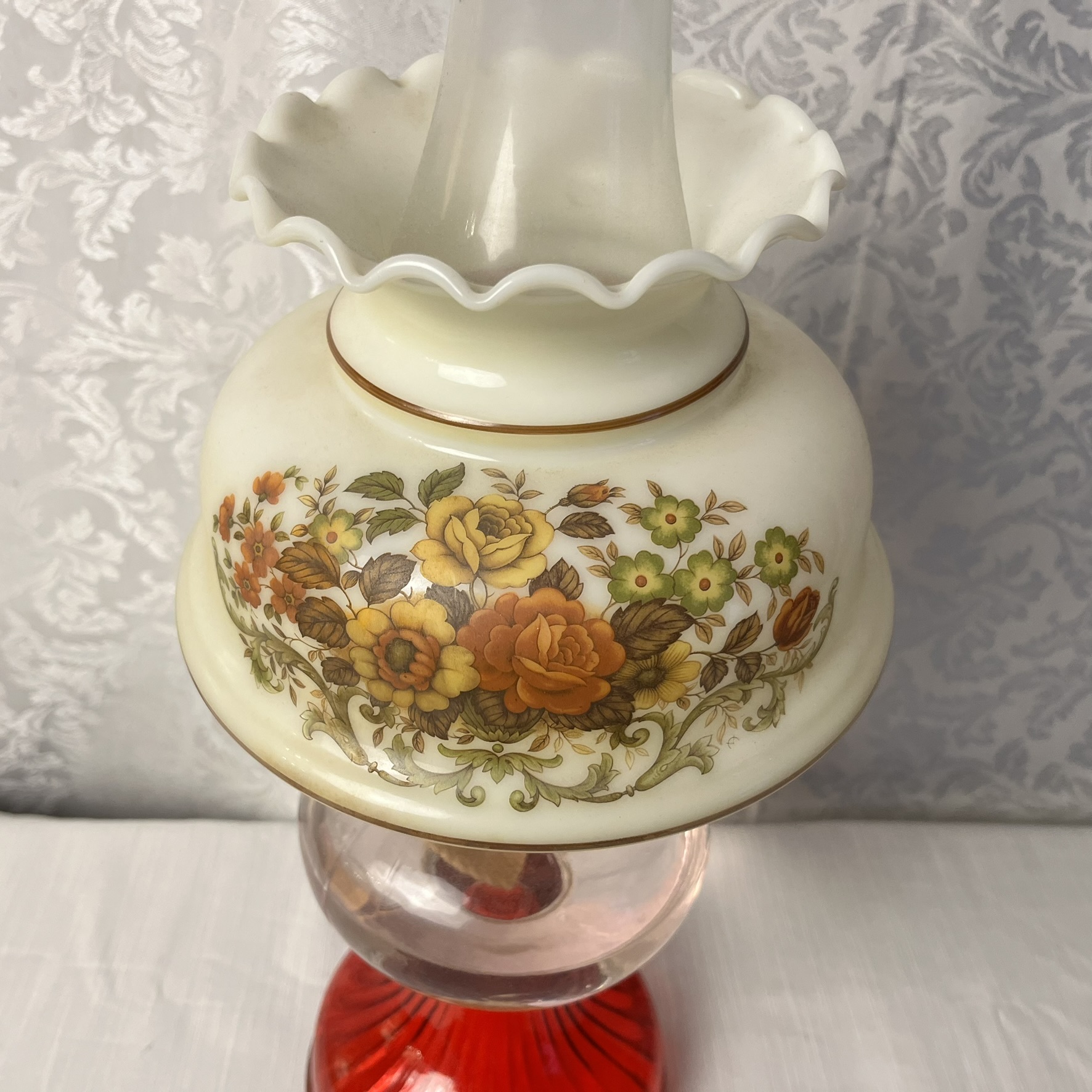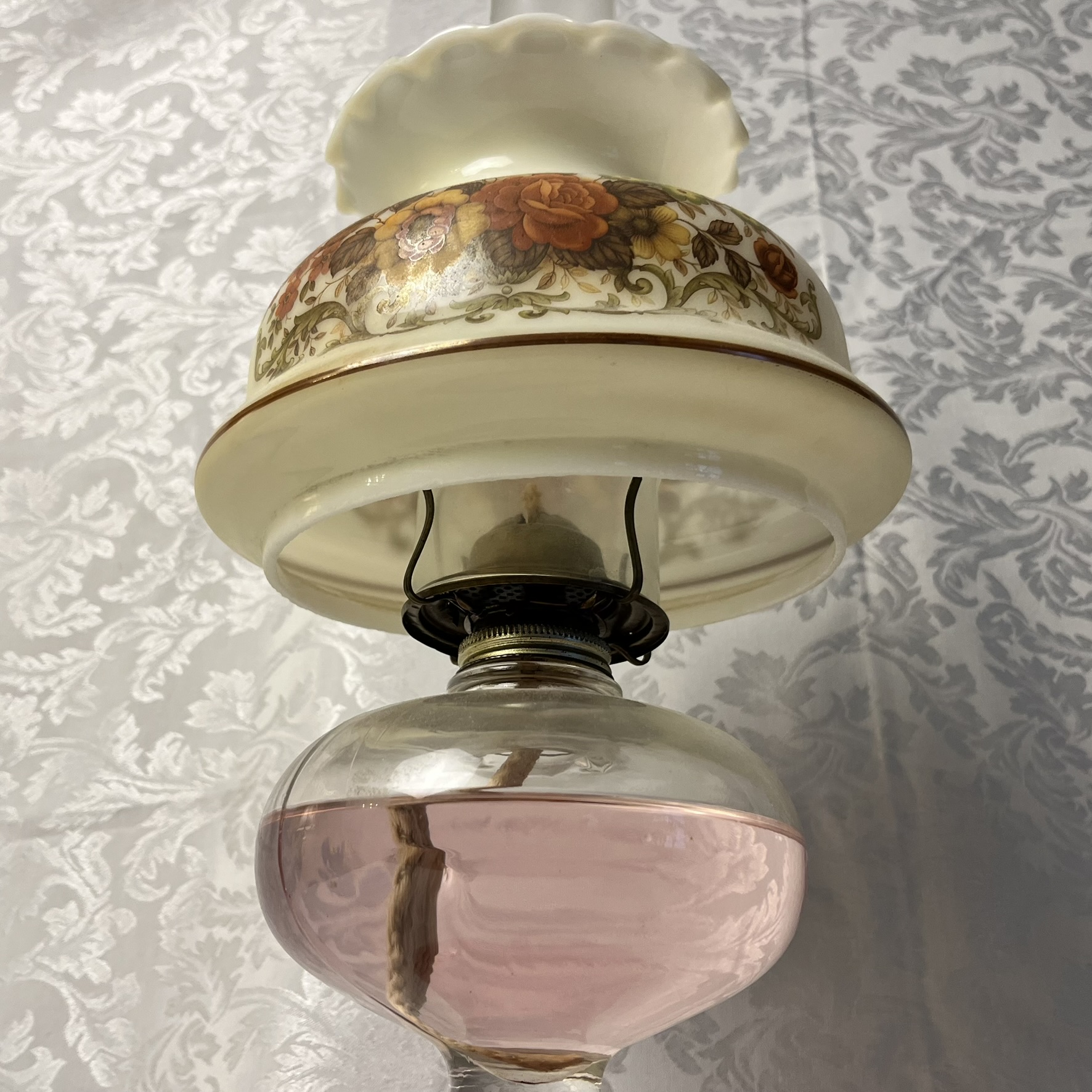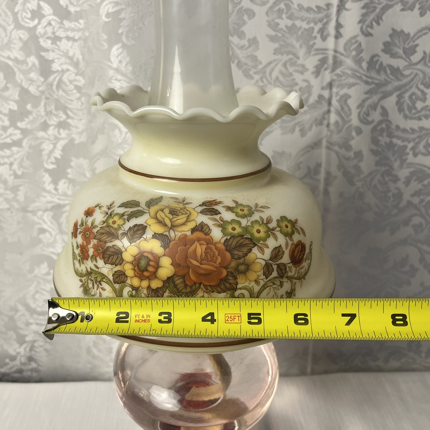 Vintage 1970's hurricane oil lamp. 21" tall x 7" wide Quoizel shade with hand painted flowers