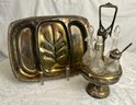 Very unique pieces: Vintage silver plated "Tree of Life" serving tray by B.Rogers Silver Co., and Victorian silver-plated glass cruet set for vinegars and condiments