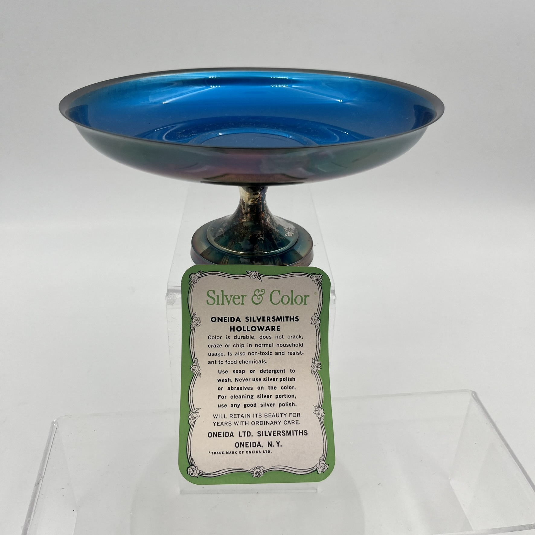 Stunning Vintage Oneida Silversmiths Holloware silverplate with blue color dish.