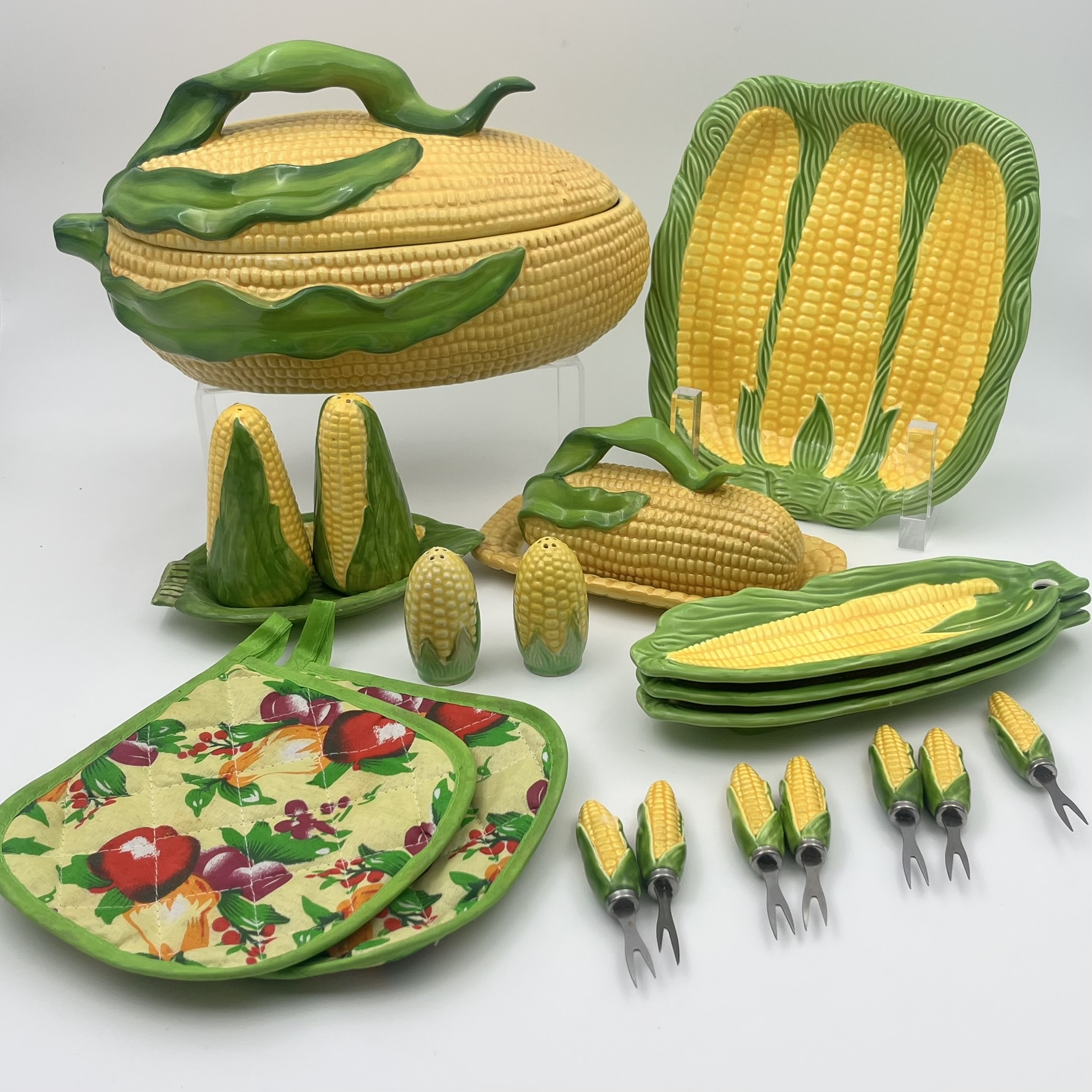 Vintage TEMP-TATIONS Corn-cob kitchen collection: 2-qt bowl with lid, butter dish, salt and pepper shakers, 3.5 pairs of corn cob skewers, additional salt ad pepper shakers and veggie pot holders as bonus