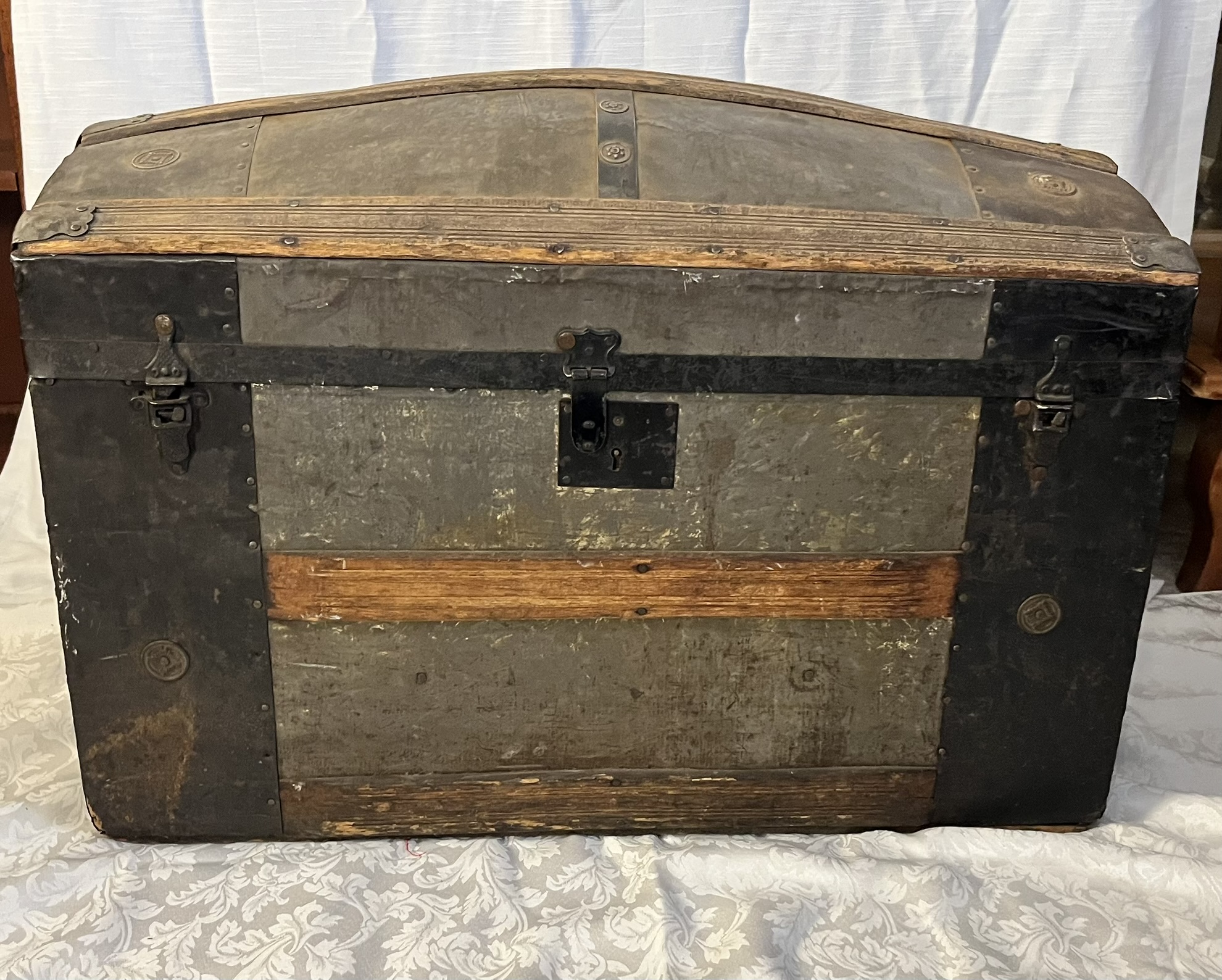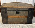 Vintage 2-tone turtle-top trunk with wheels and floral paper lining. Approx 30"w x 15.5"d x 20"high. Cannot find key.