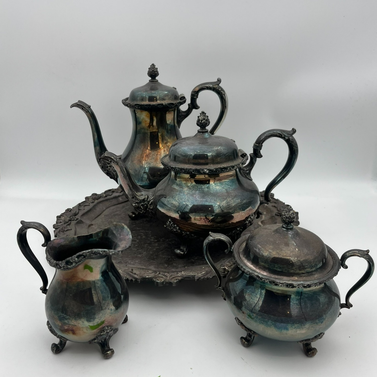 Coffee pot, teapot, sugar bowl, creamer with bonus Gorham Heritage pitcher with one broken foot repaired after photo #8 was taken.