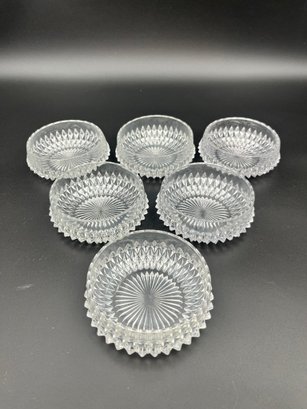 Six Waterford-like Indiana Glass (crystal) wine bottle coasters (or) small fruit/desert bowl with diamond design. 4.5" diameter.