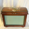 Whimsical Vintage humpback wood chest, hand painted floral design with quilted lining and sliding tray inside. Likely restored Manufacturer unknown. Approx 9"w x 12"d x 16"h.