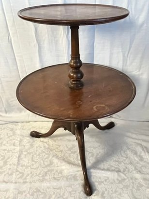 Vintage/antique wood dumbwaiter 2-tiered round table. Beautiful details intact. See photos for condition. Approx 30"high x top tier 17"diam x bottom tier 23.5" diam.