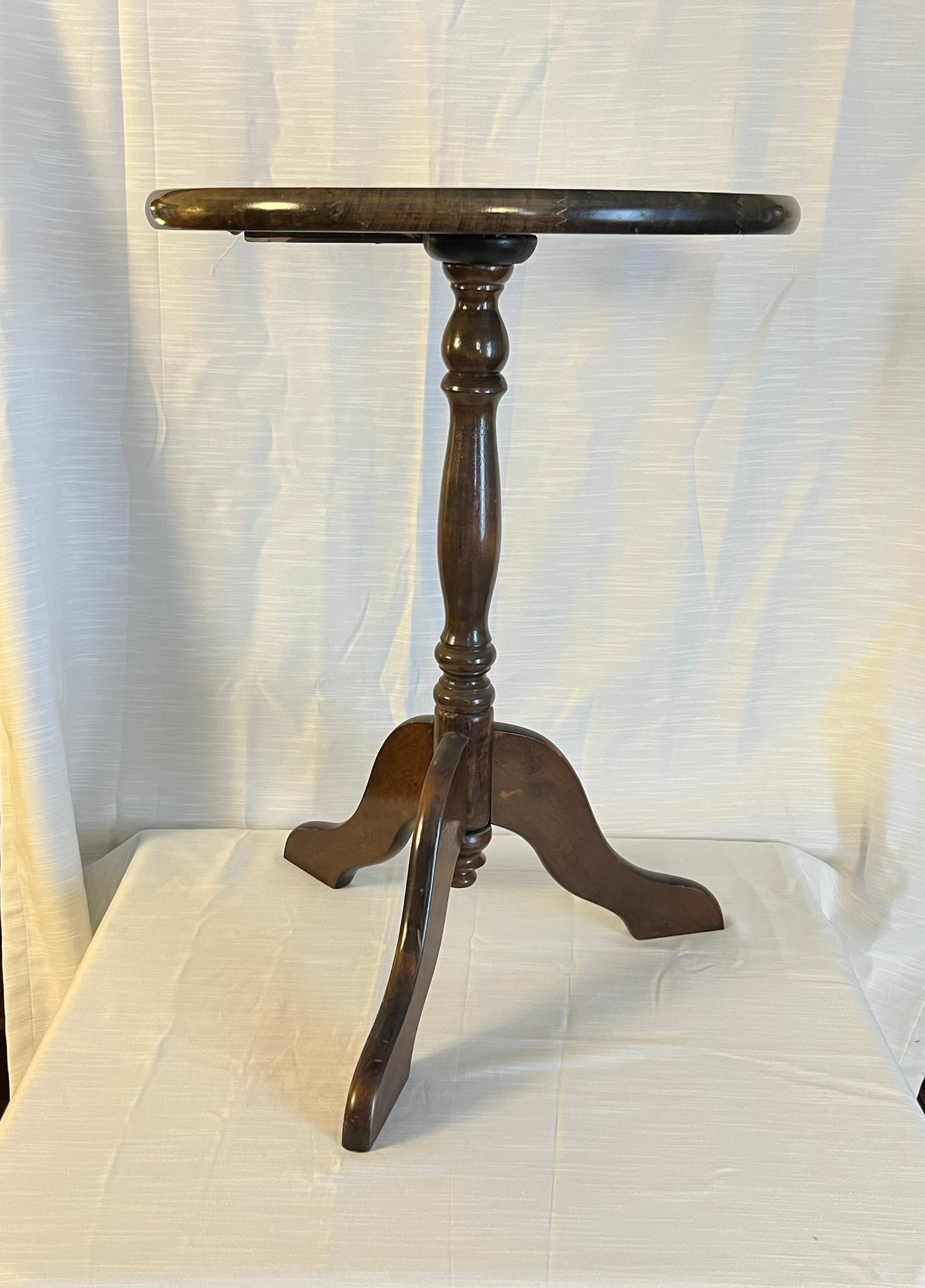 Vintage wood side table with 3-legged base. Missing drawer (see photo). Would be a wonderful restoration or upcycle project. Approx 18" diam x 24.5" h.