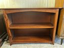 Wood 2-shelf bookcase. Maker unknown with finished back. No significant scratches and overall very good condition. Approx 39.5"w x 13"d x 29.5"h