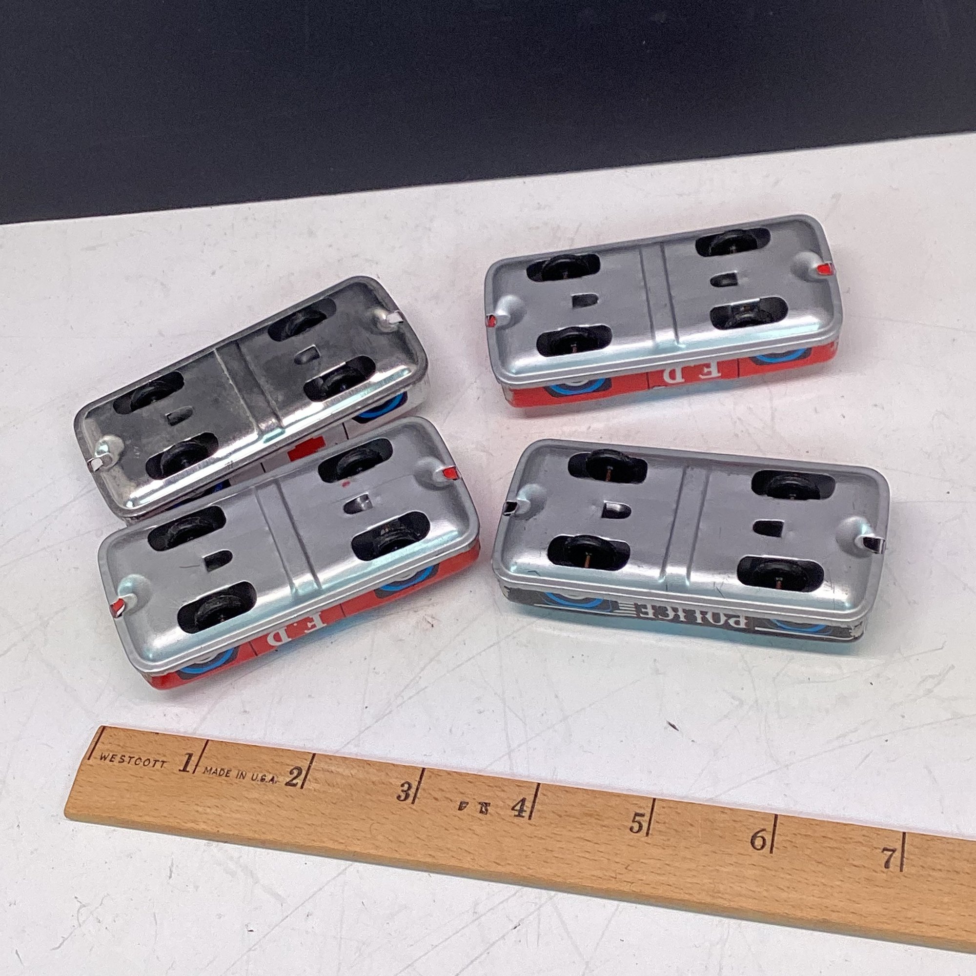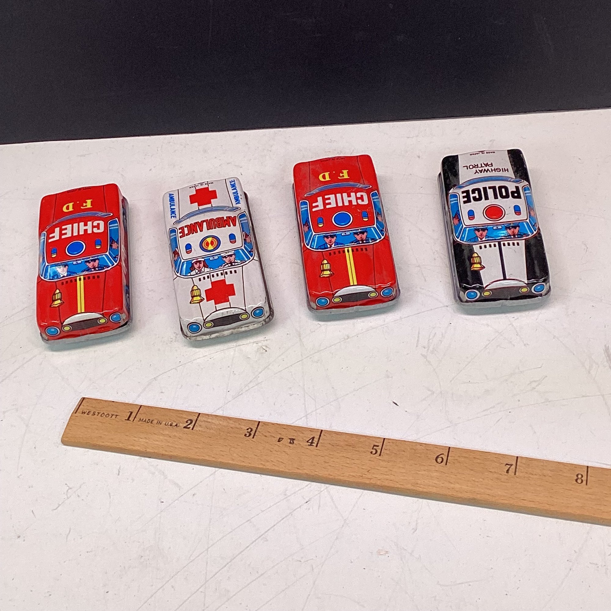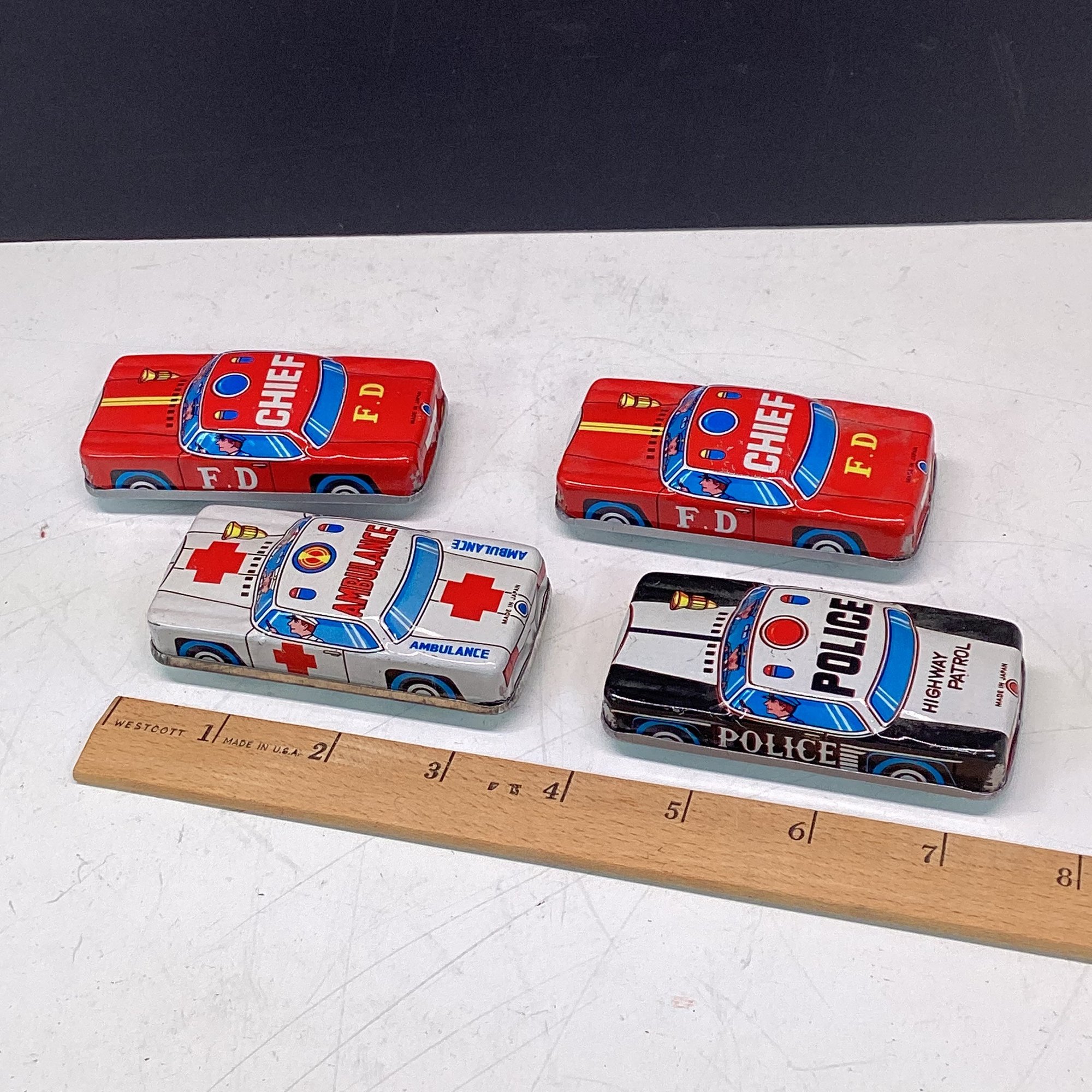 4 Smaller Vintage Tin Litho Cars, Police, Fire, Etc. Great Condition