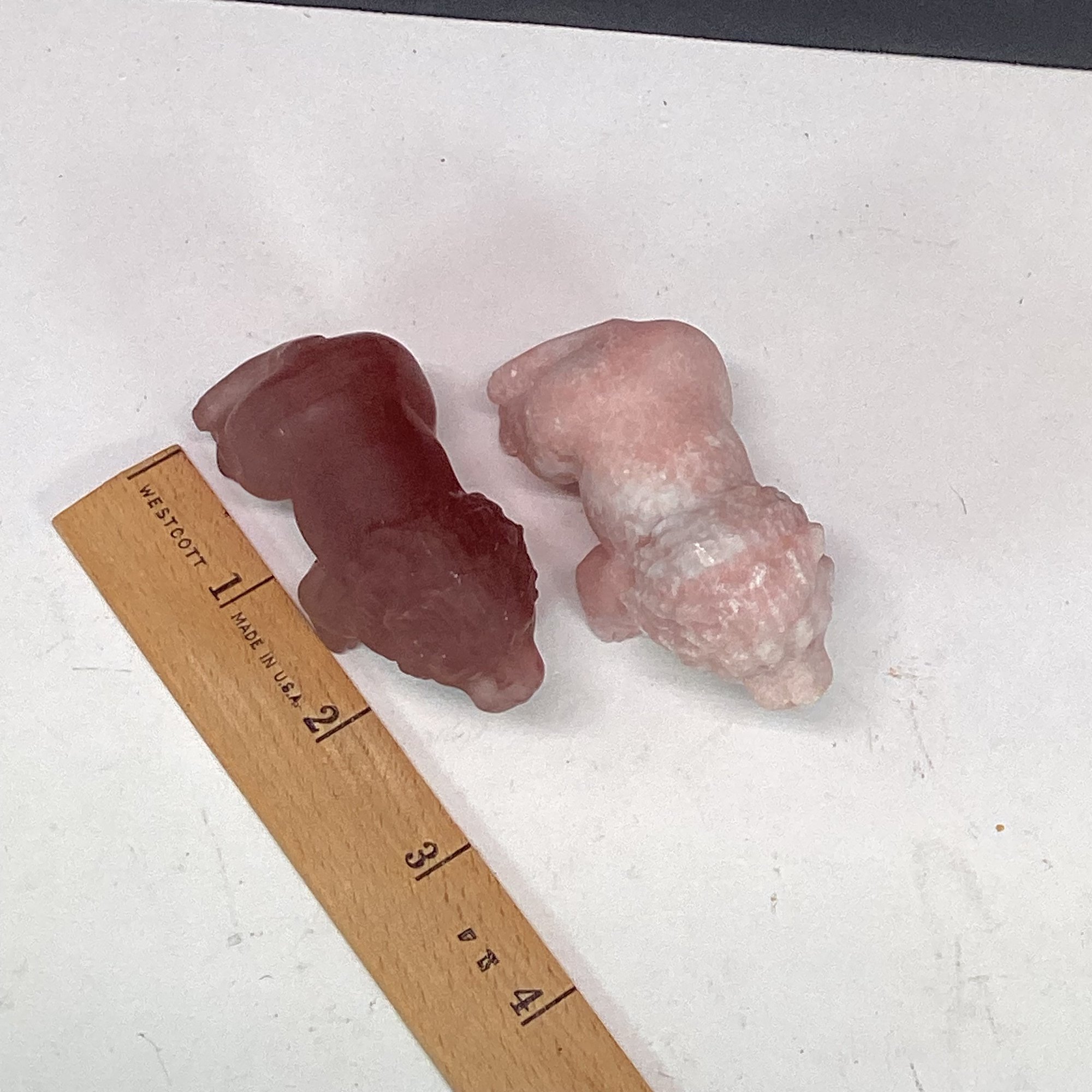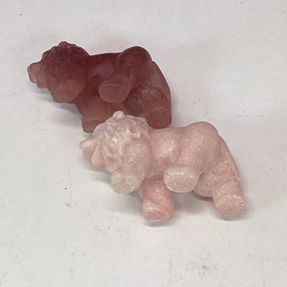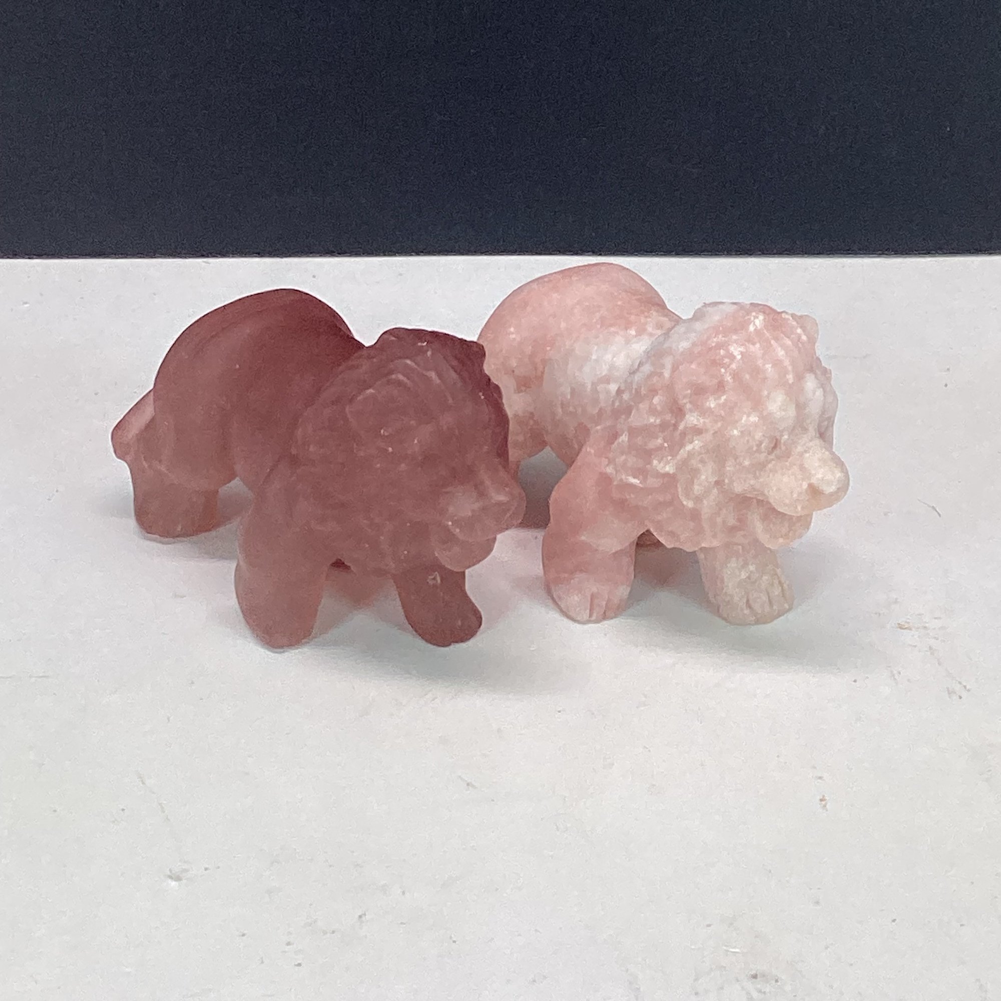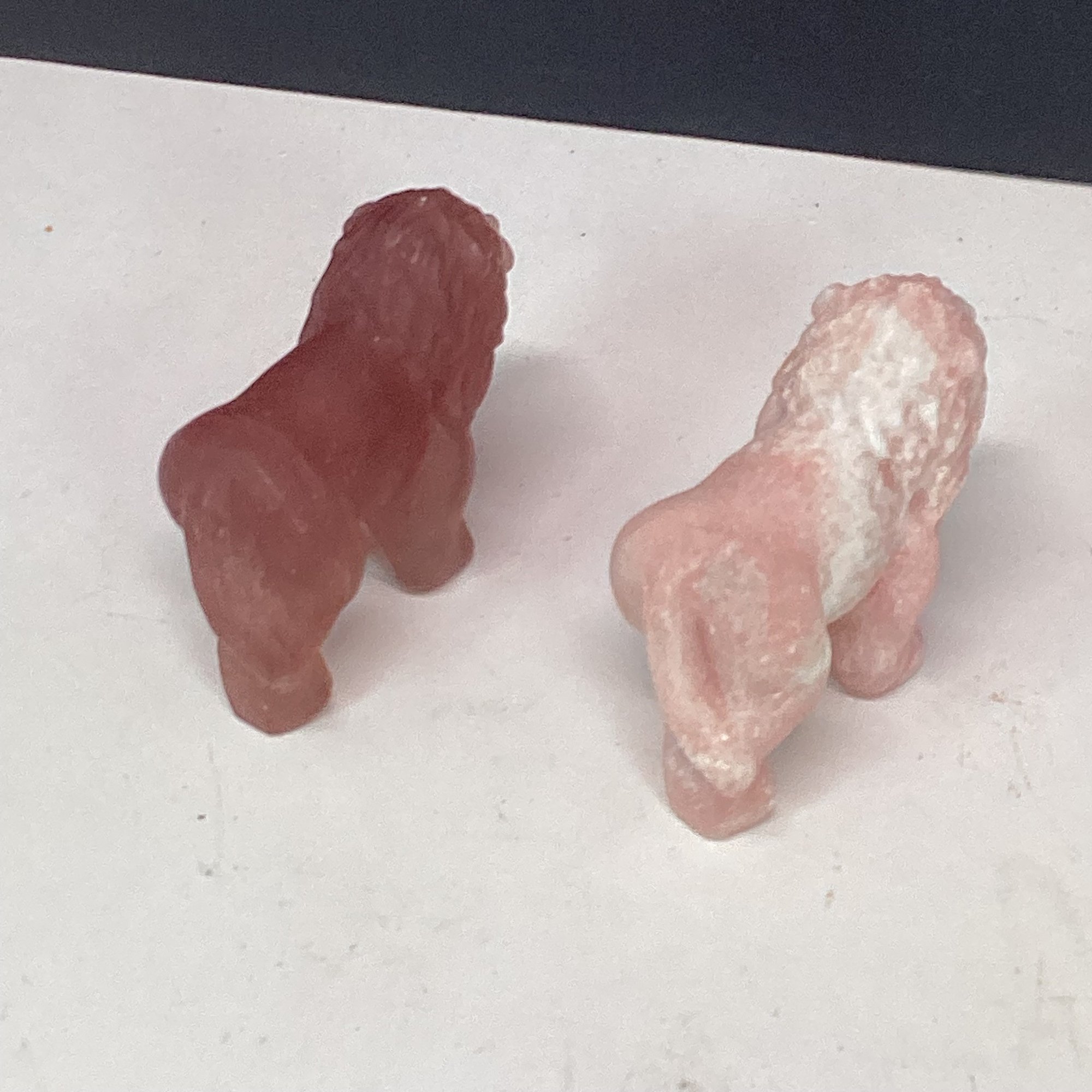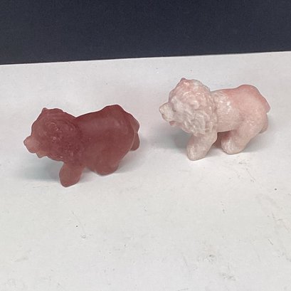 Pair Of Carved Stone Lion Statues, Genuine Pink Opal And Strawberry Quartz