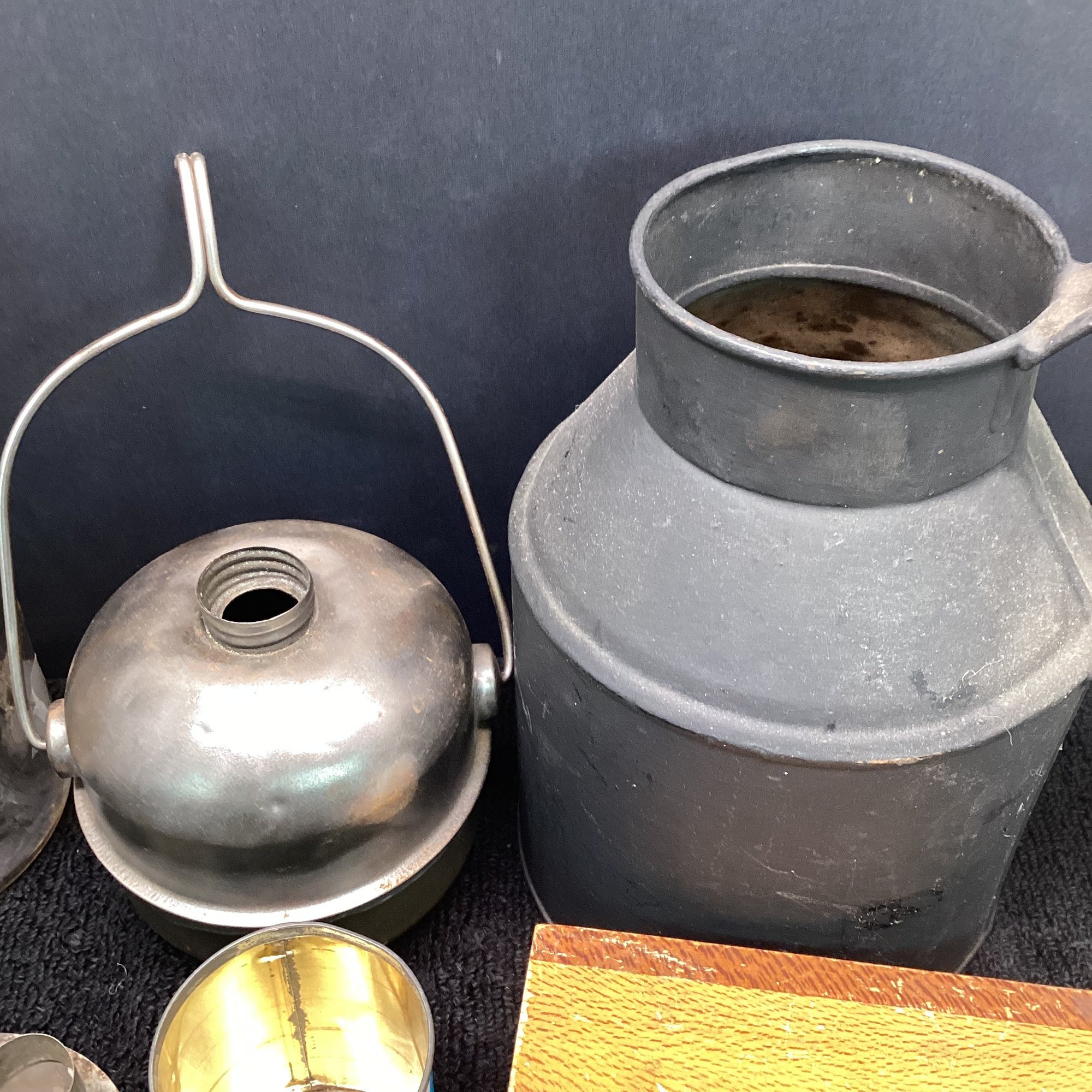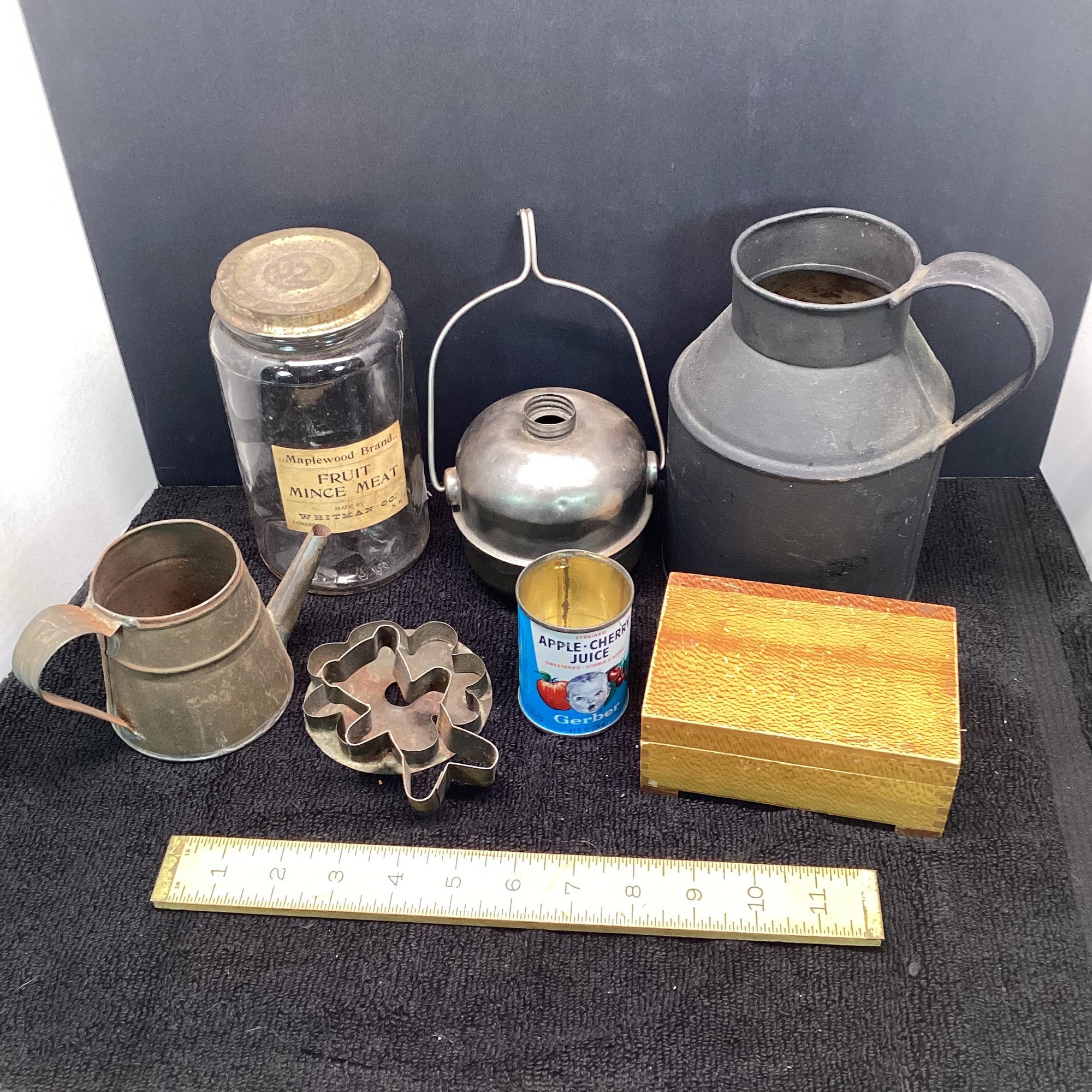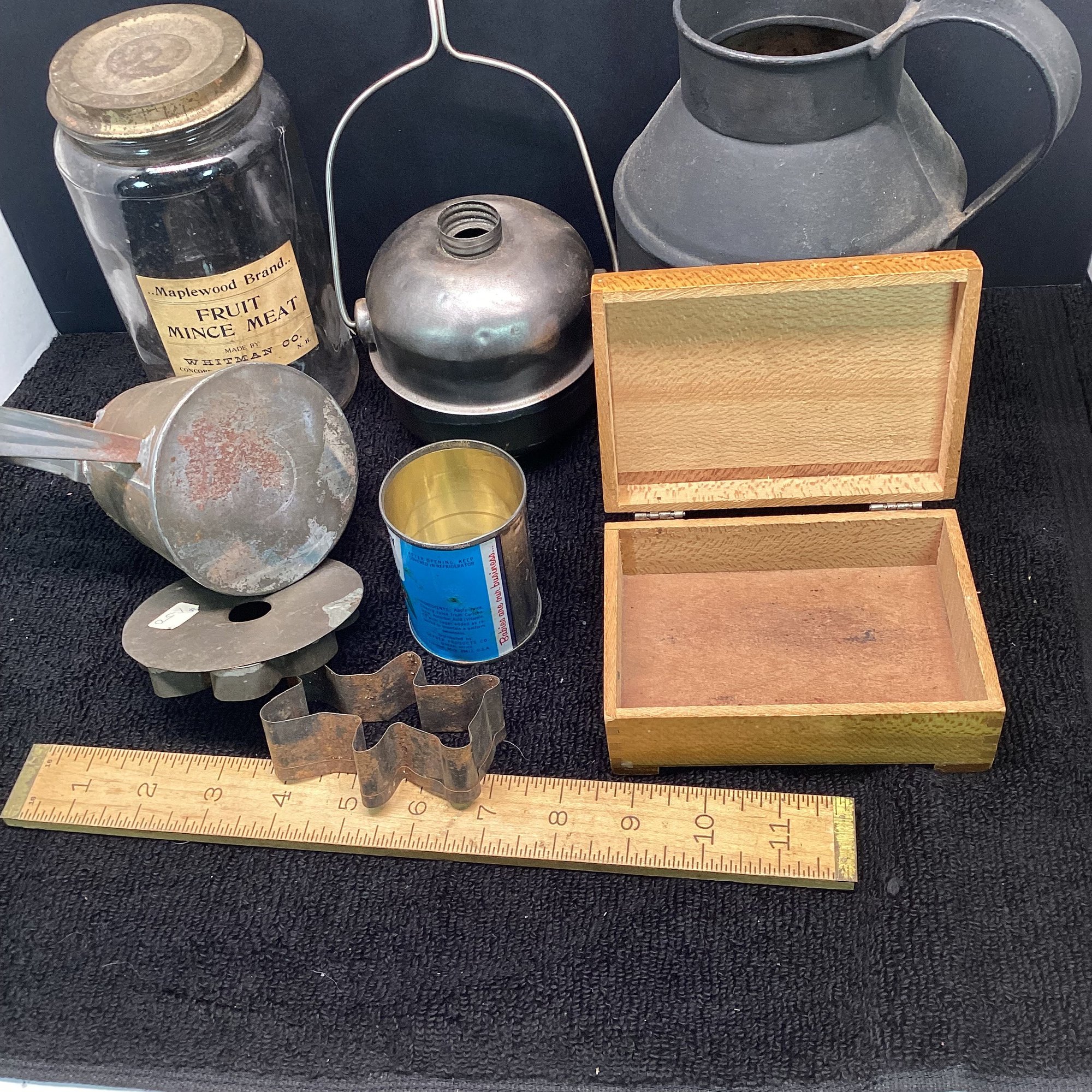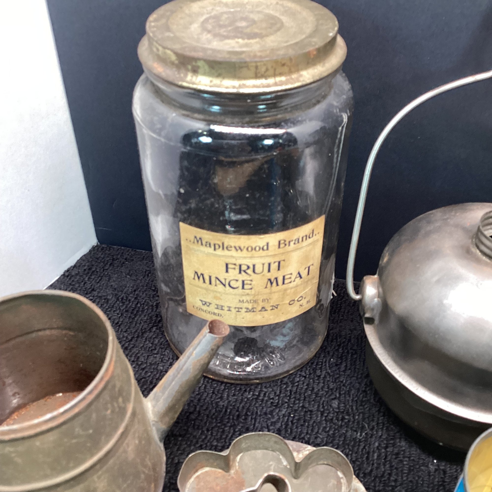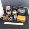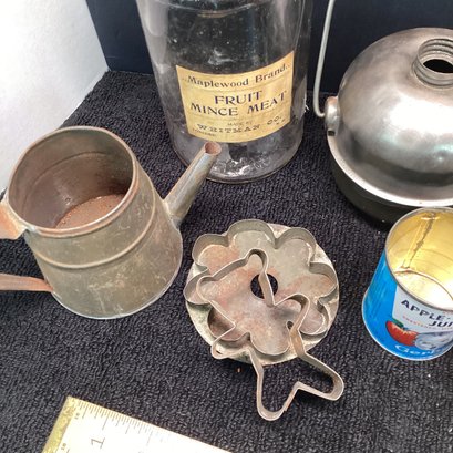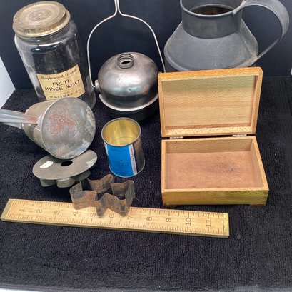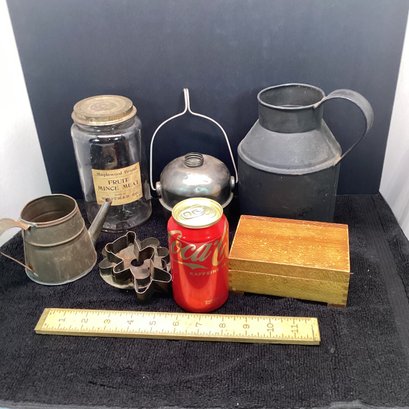 Antique And Primitives Lot, Mince Meat Jar, Tin Ware, Box, Etc.