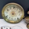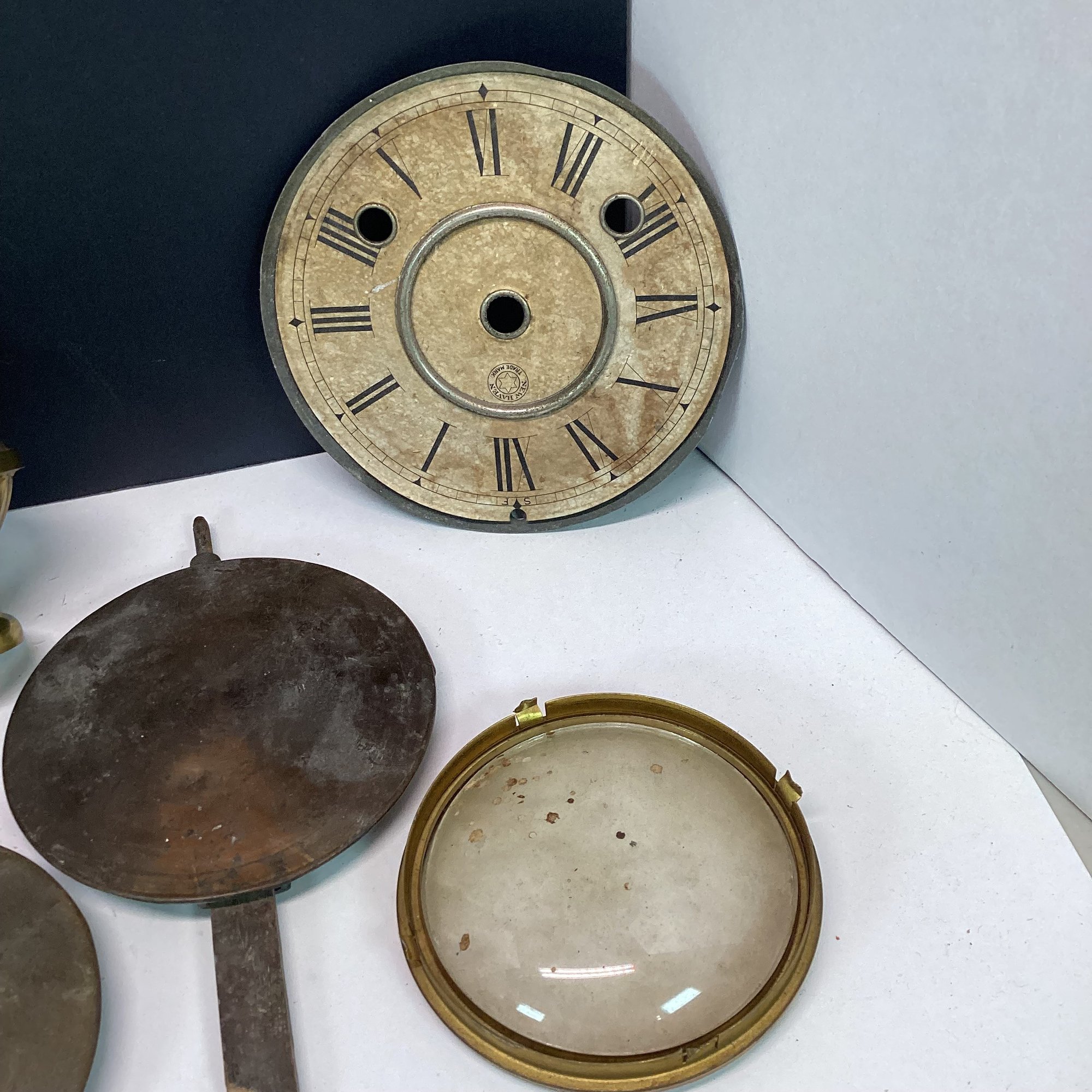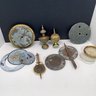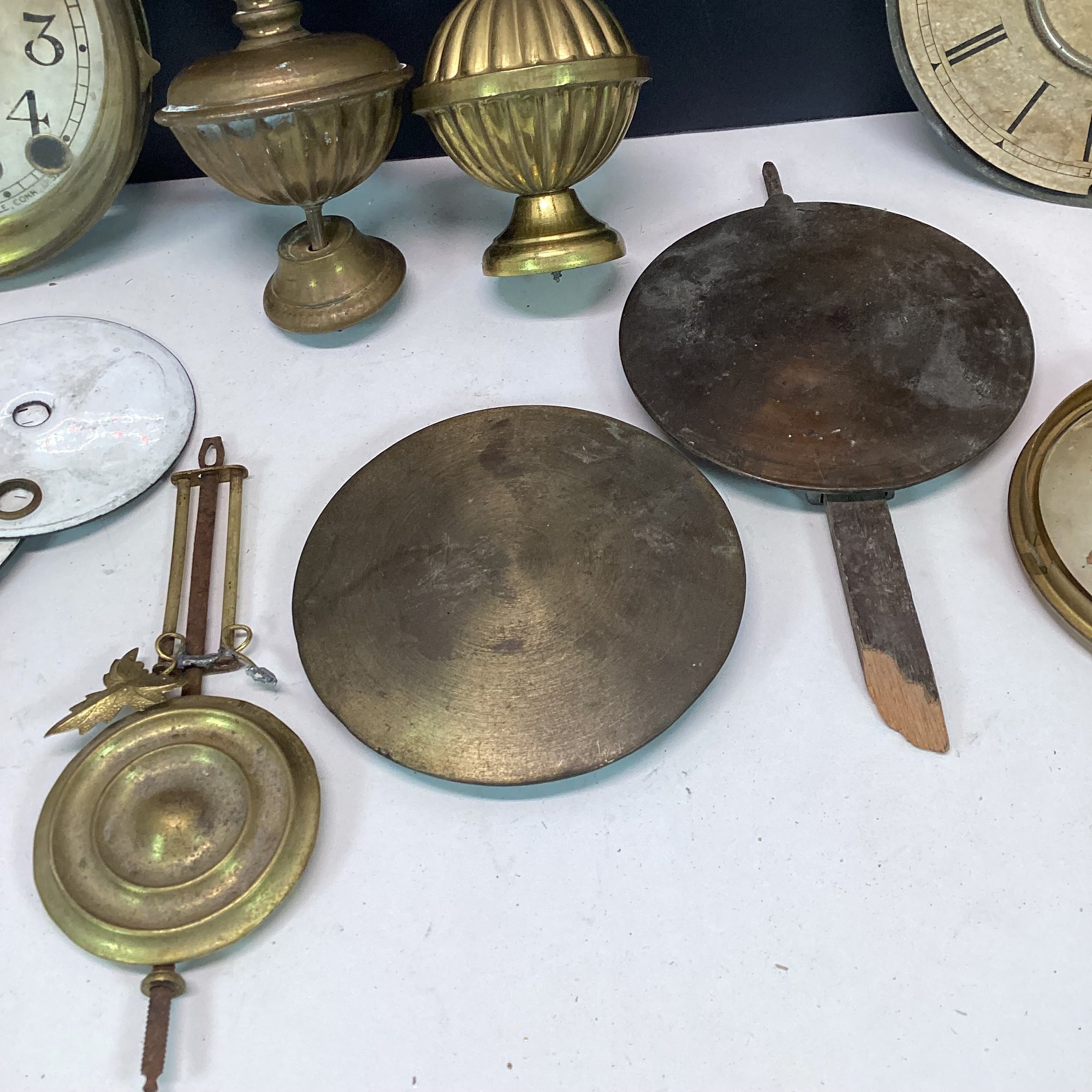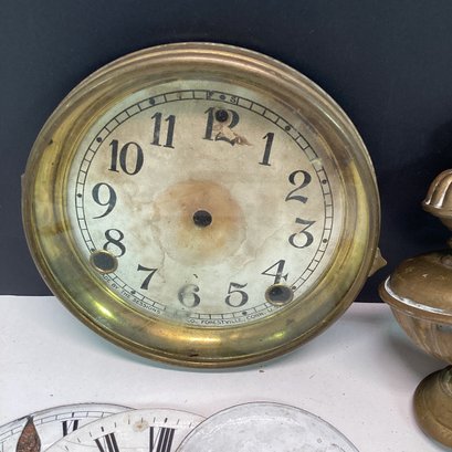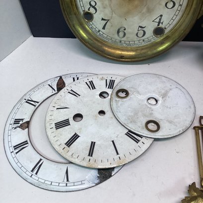Antique Clock Parts Lot, Clock Faces, Pendulums, Brass Finials, Etc
