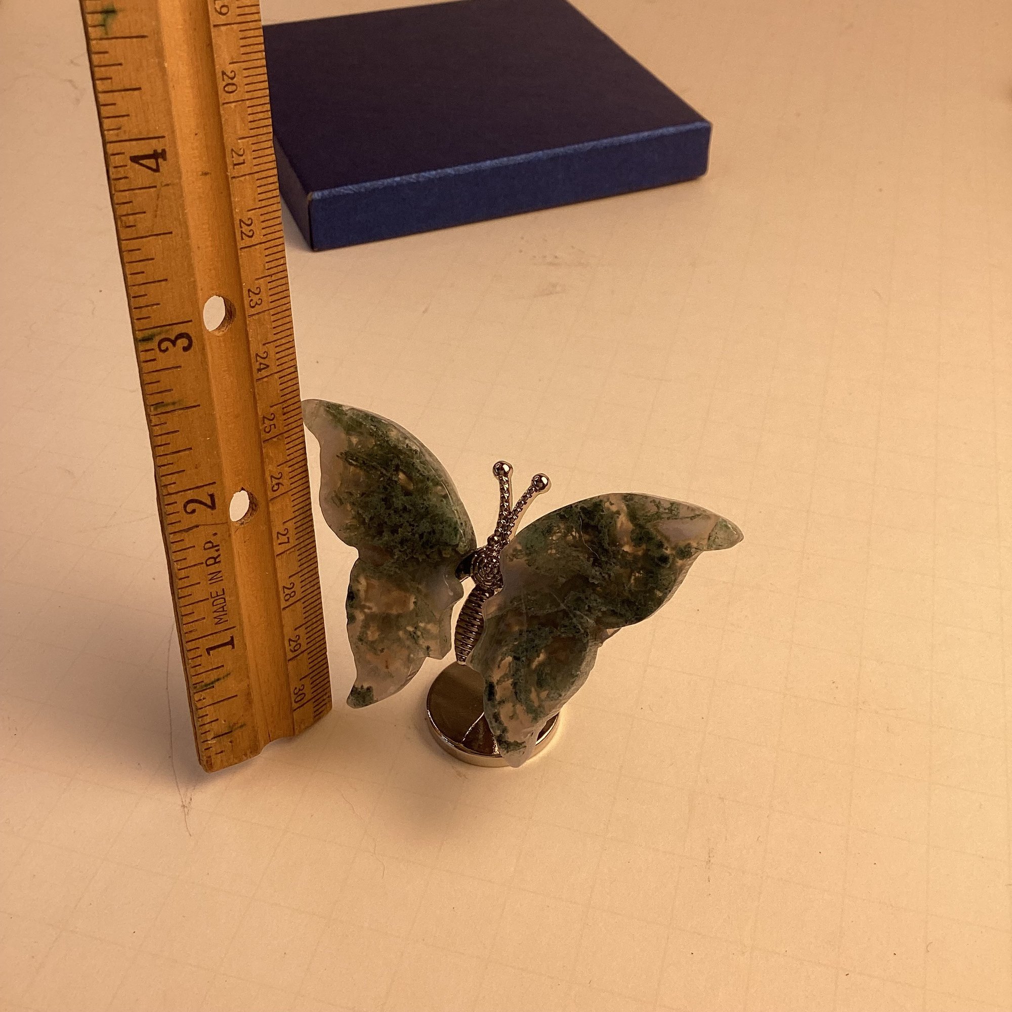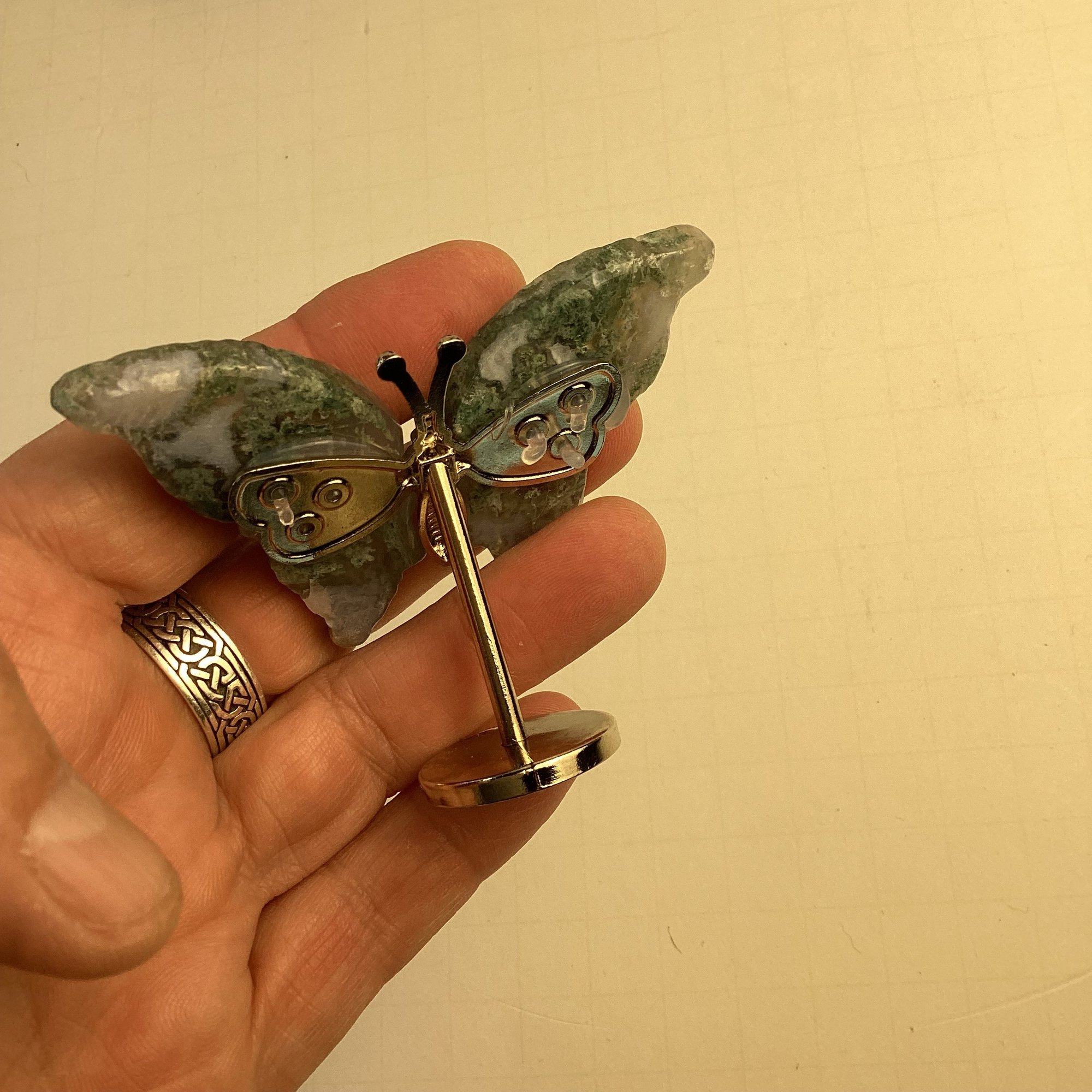 Natural Stone Butterfly Carving, Moss Agate Wings, Metal Stand