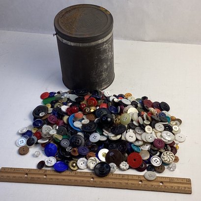 Big Lot Of Vintage Buttons In Old Tin Coffee Can, Many Sizes