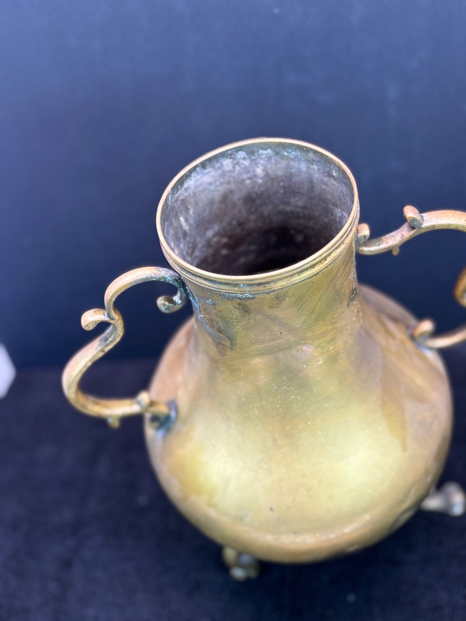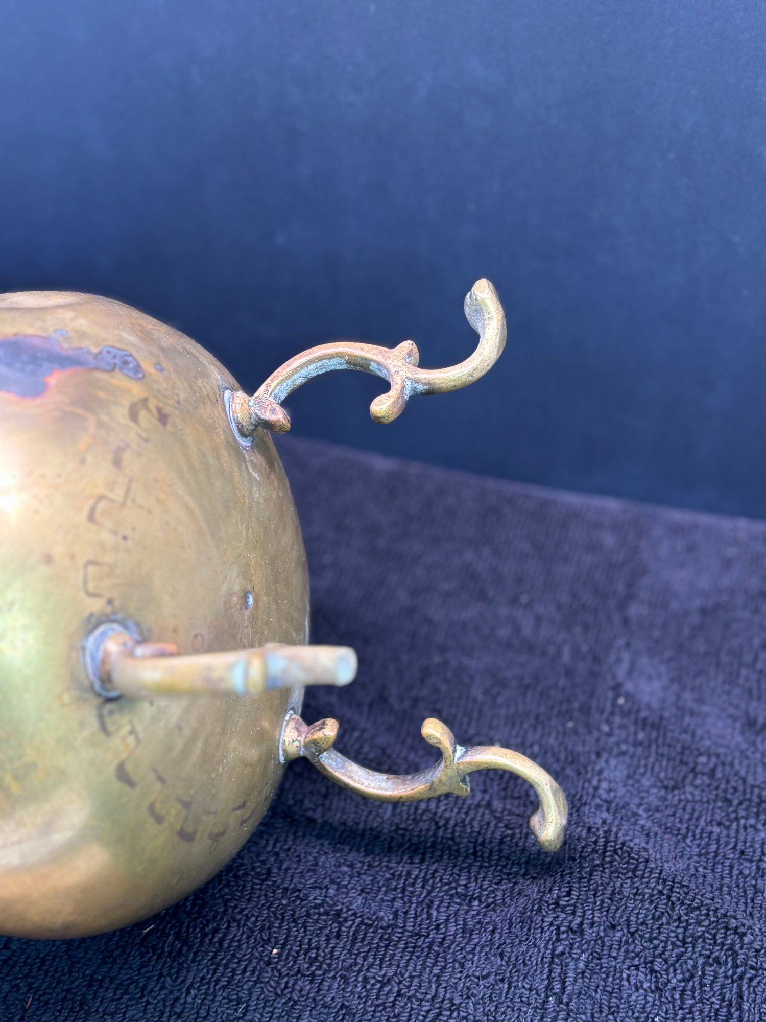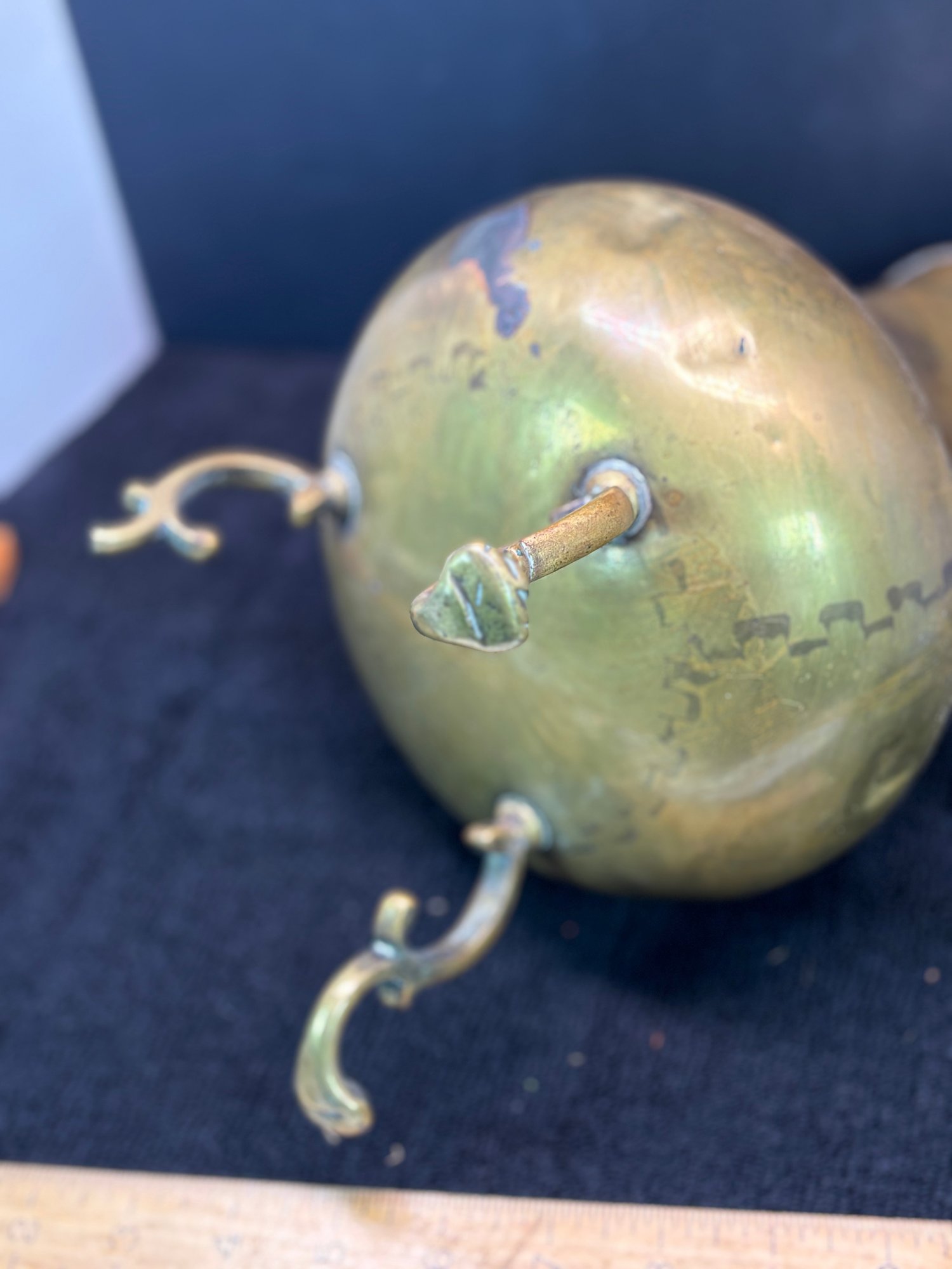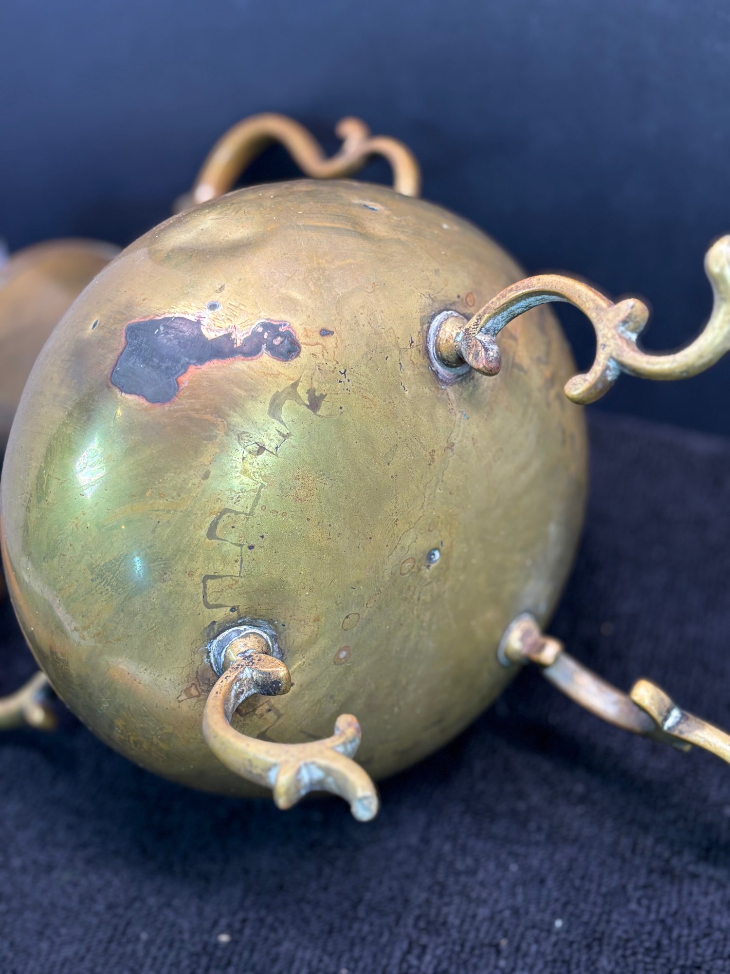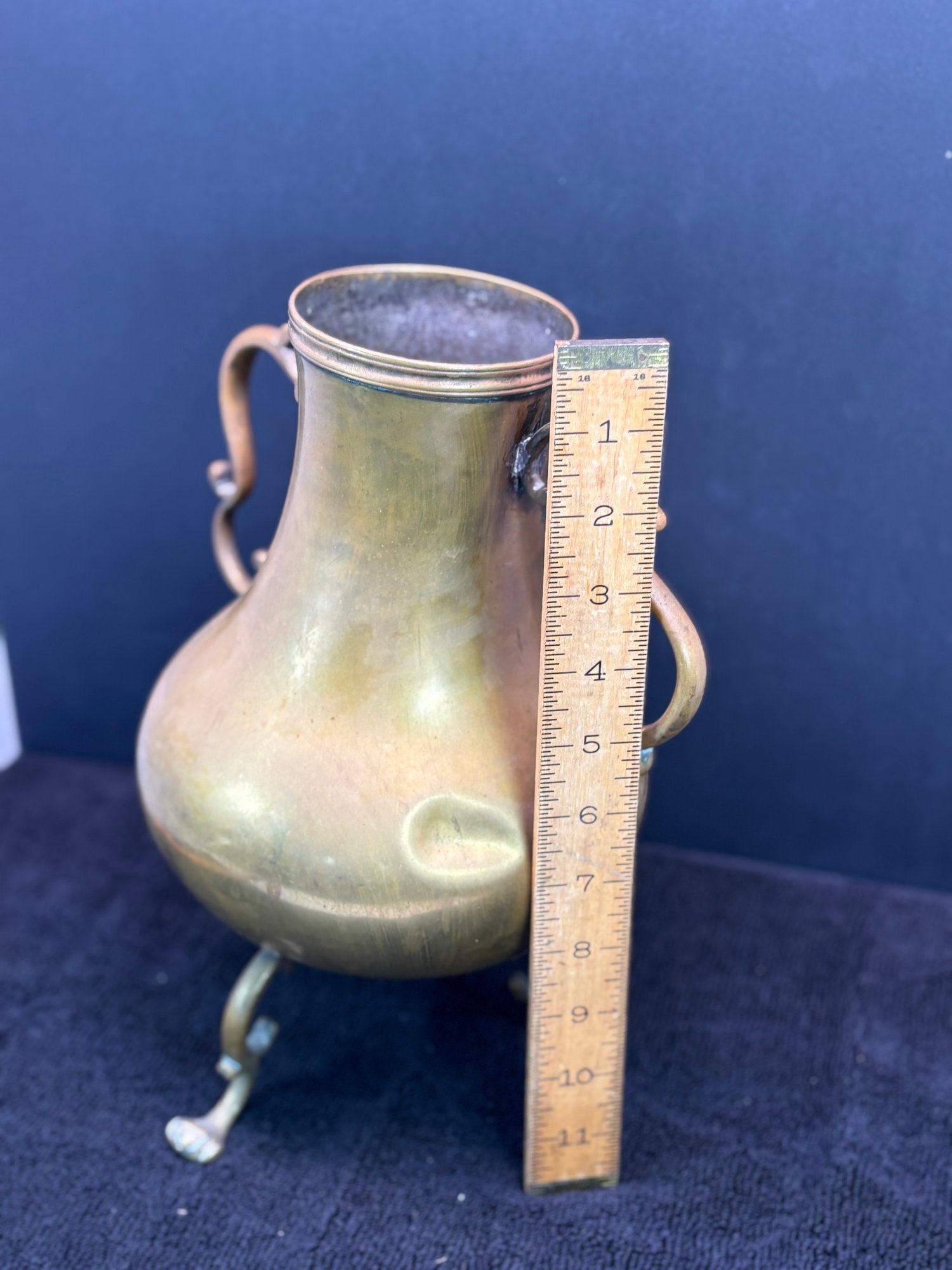 Antique, joined joints, a few dents and one broken foot which is missing about half an inch